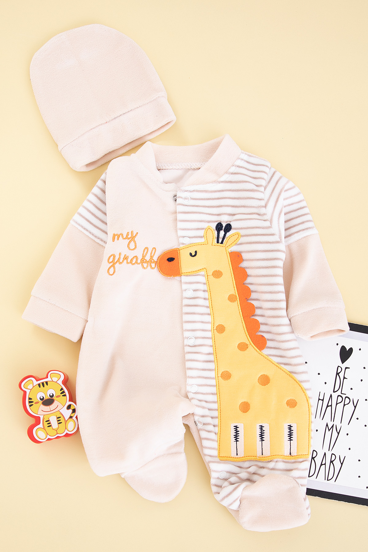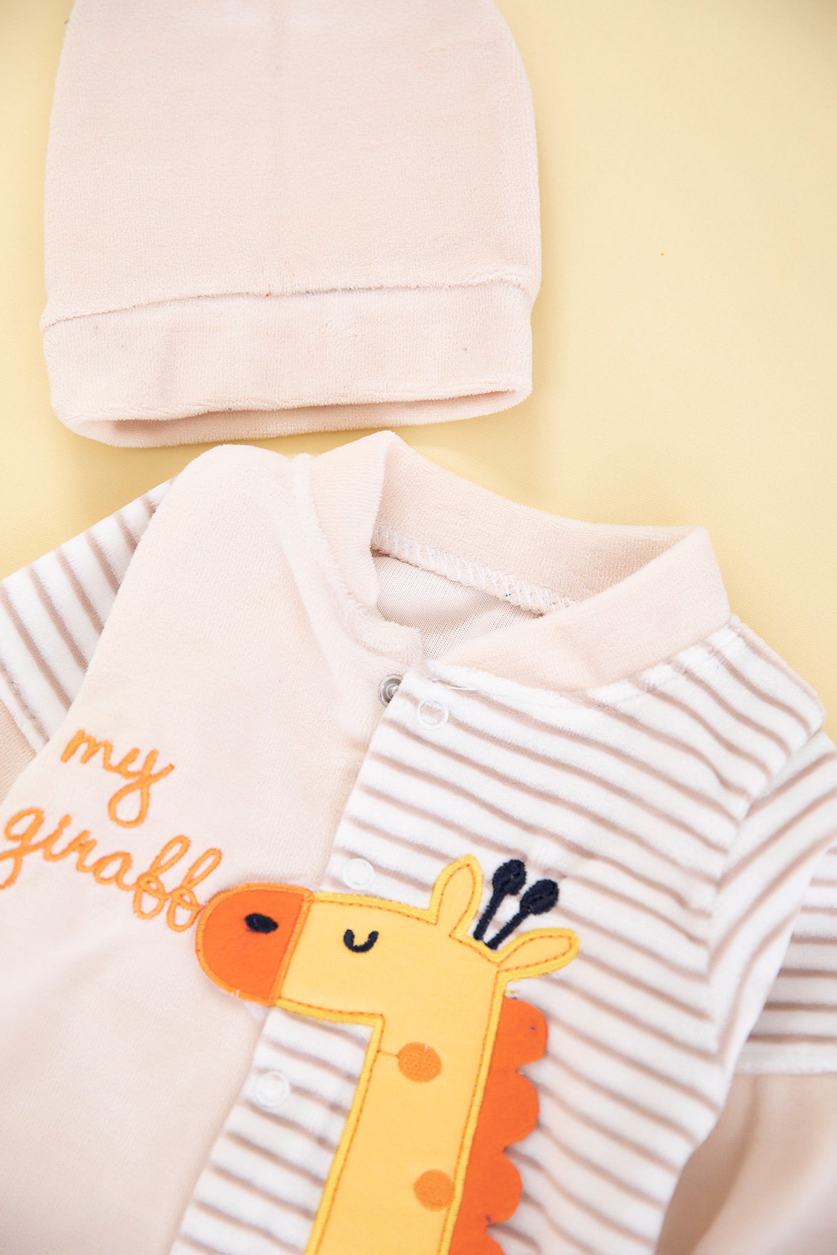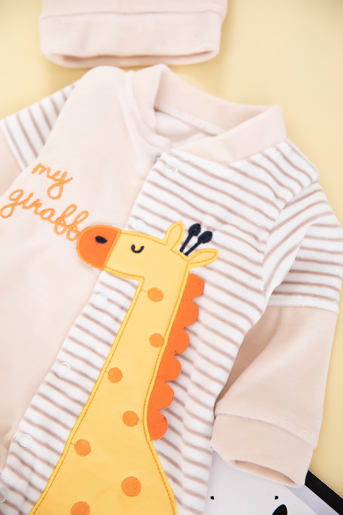 Bebek Çizgili Zürafa Nakışlı Kadife Tulum - 8275 (0-6 Ay)