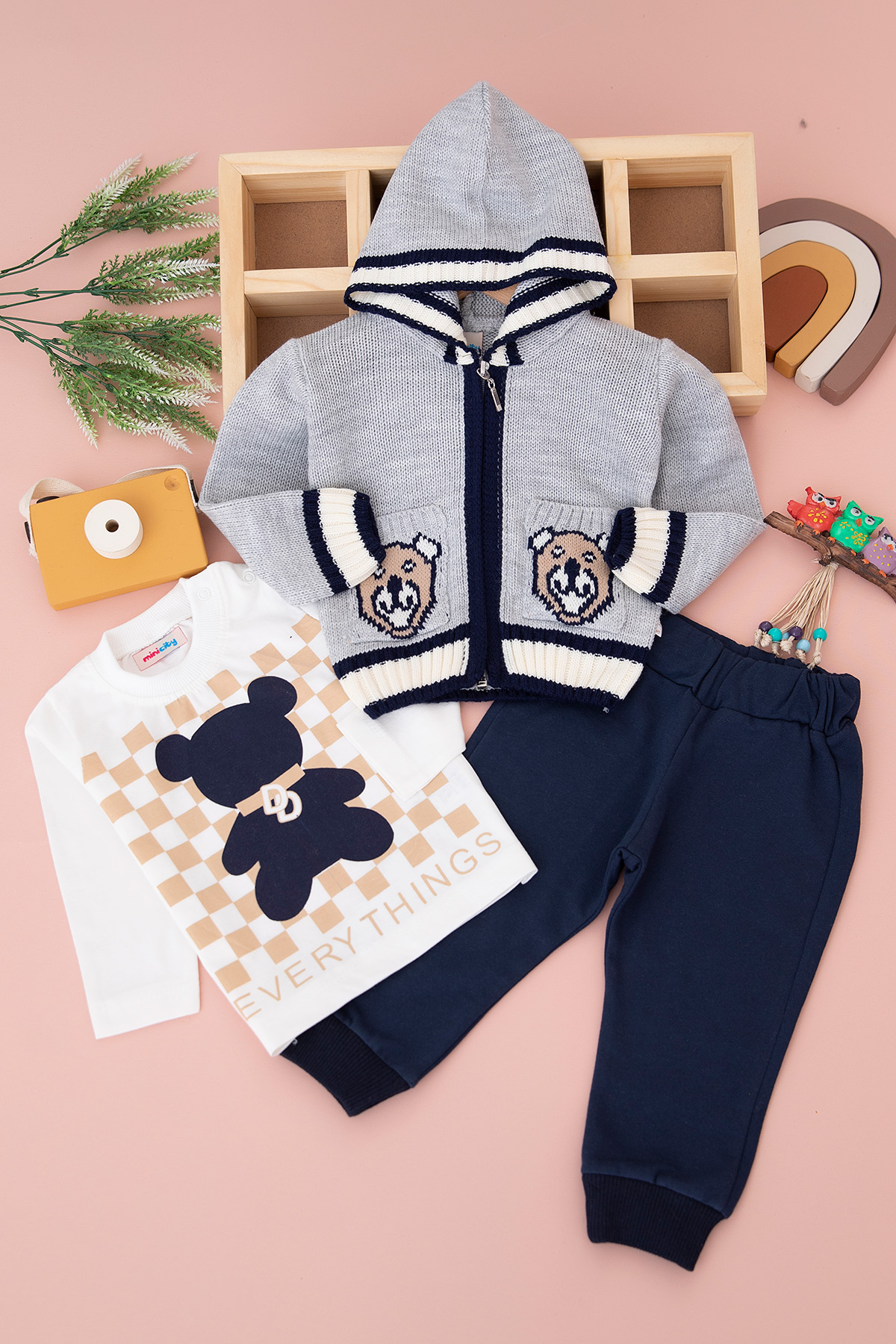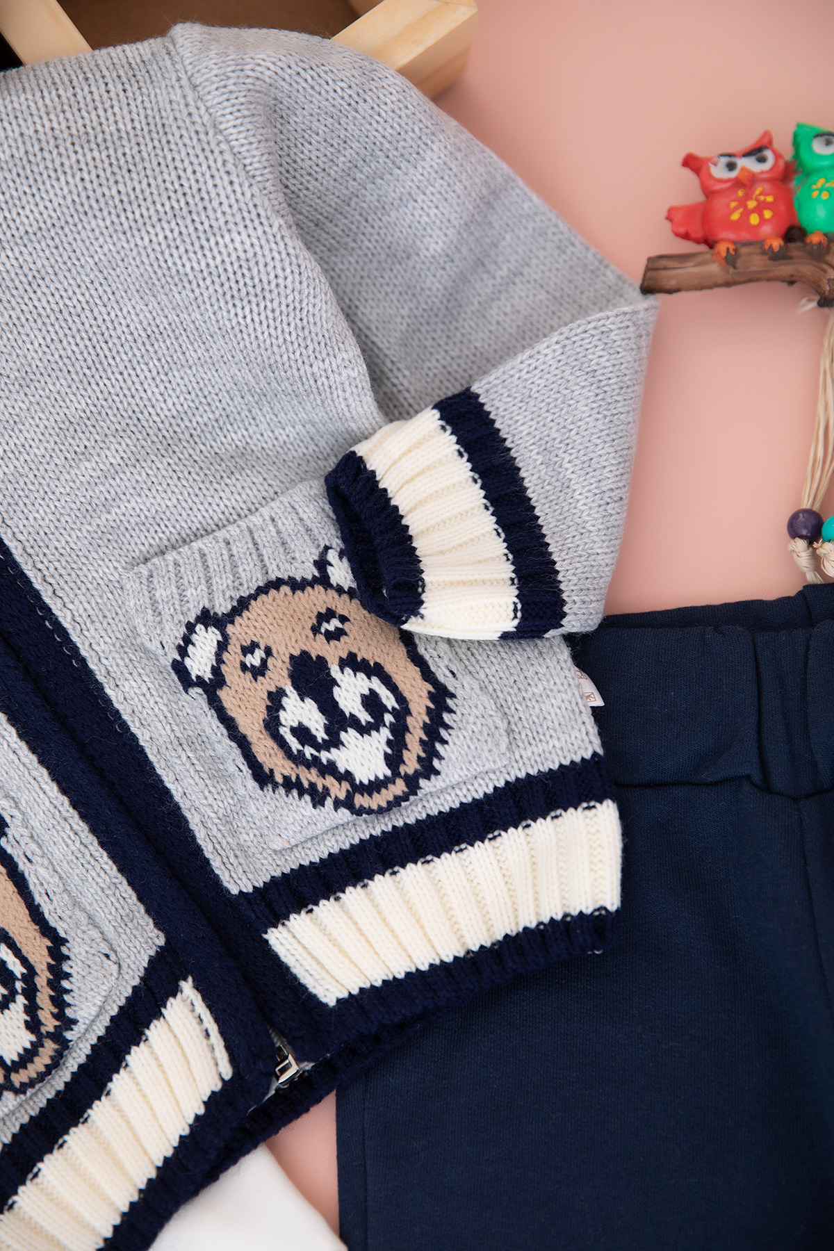 Erkek Bebek Ayı Örmeli 3`Lü Triko Takım - 13777 (6-24 Ay)