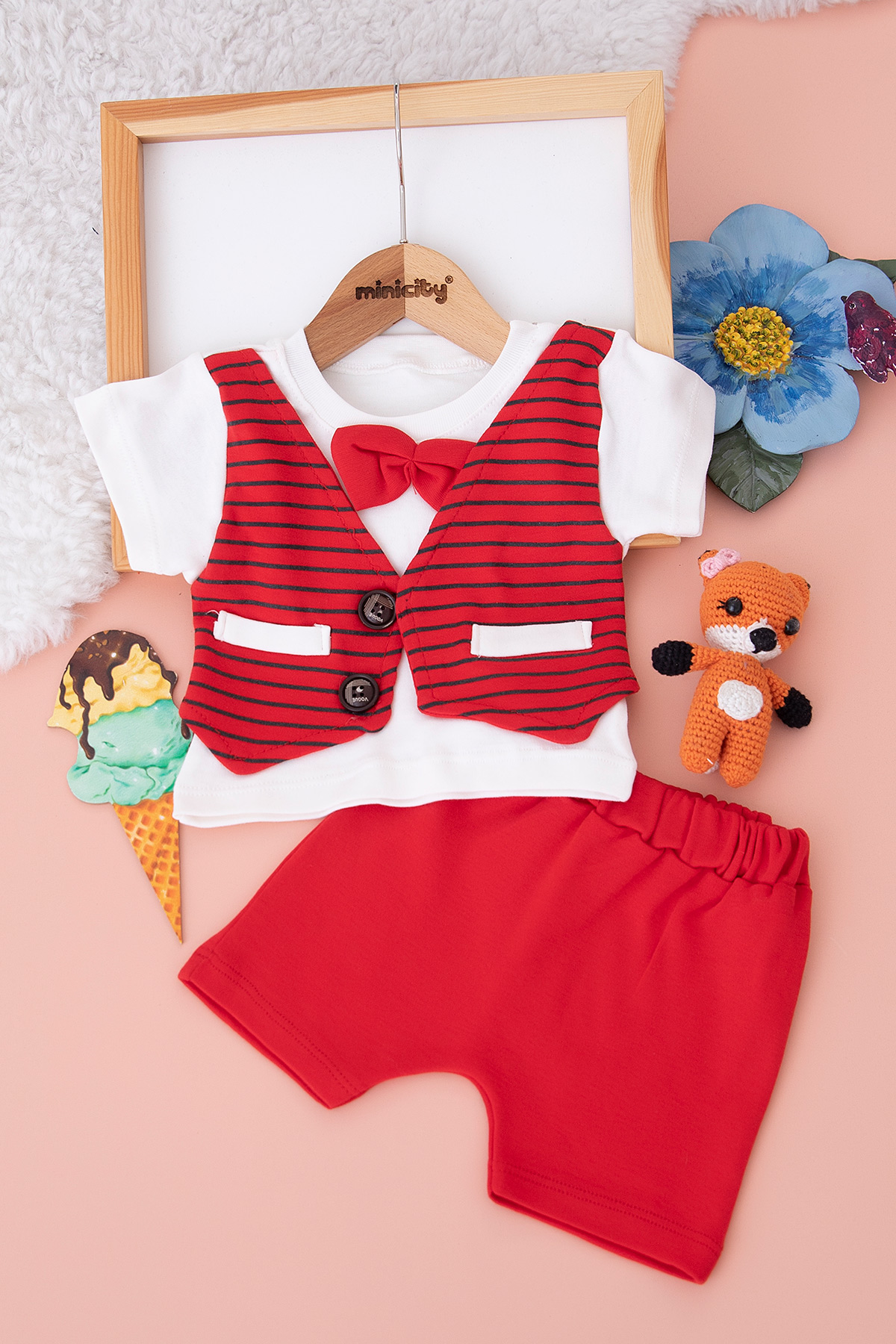 Erkek Bebek Çizgili Papyonlu Şortlu Takım - 3037 (3-18 Ay)
