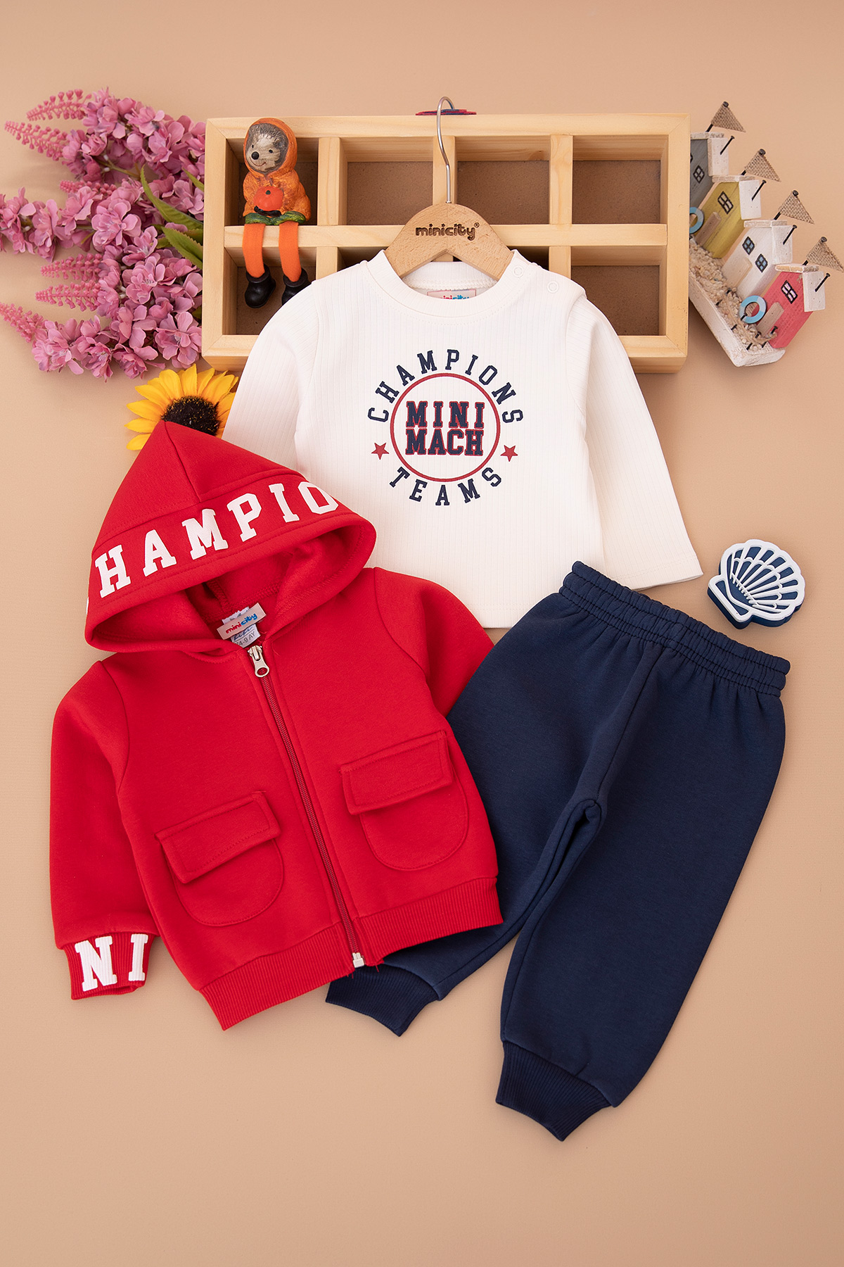 Erkek Bebek Kapşonlu Üçlü Üçip Takım - 25969 (9-24 Ay)