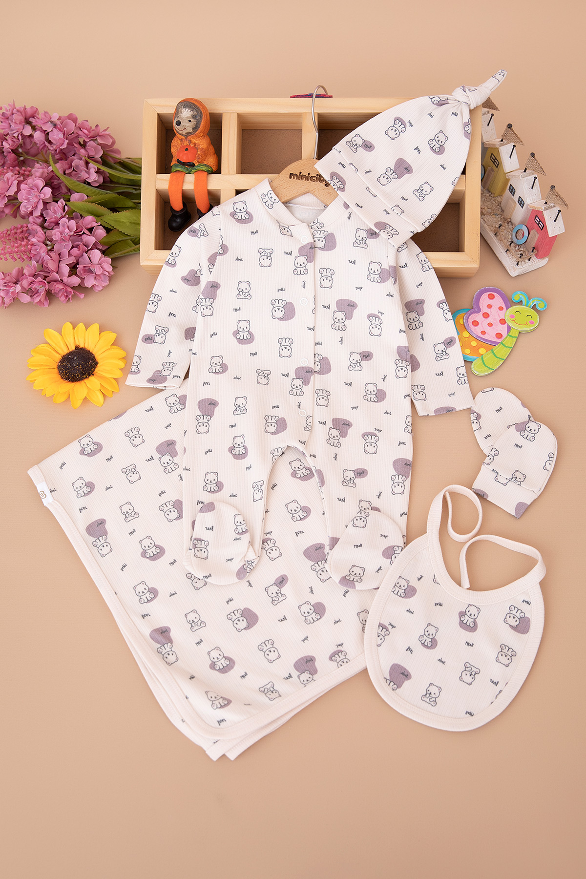 Erkek Bebek Oturan Ayı 5 Li Tulum Set - 6308 80-3 Ay)