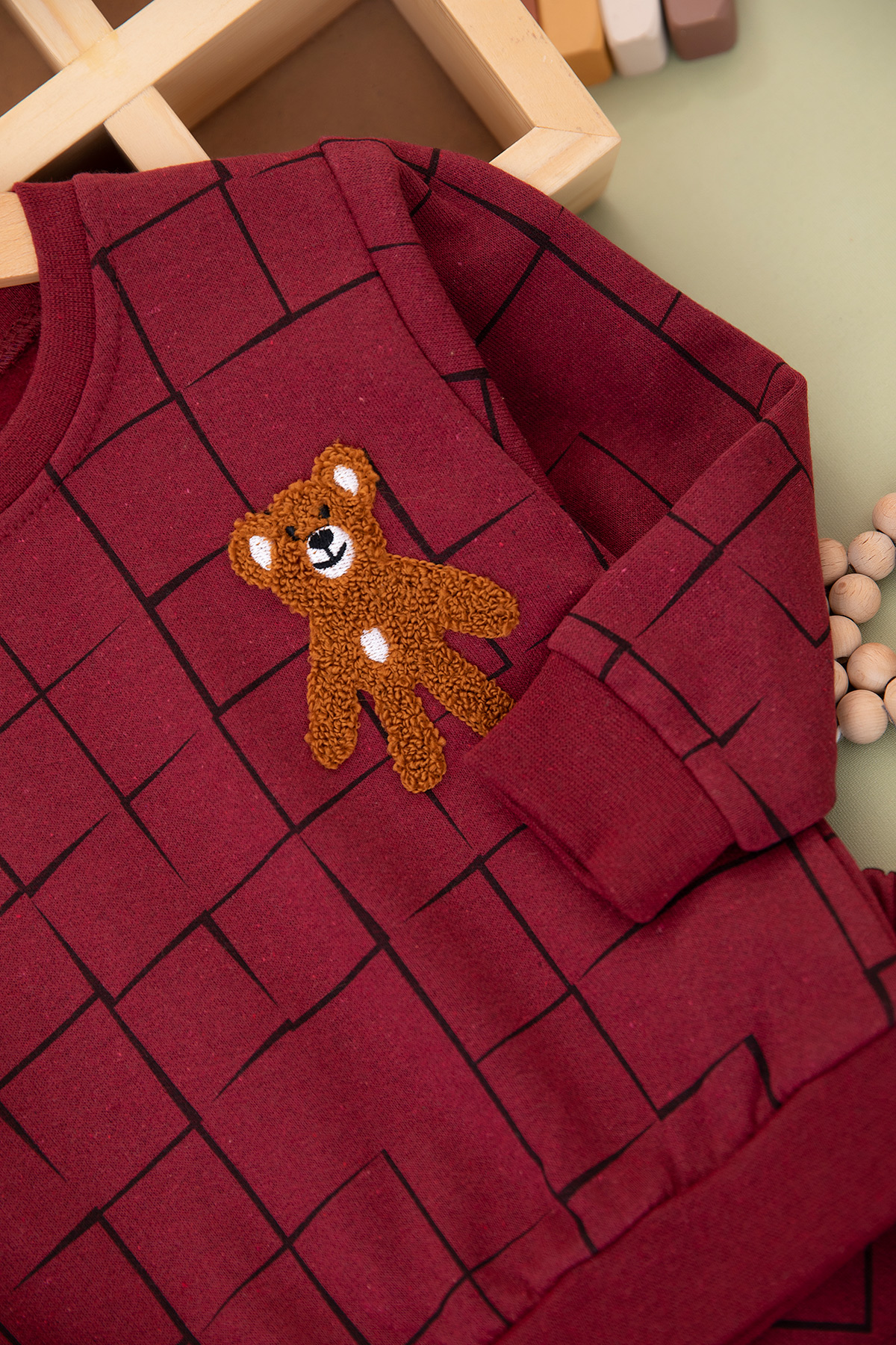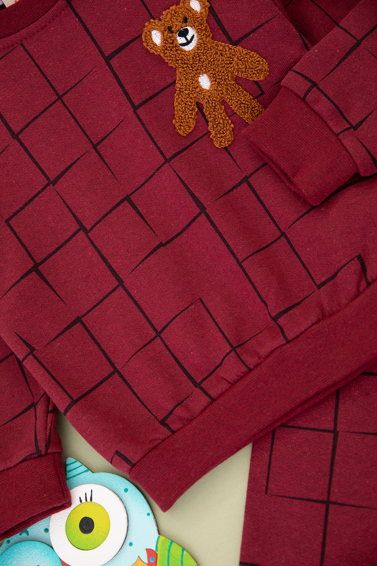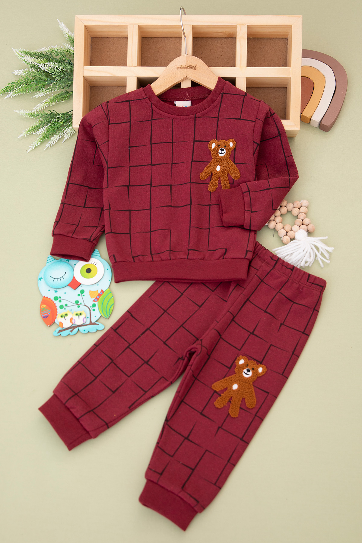 Erkek Çocuk Kareli Çizgili Ayıcıklı Şardonlu Takım (2-5 Yaş)