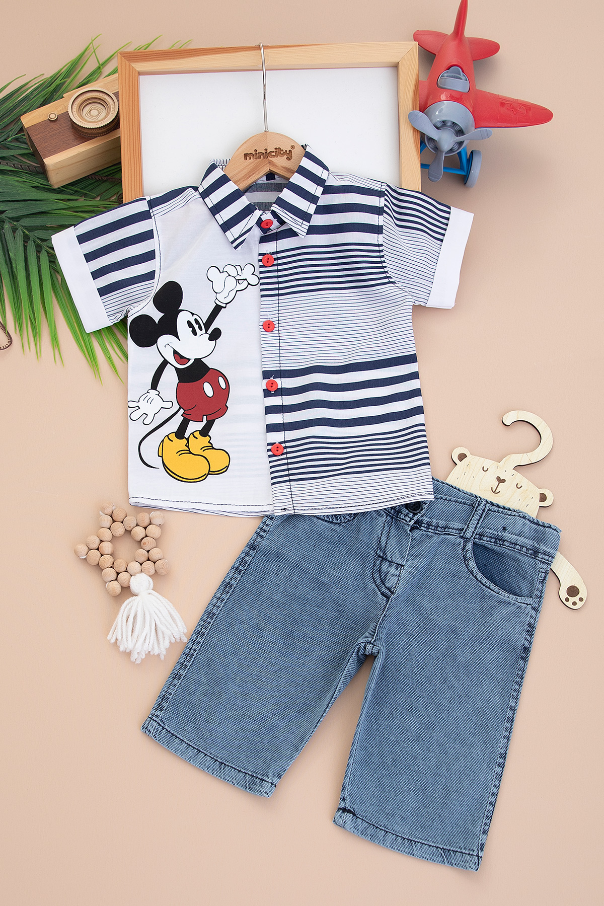 Erkek Çocuk Tavşan Baskılı Gömlek Kot Kaprili Takım (1-4 Yaş)