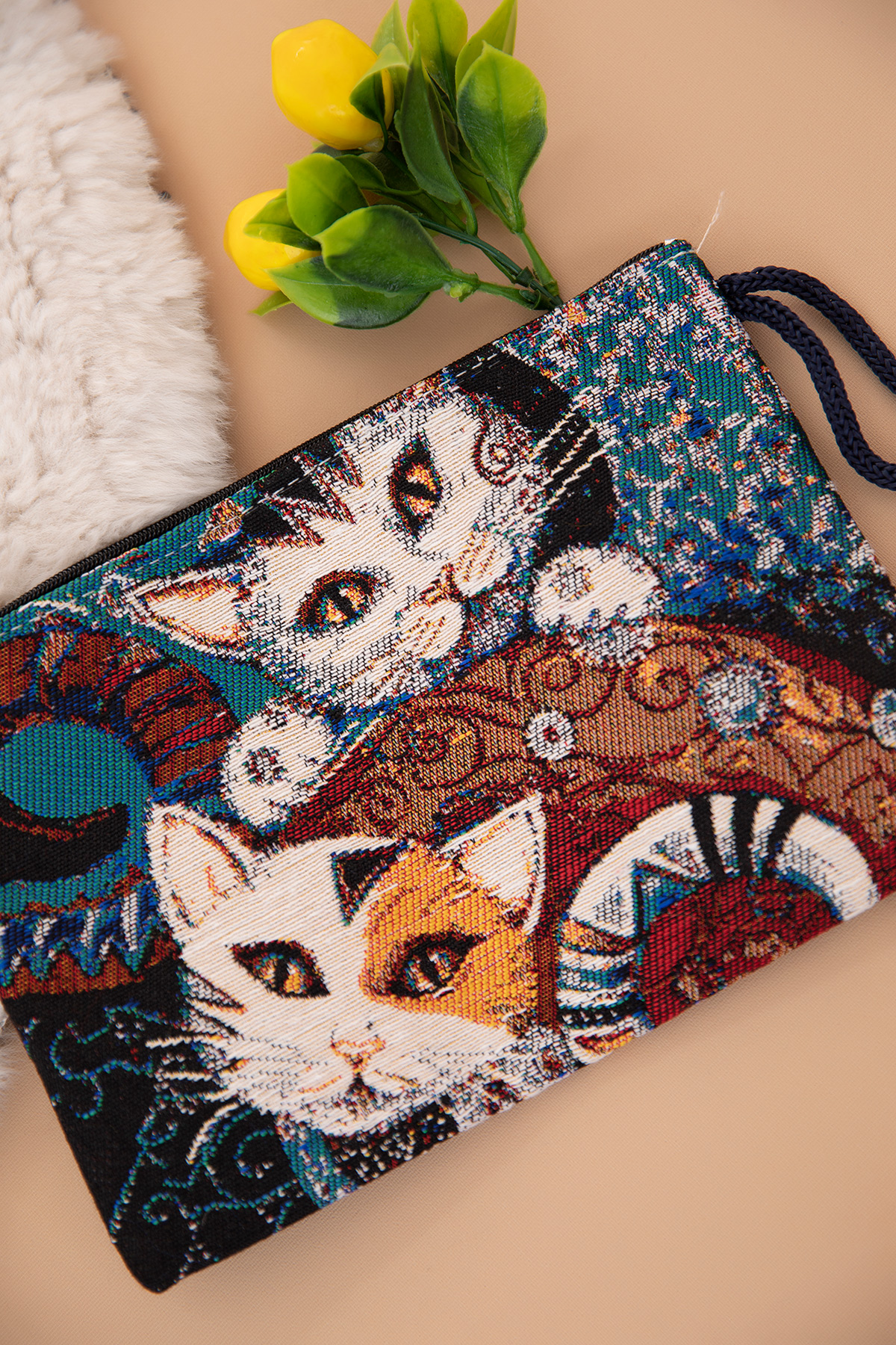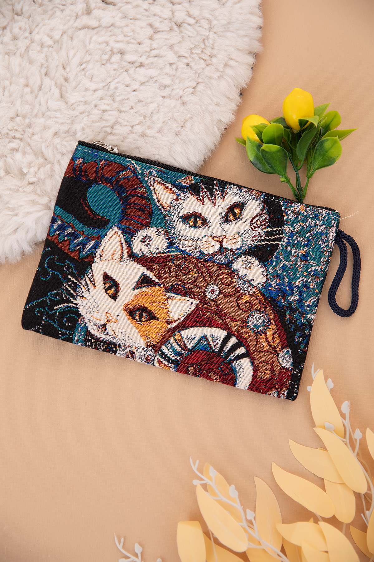 Etnik Kedi Desenli El Cüzdanı
