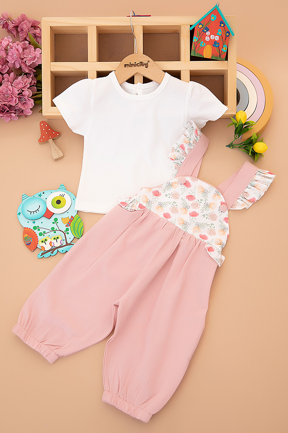 Kız Bebek Baskılı Keten Tulum Salopet - 3177 (9-24 Ay)