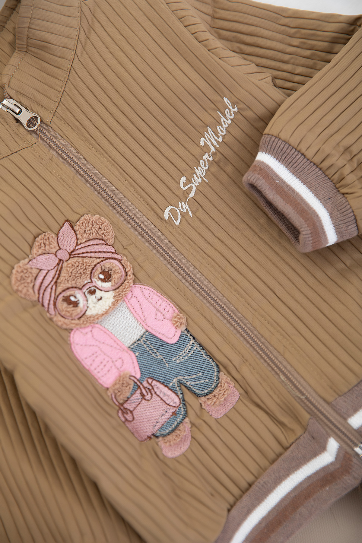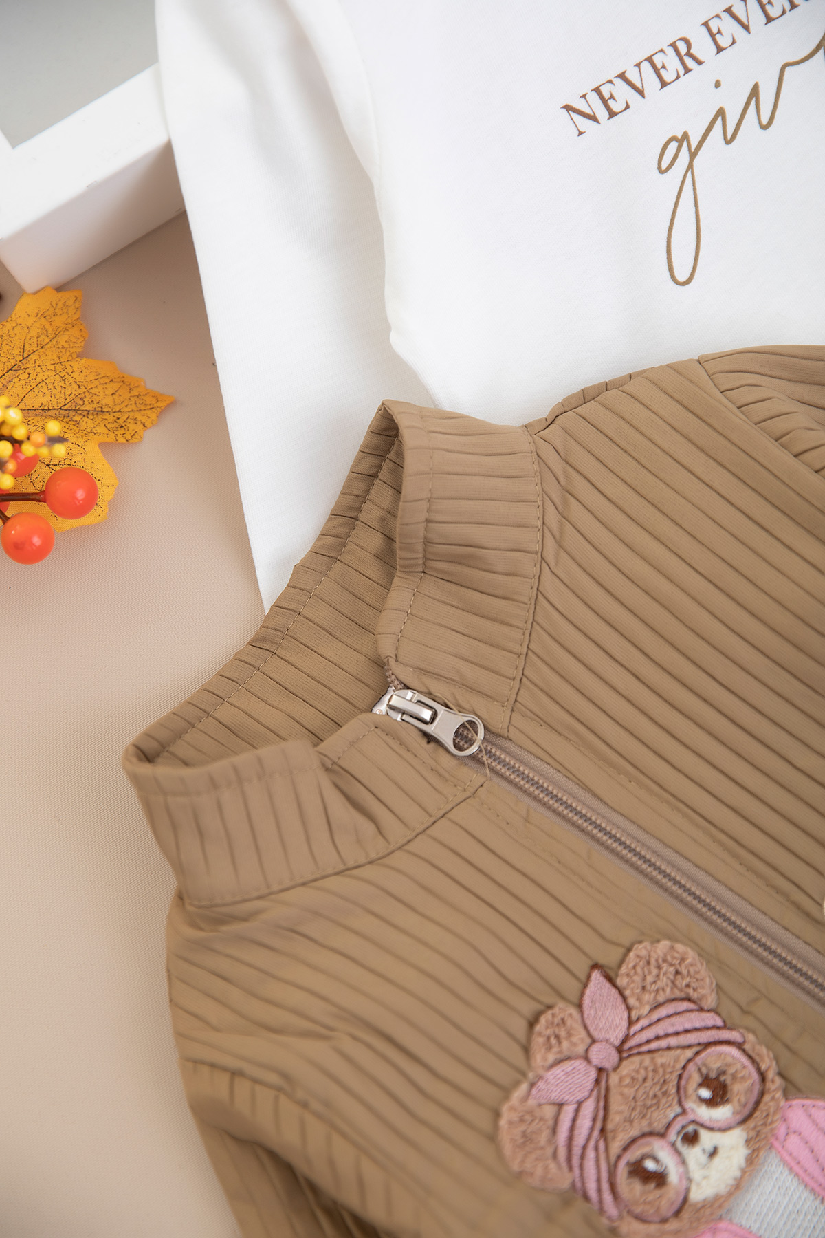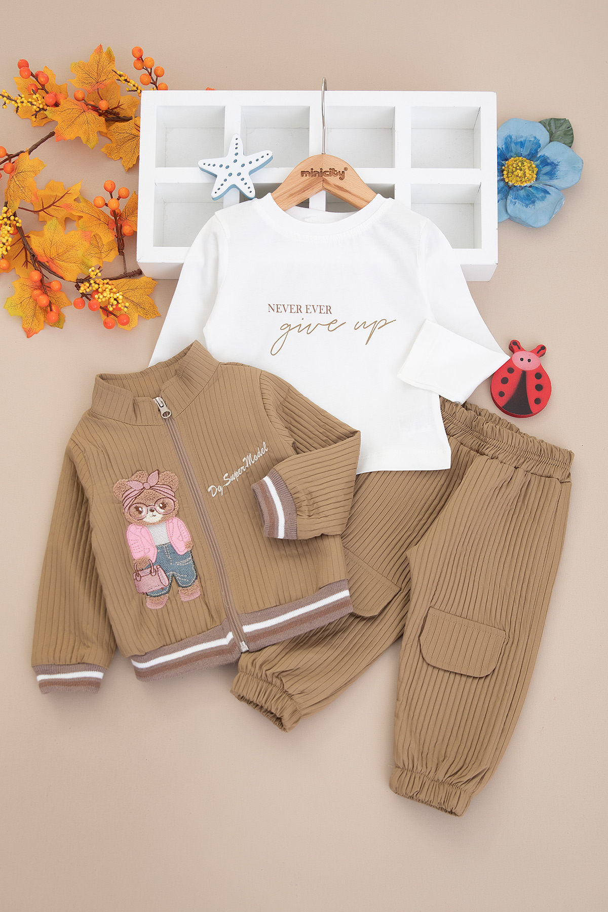 Kız Bebek Çantalı Ayı Nakışlı Üçlü Takım - 50703 (6-24 Ay)