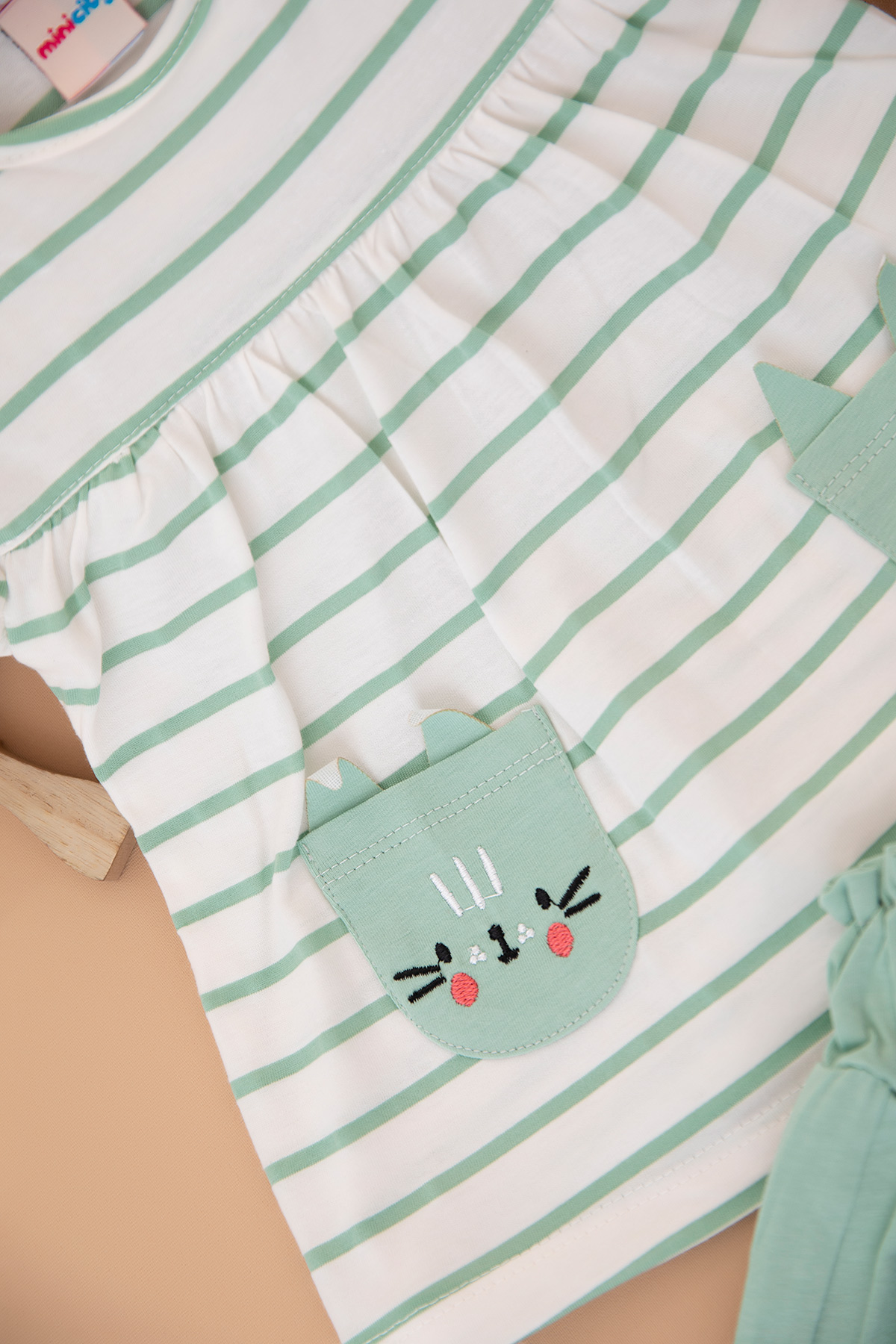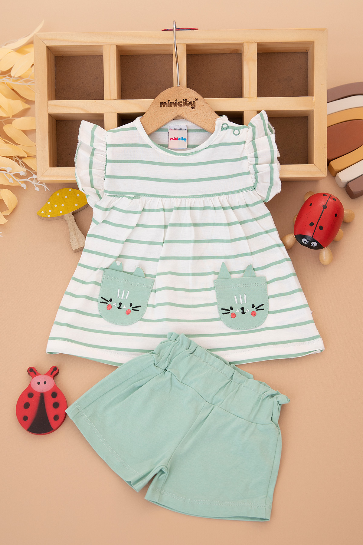 Kız Bebek Cebi Kedi Nakışlı Şortlu Takım - 25398 (9-24 Ay)