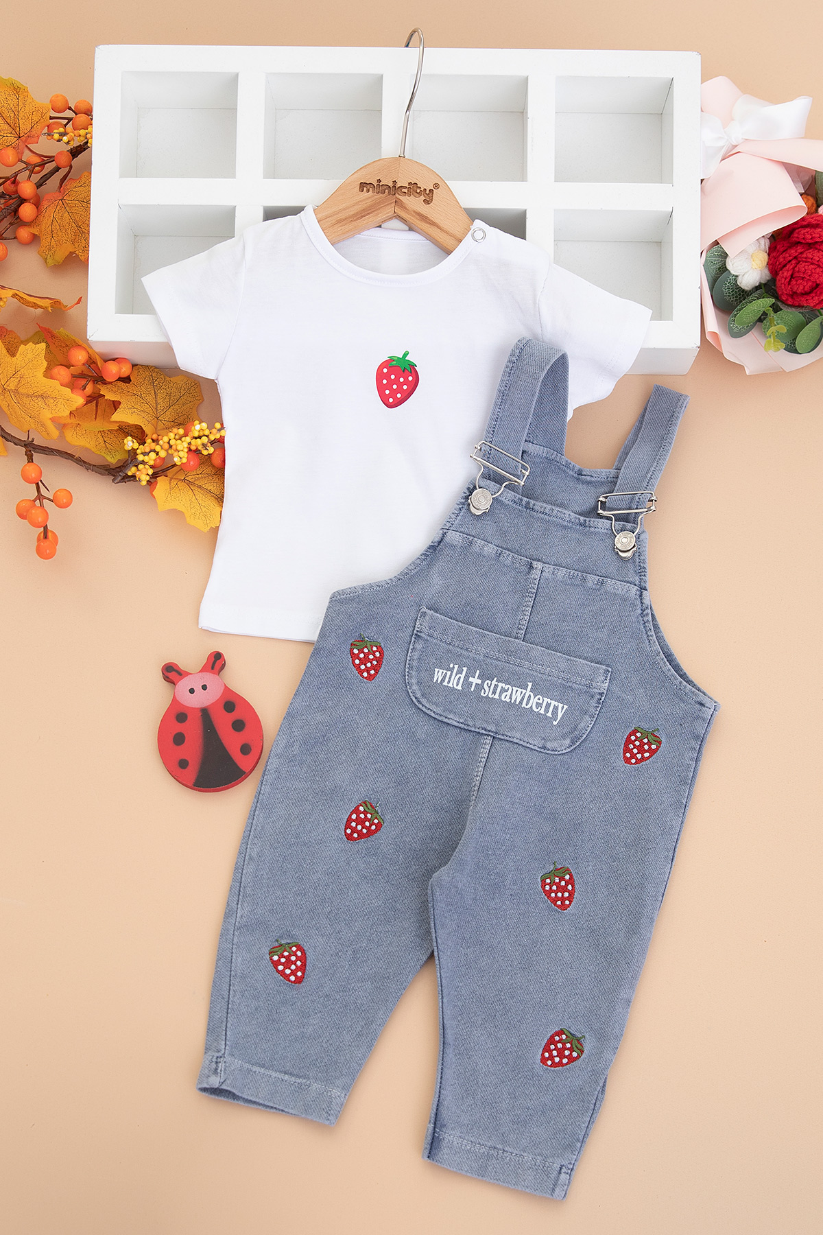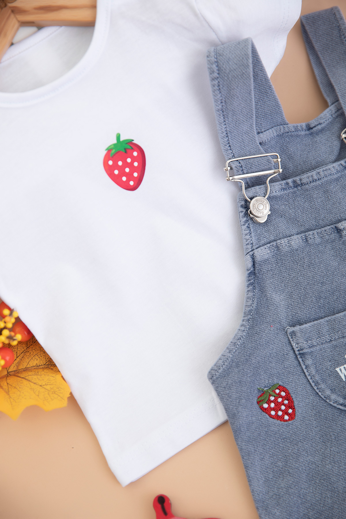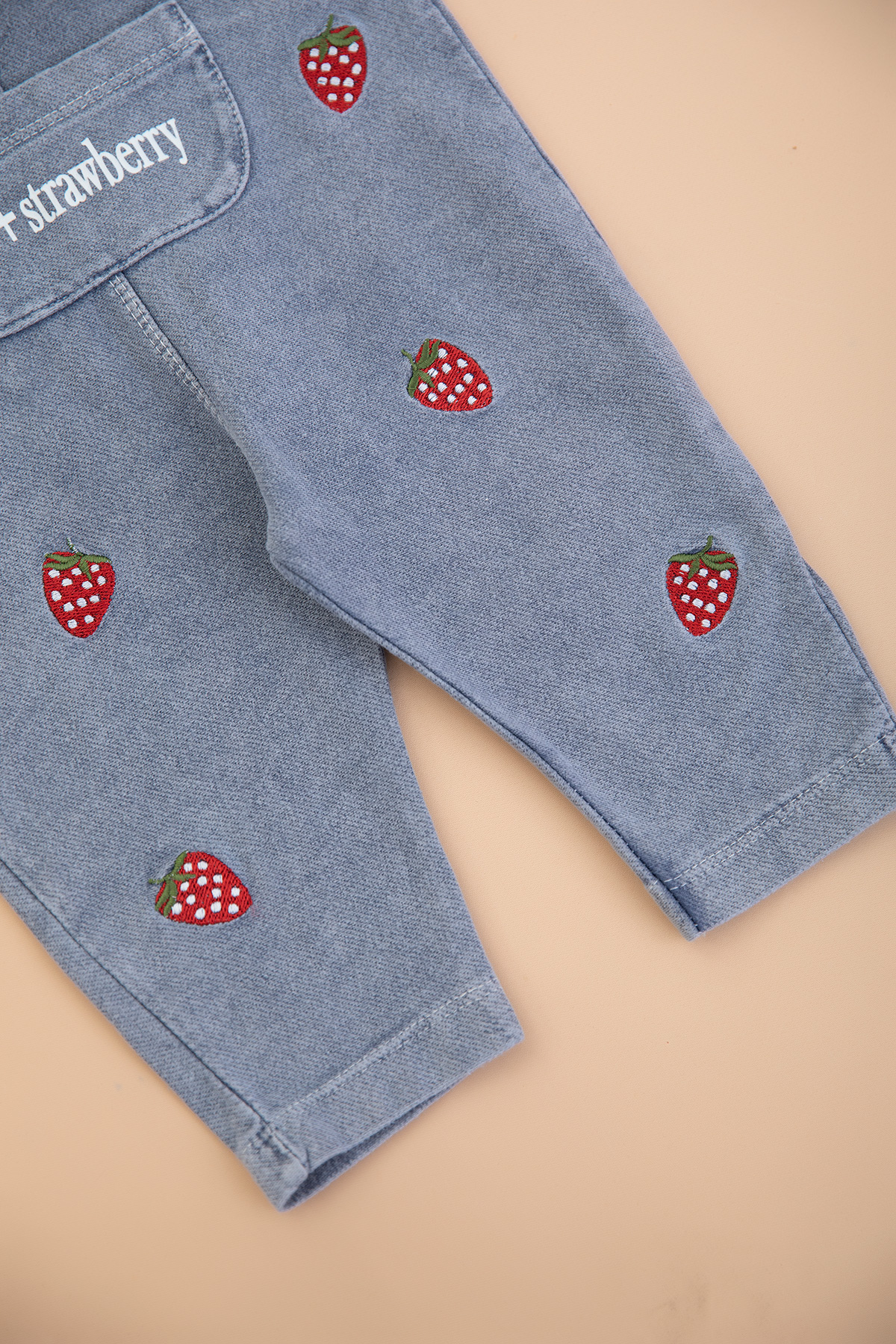 Kız Bebek Çilek Nakışlı Badili Kot Salopet - 0370 (9-24 Ay)