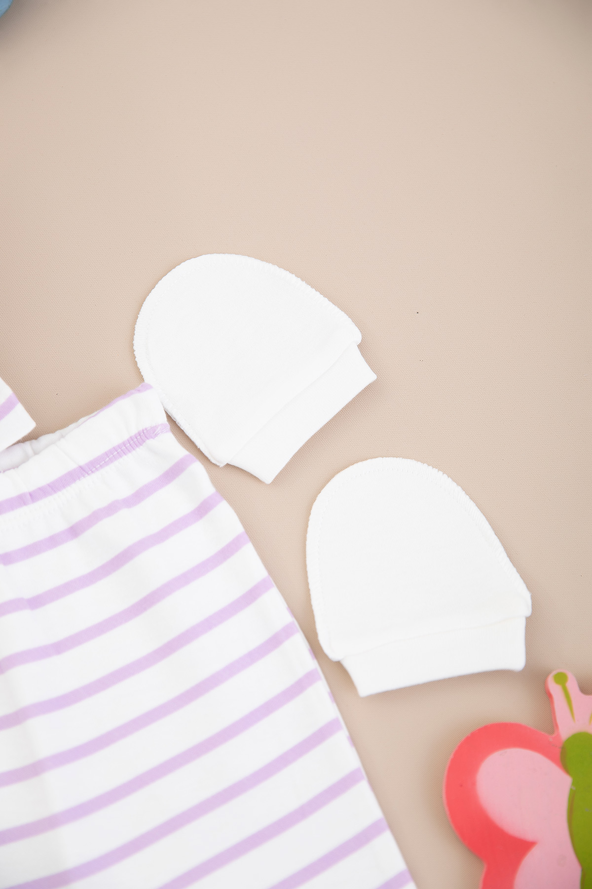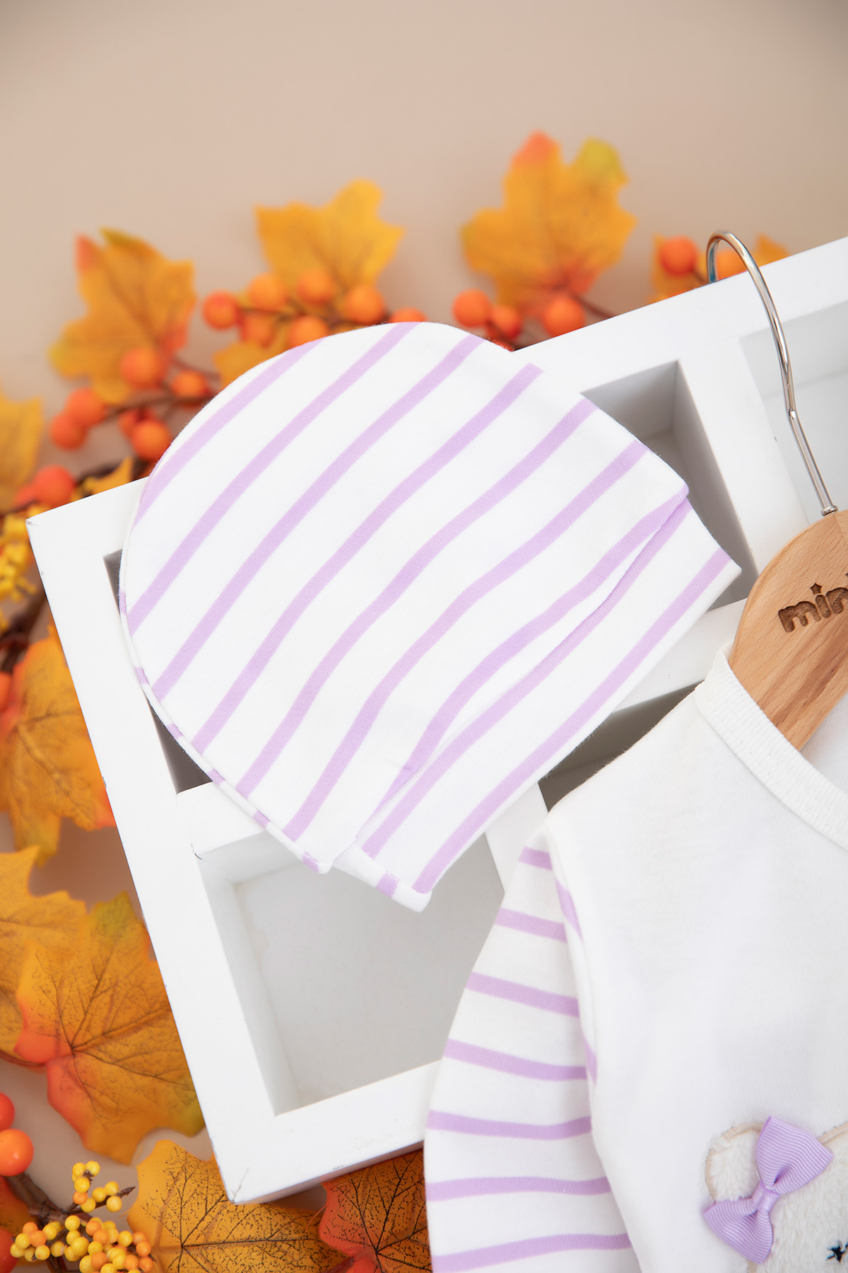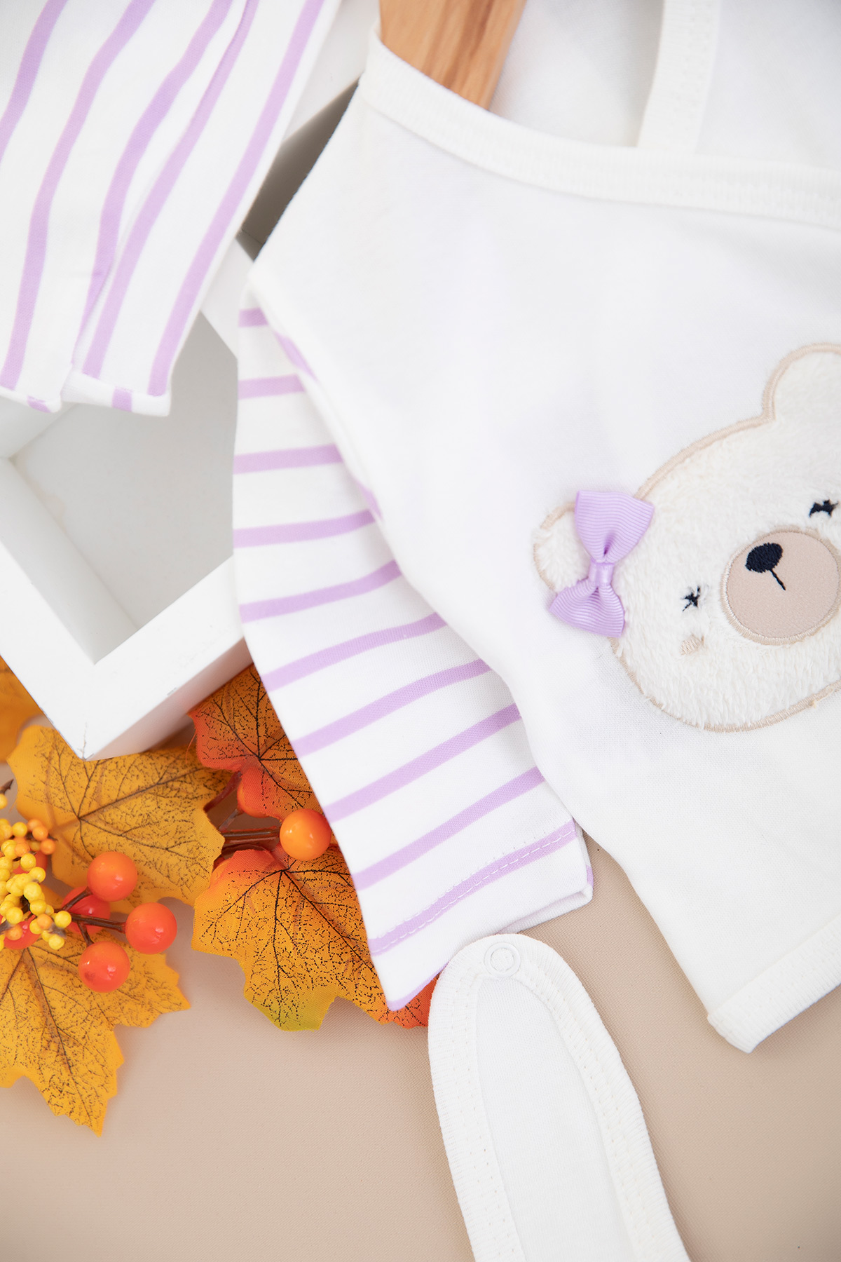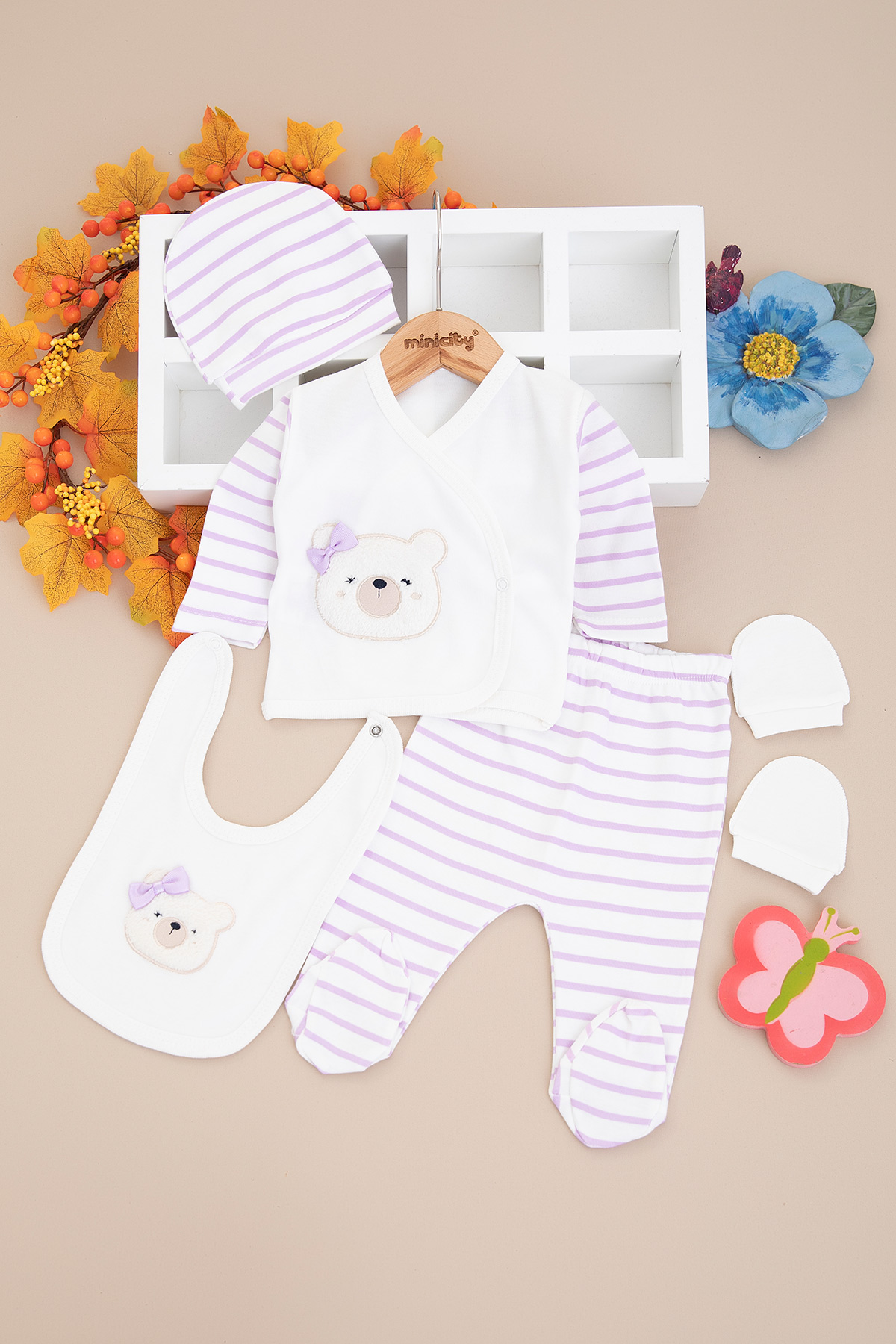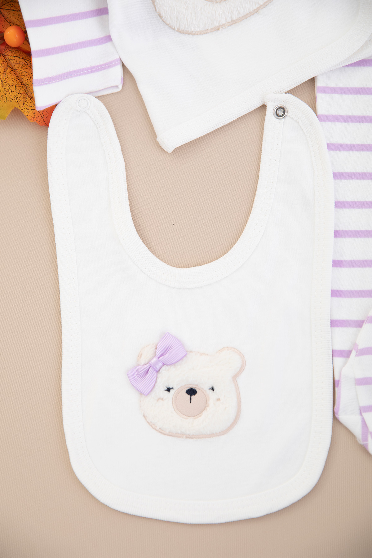 Kız Bebek Çizgili Ayı Kafa Nakışlı 5`Li Zıbın Seti