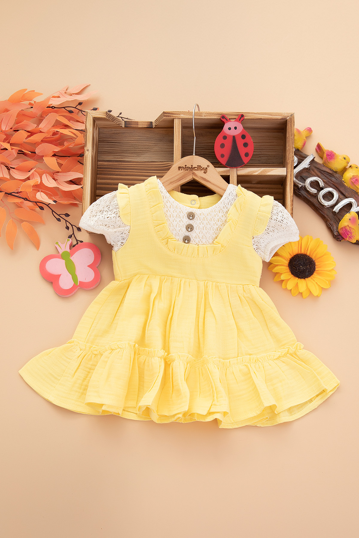 Kız Bebek Dantel Kol Düğmeli Elbise - 1655 (9-24 Ay)