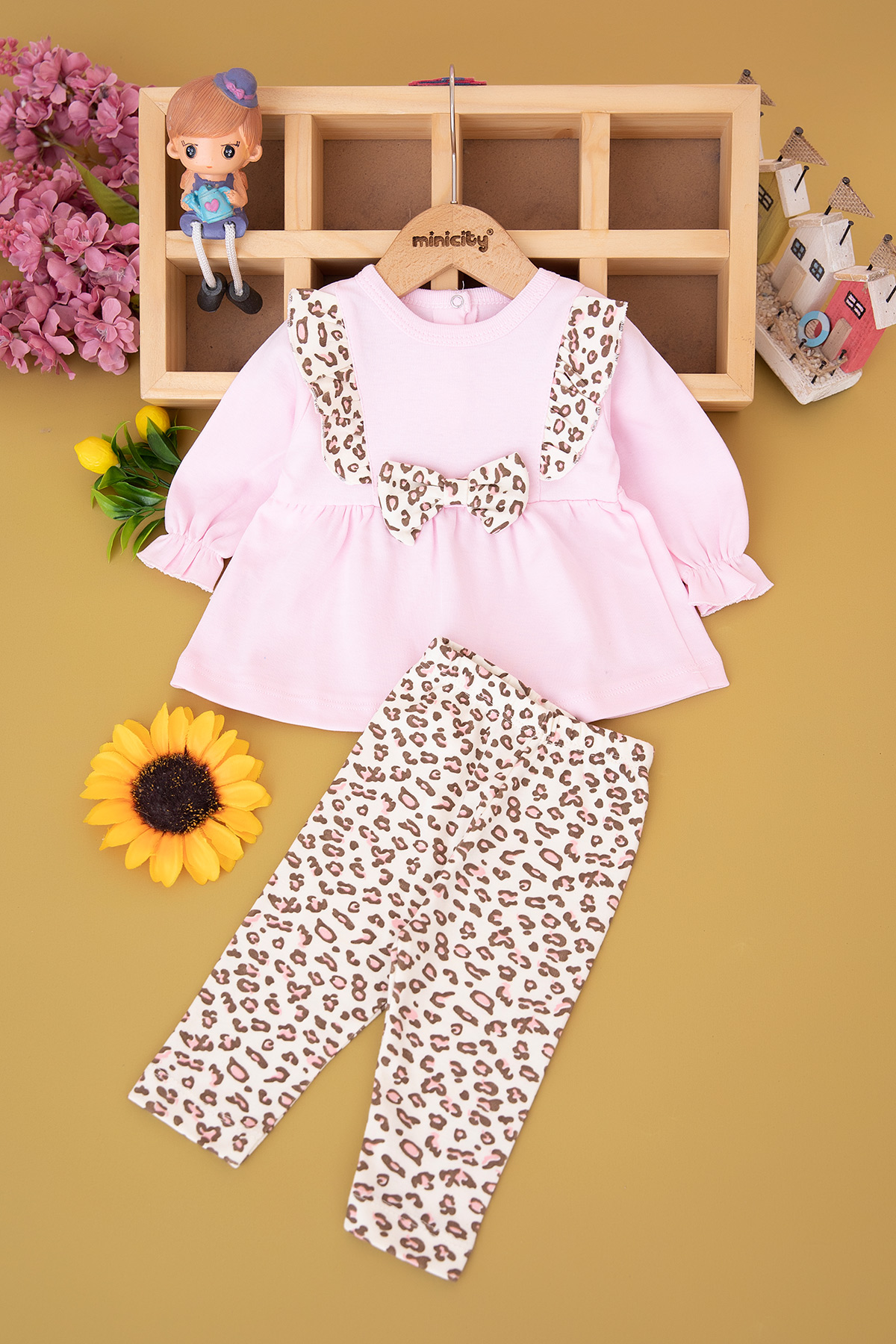 Kız Bebek Fiyonklu Leopar Baskılı Takım - 2123 (3-12 Ay)