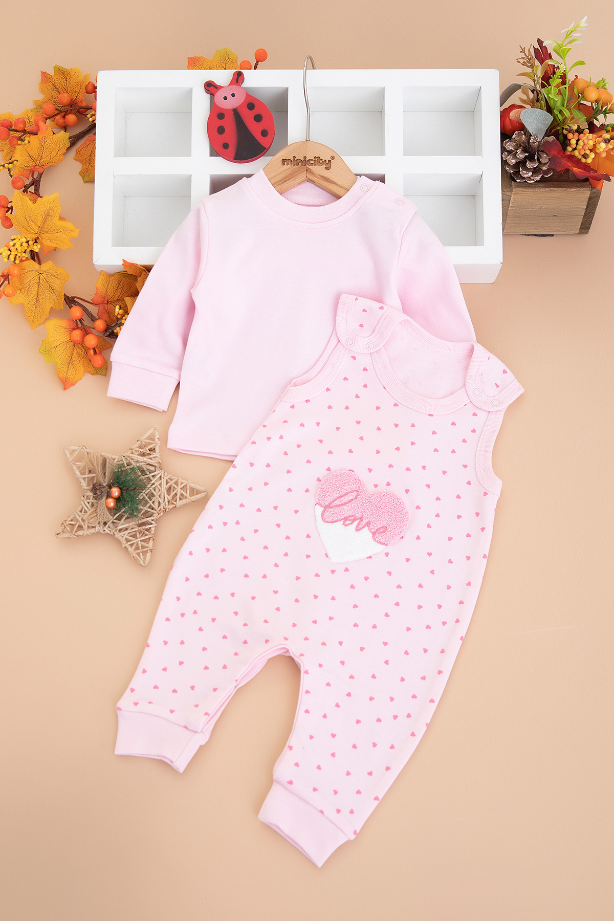 Kız Bebek Minik Kalp Baskılı Salopet Takım - 3008 (3-12 Ay)