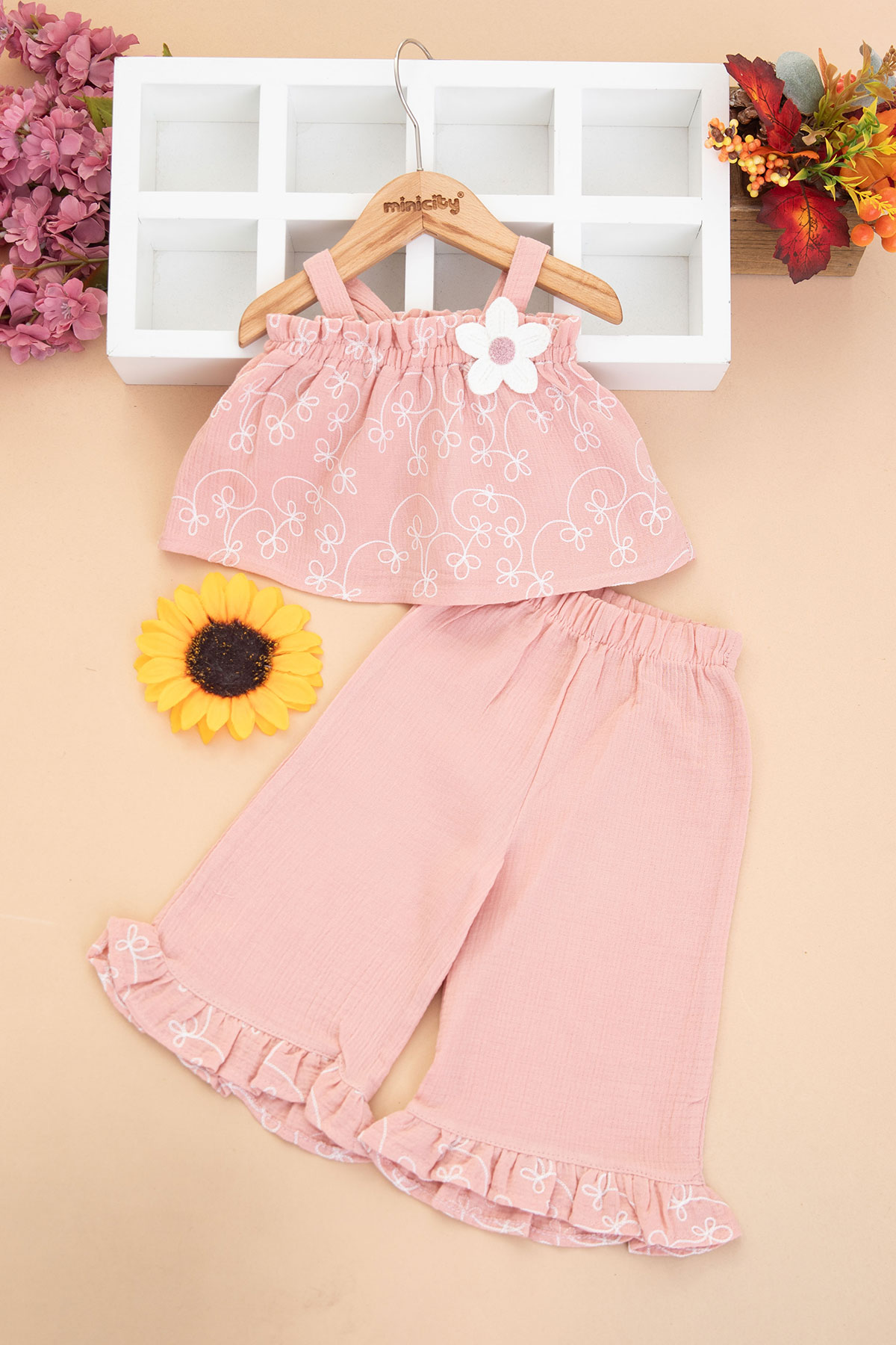 Kız Bebek Süzene İşlemeli Pantolonlu Müslin Takım - 3258 (9-24 Ay)