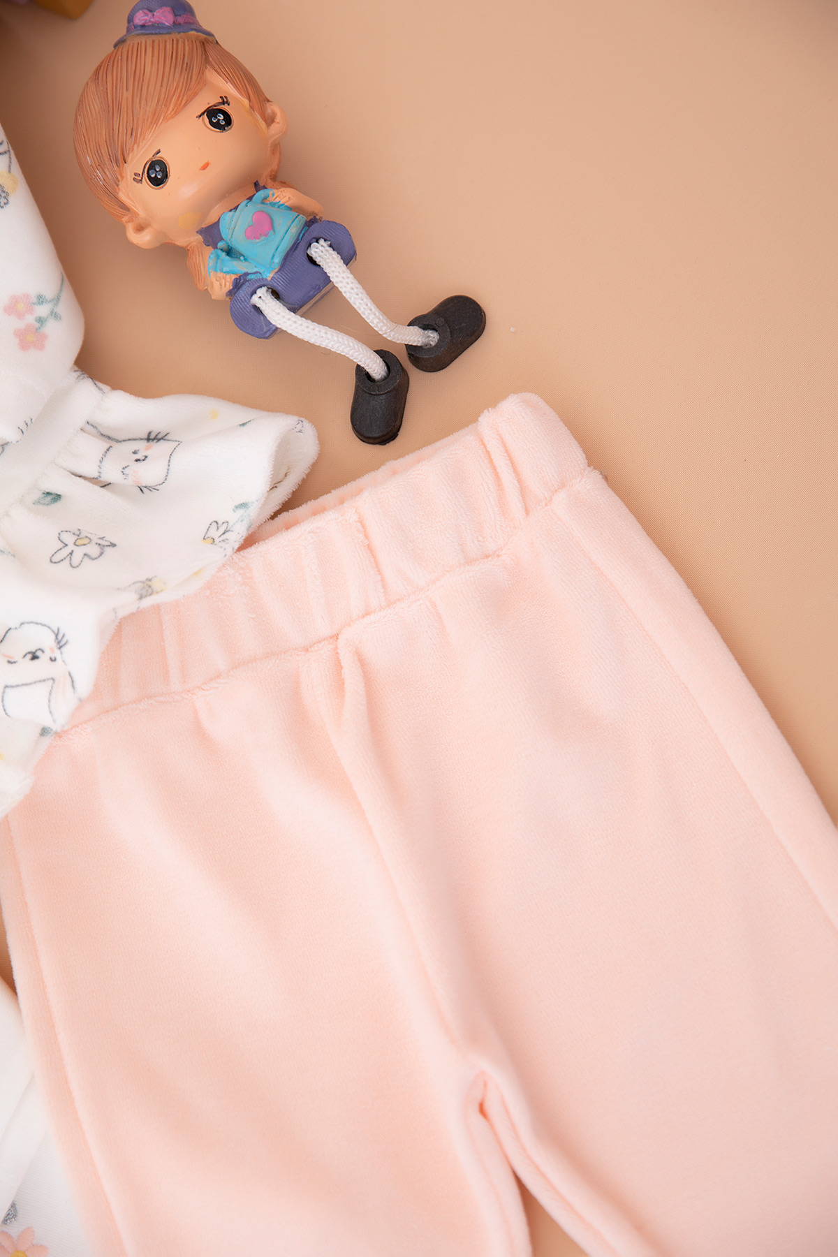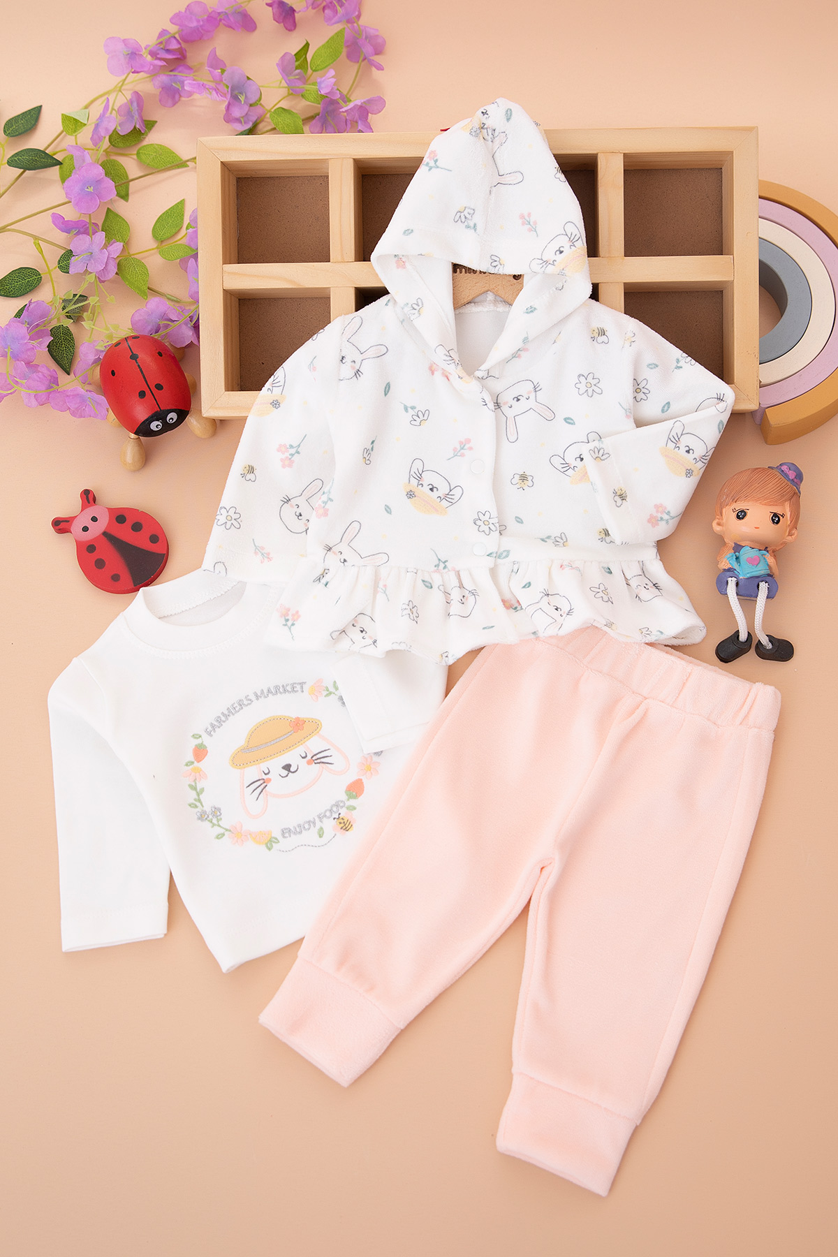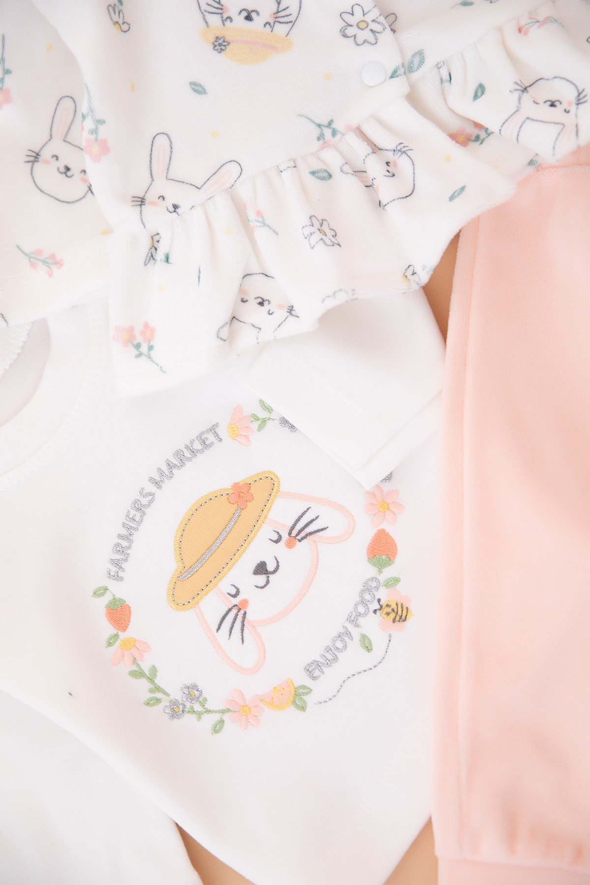 Kız Bebek Tavşan Nakışlı Kadife Üçlü Takım - 7123 (3-12 Ay)