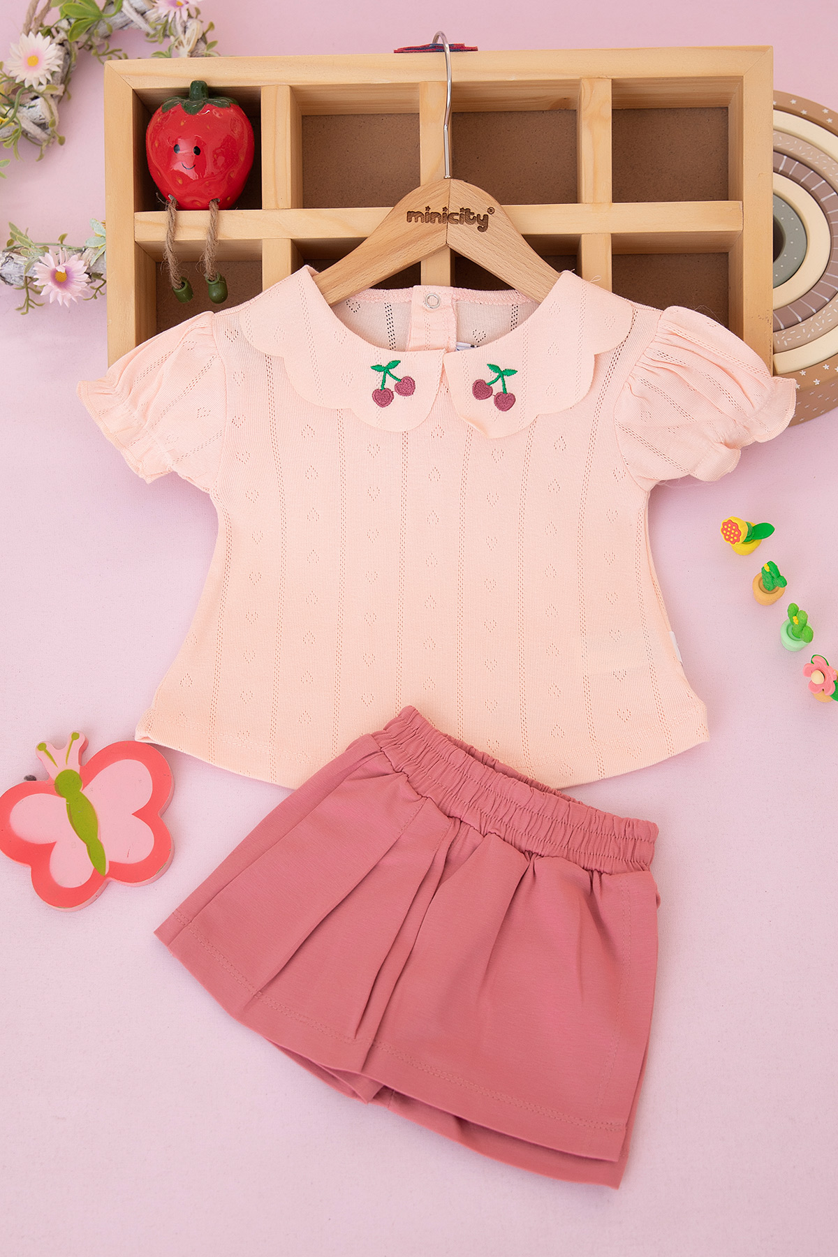 Kız Bebek Yakası Kiraz Nakışlı Şortlu Takım - 26338 (9-24 Ay)
