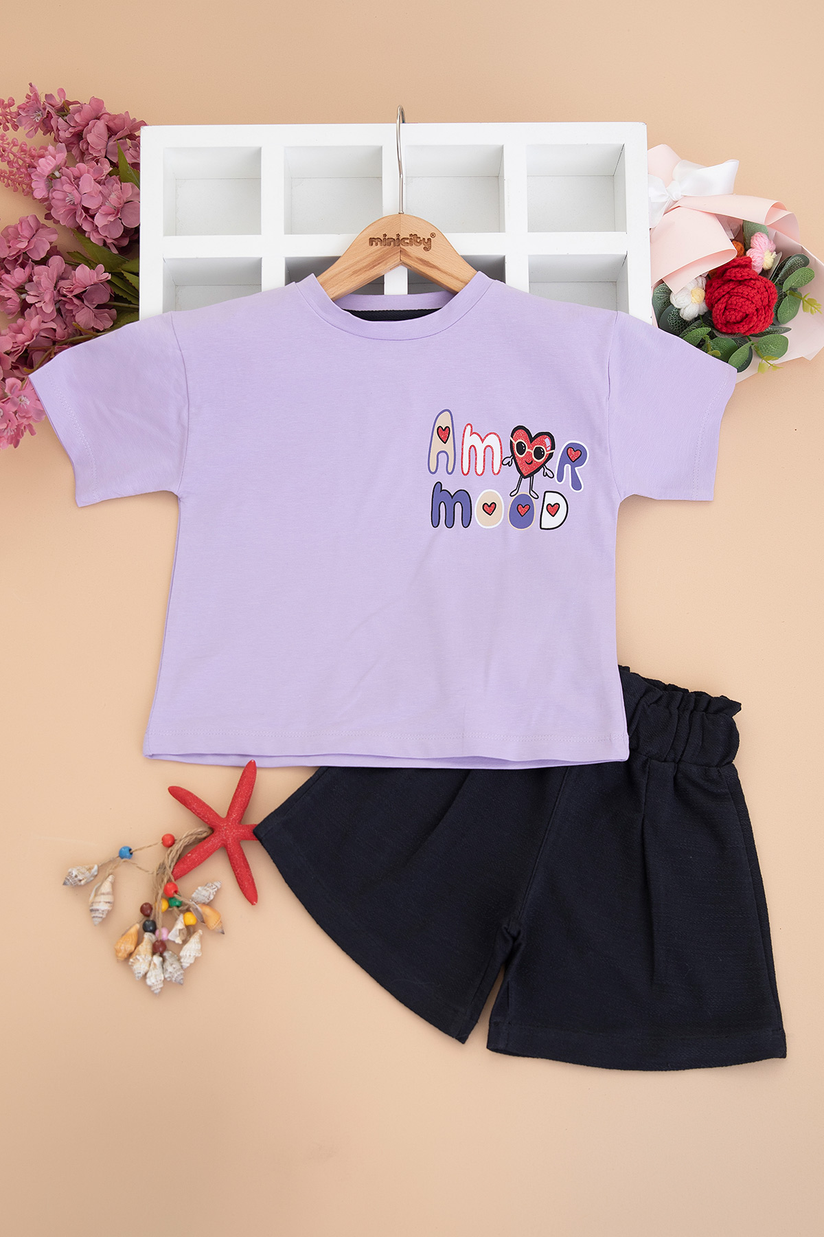 Kız Çocuk Amor Mood Baskılı Şortlu Takım - 26367 (3-6 Yaş)