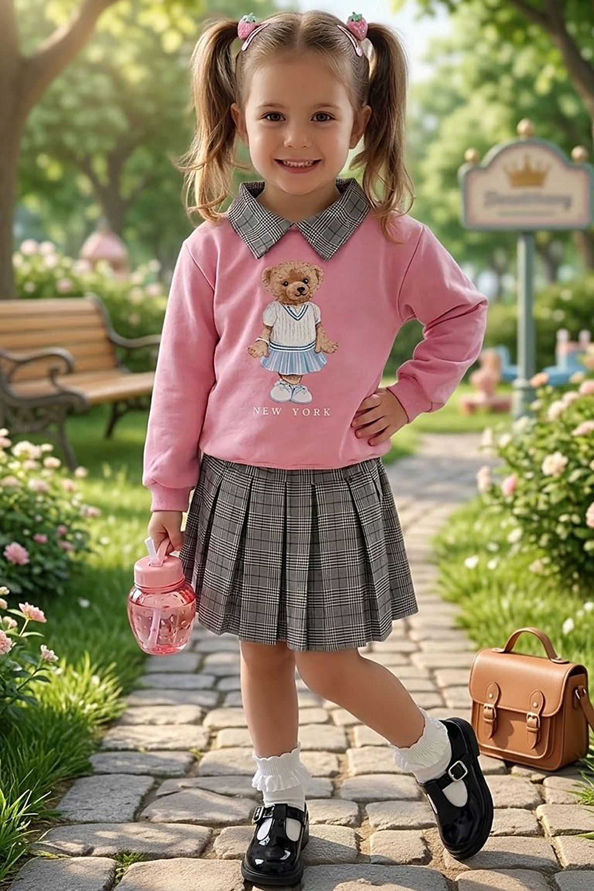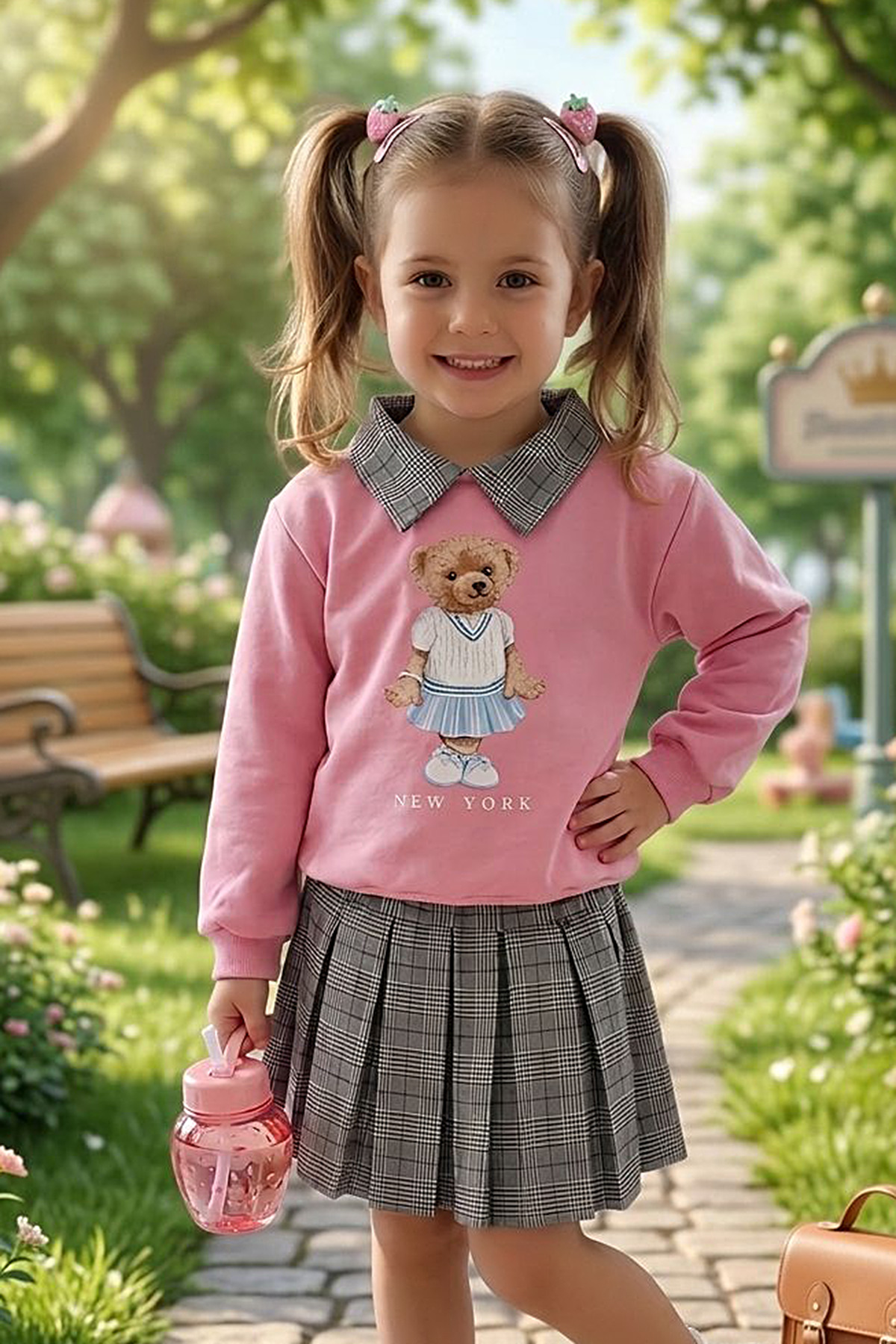 Kız Çocuk Ayıcık Baskılı Ekose Etekli Takım (2-10 Yaş)
