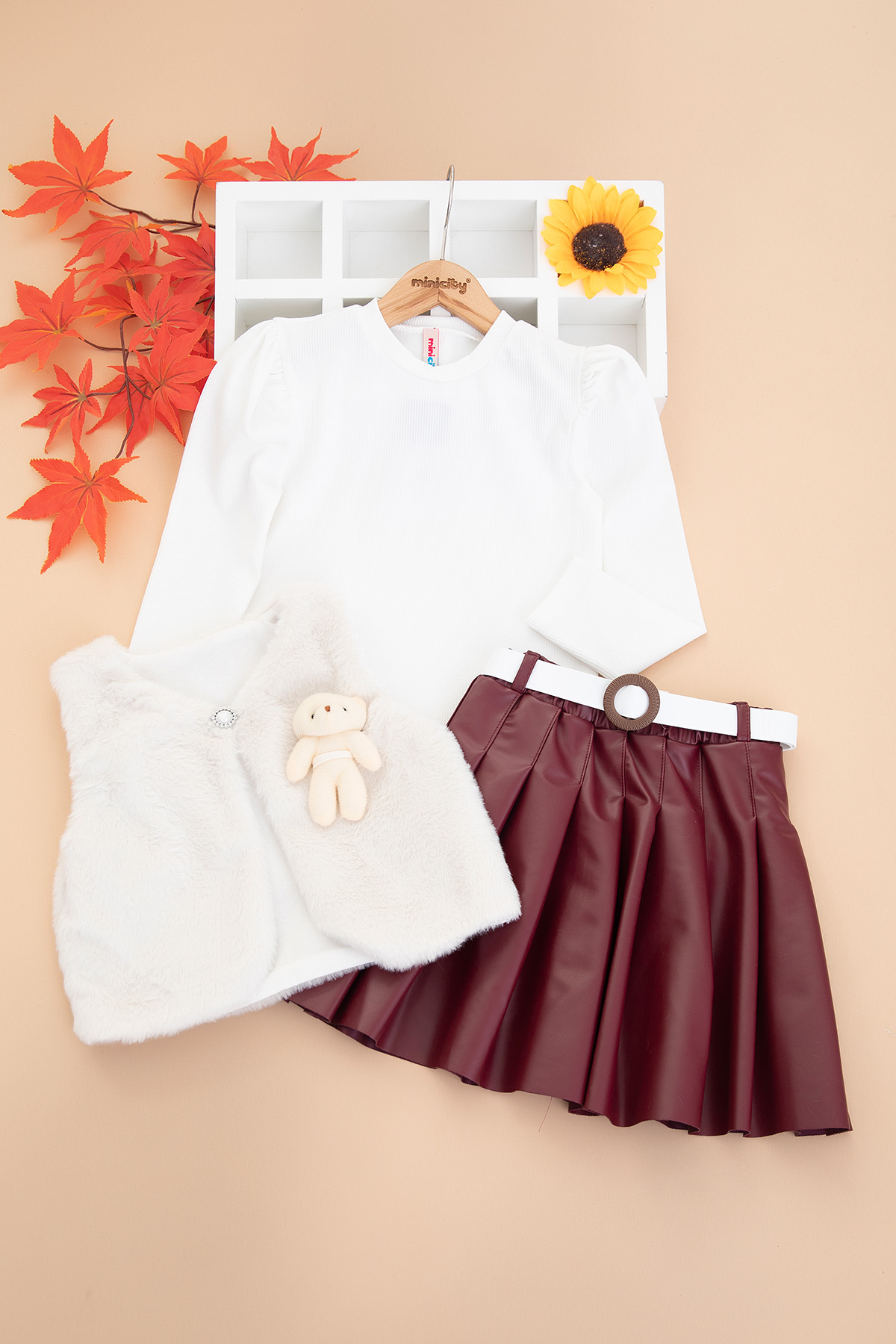 Kız Çocuk Ayılı Peluş Yelek Deri Etek Takım - 25073 (6-9 Yaş)