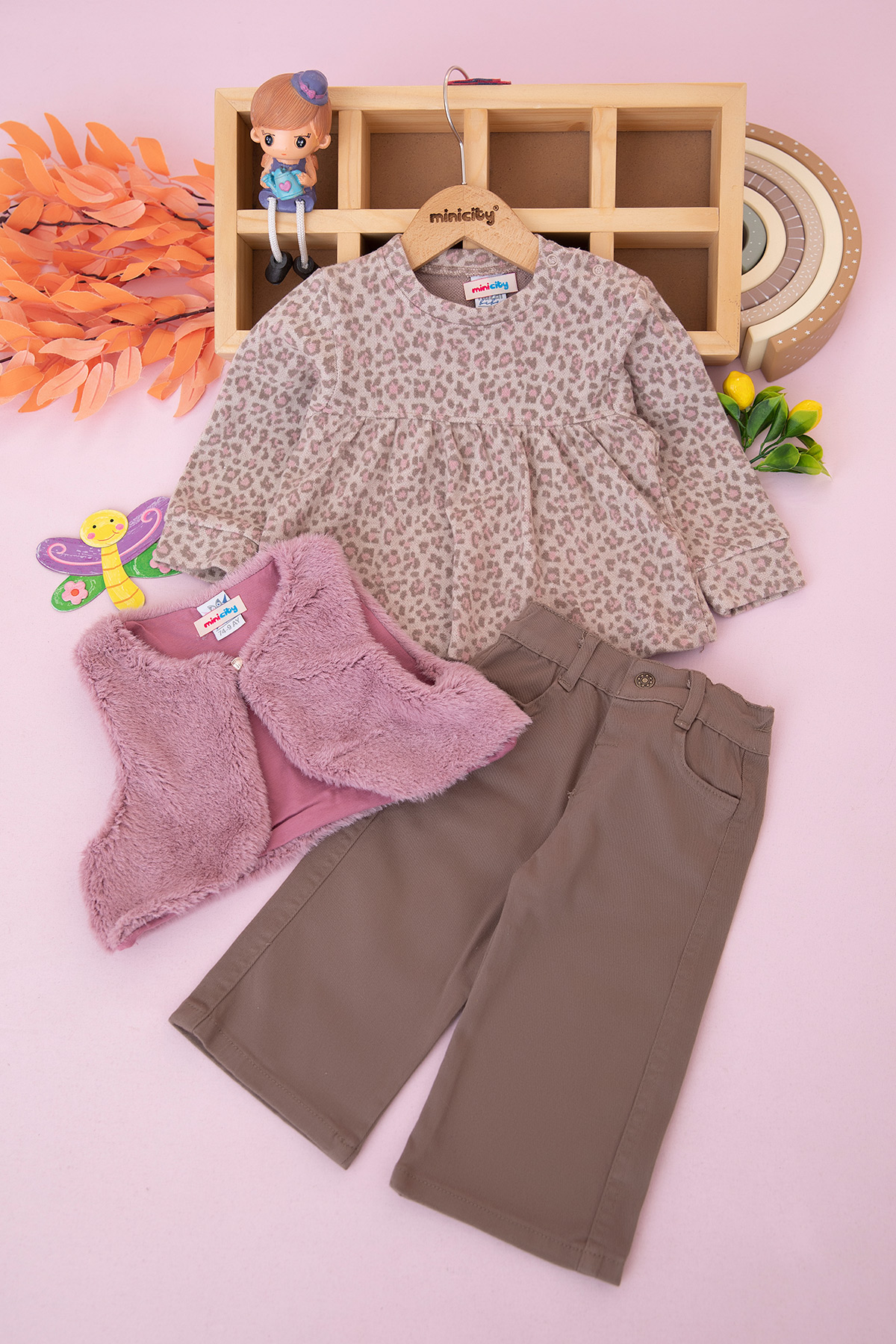 Kız Çocuk Bolerolu Leoparlı Üçlü Takım - 26089 (3-6 Yaş)