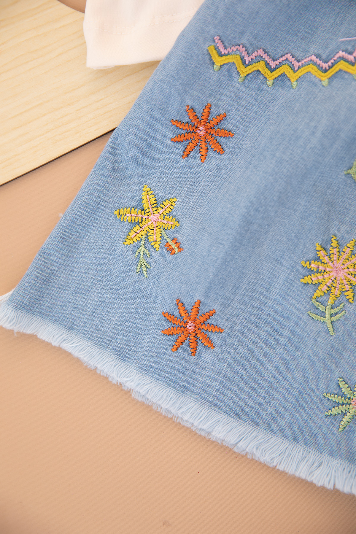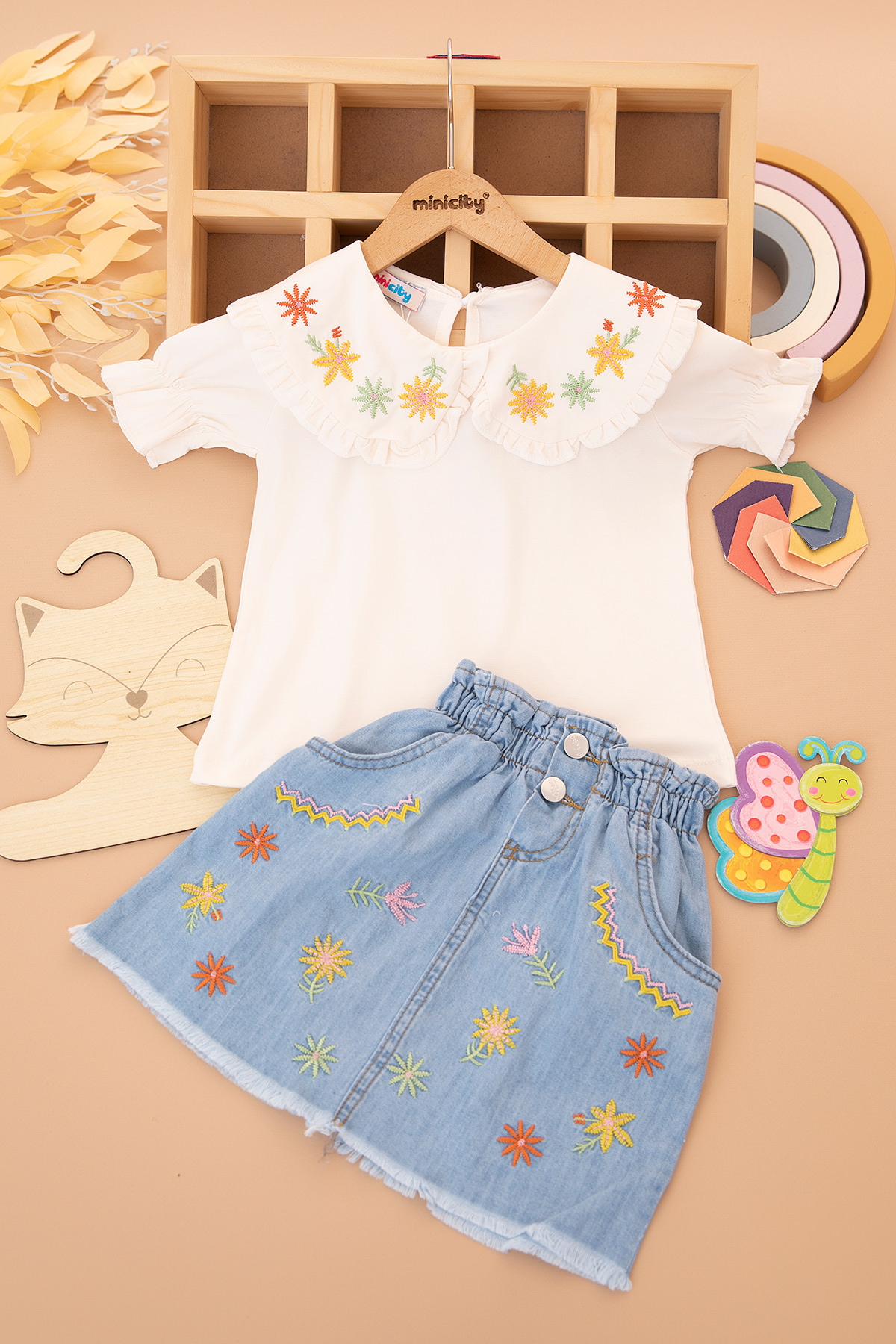 Kız Çocuk Çiçek Nakışlı Kot Etekli Takım - H-1035 (3-10 Yaş)