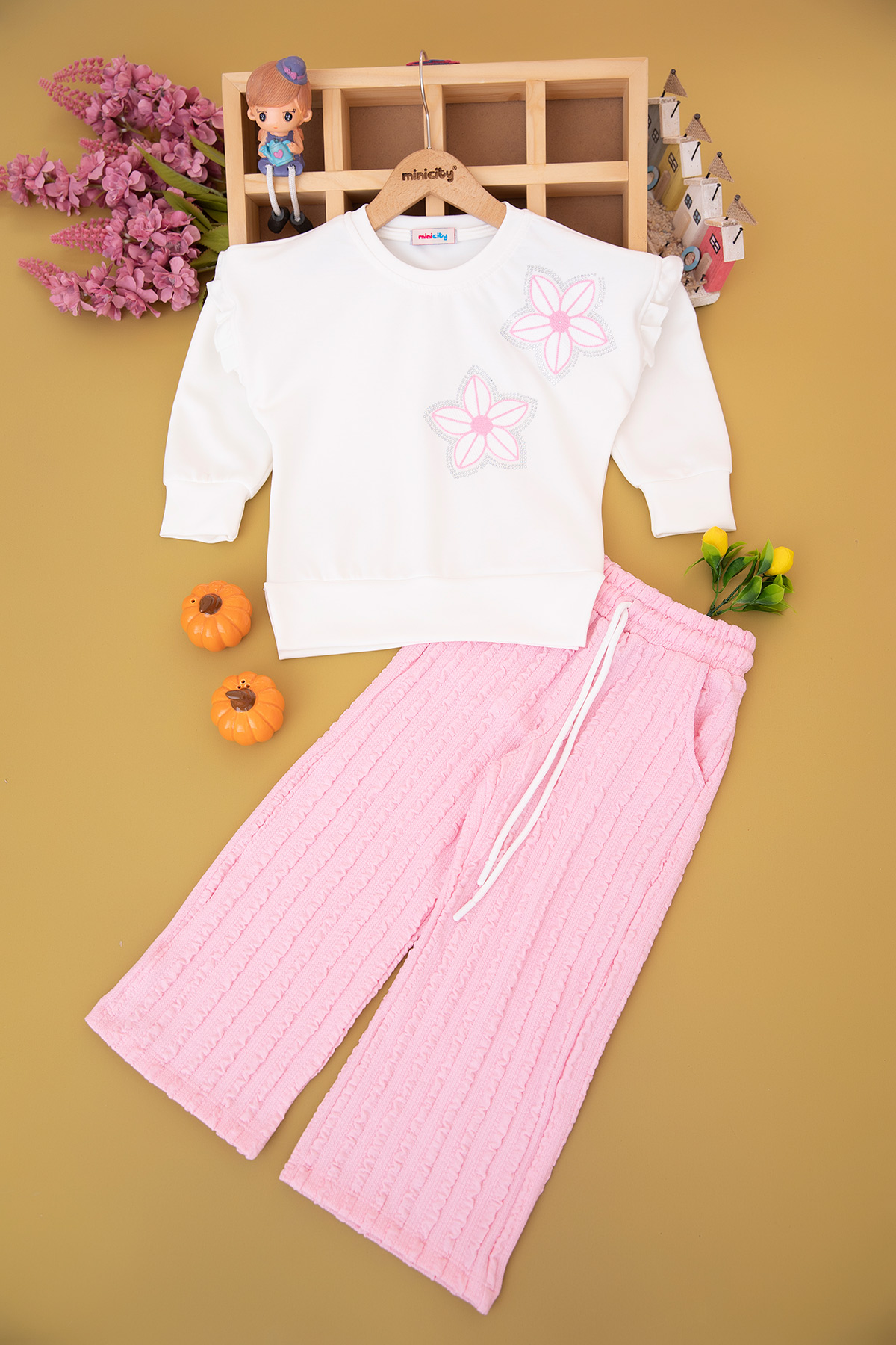 Kız Çocuk Çiçek Nakışlı Taş Aksesuarlı Takım - 5127 (4-11 Yaş)