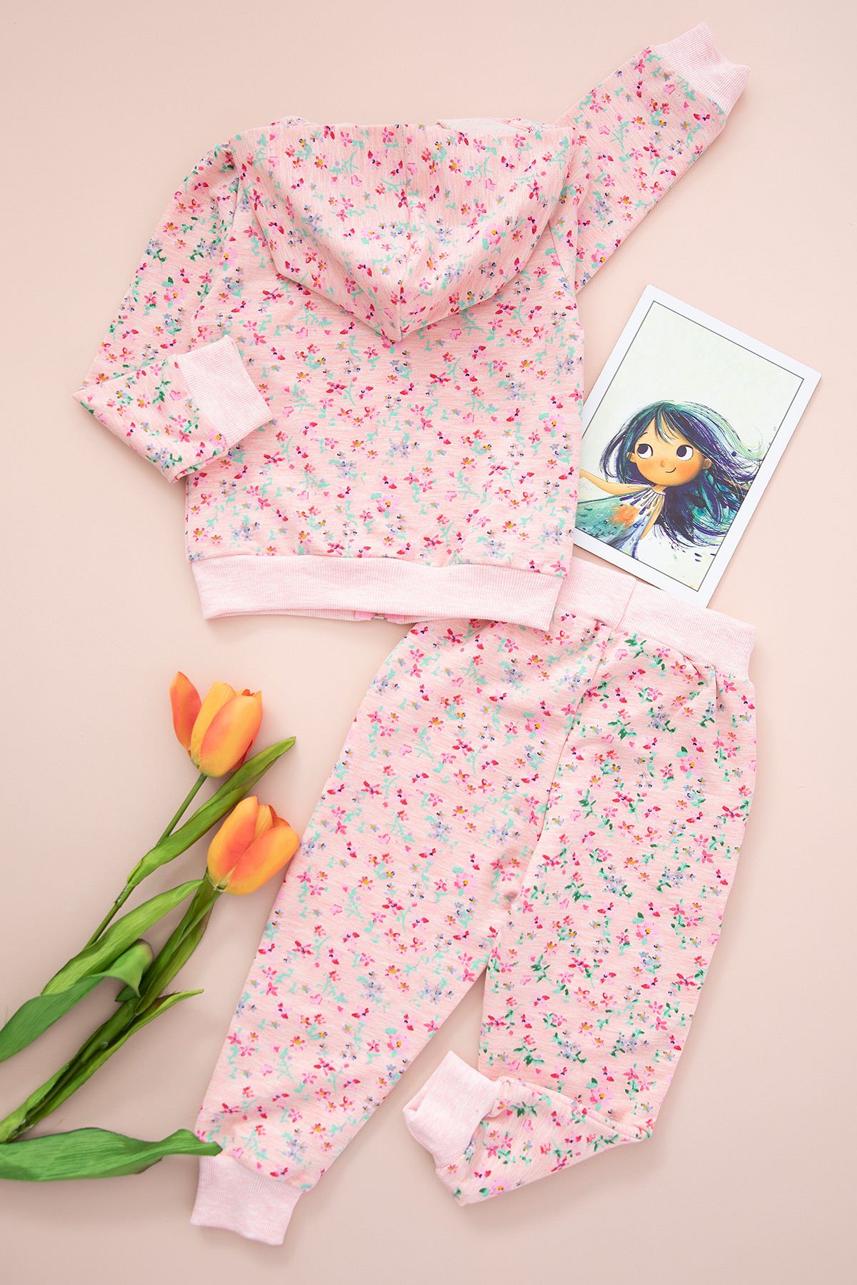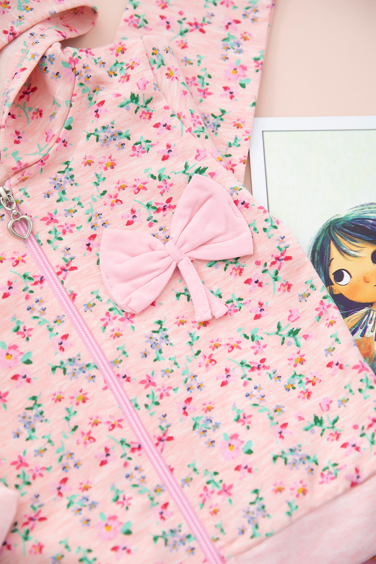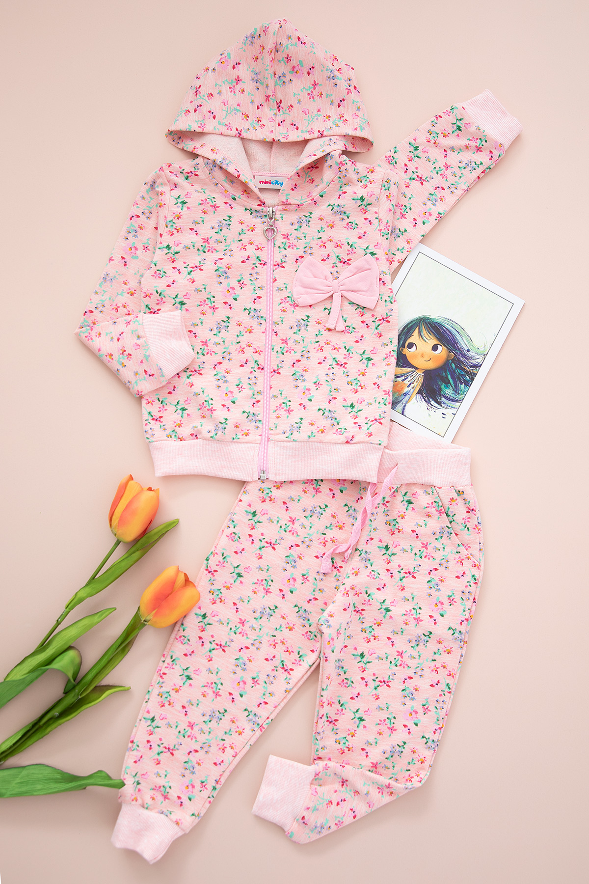 Kız Çocuk Çiçekli Fiyonklu Kapşonlu Takım - 329 (1-8 Yaş)