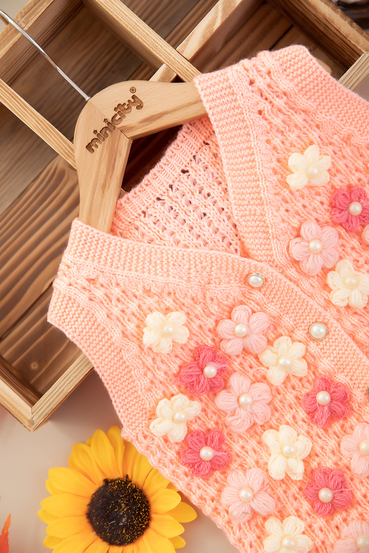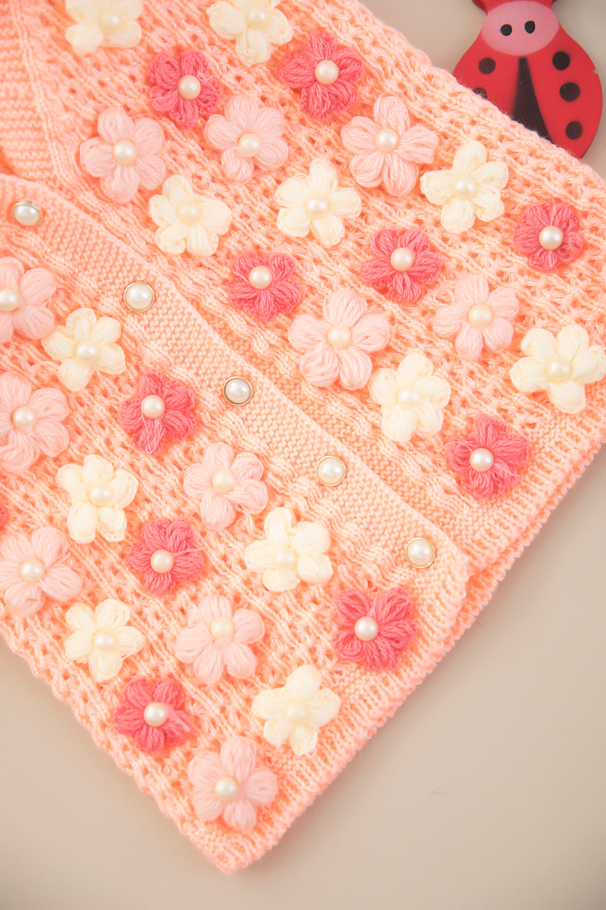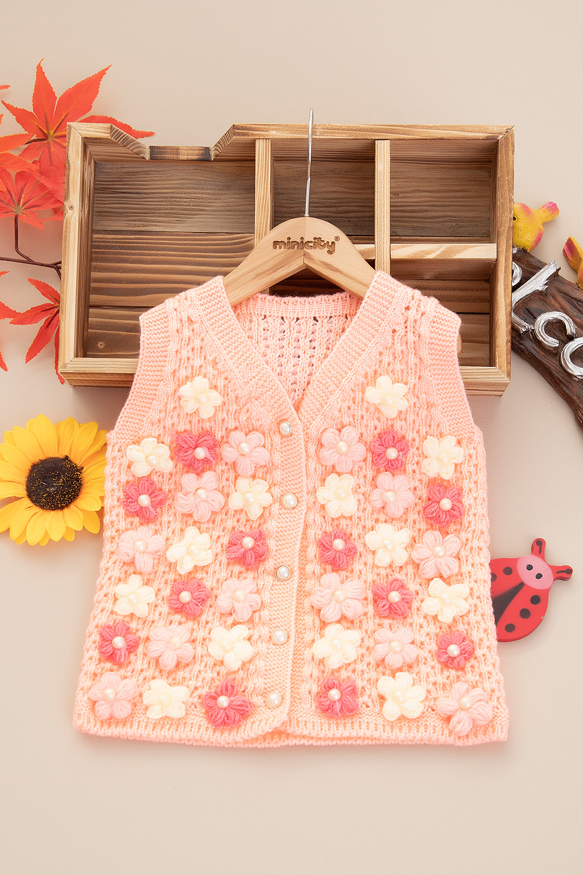Kız Çocuk Çiçekli İncili Triko Yelek