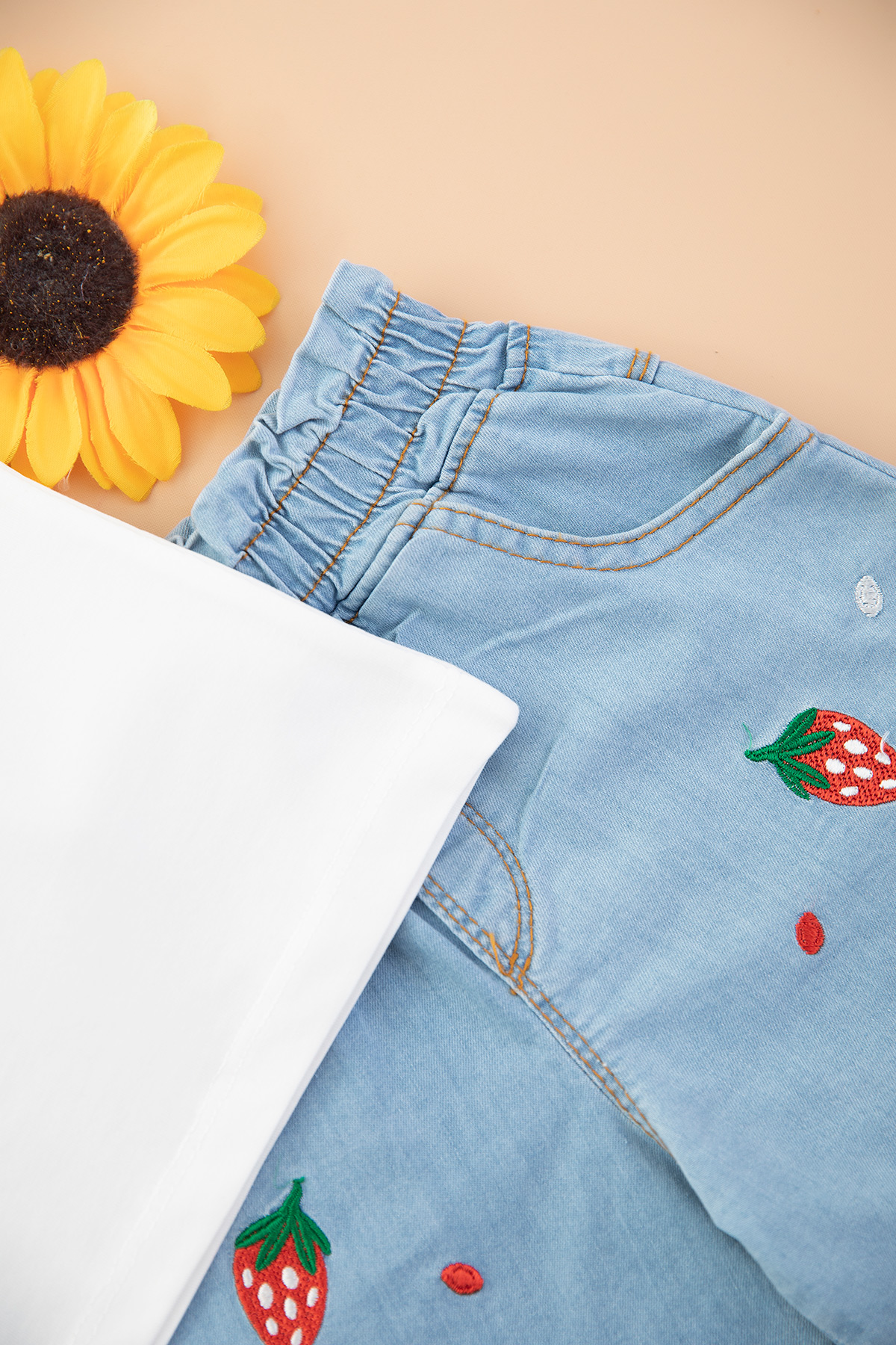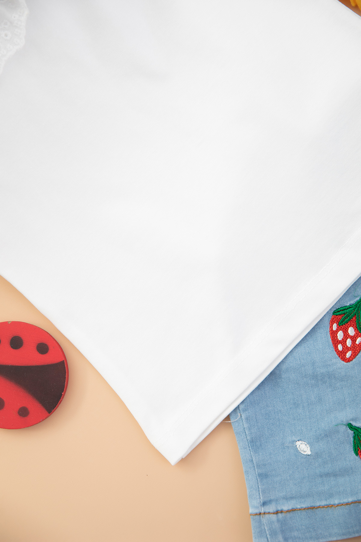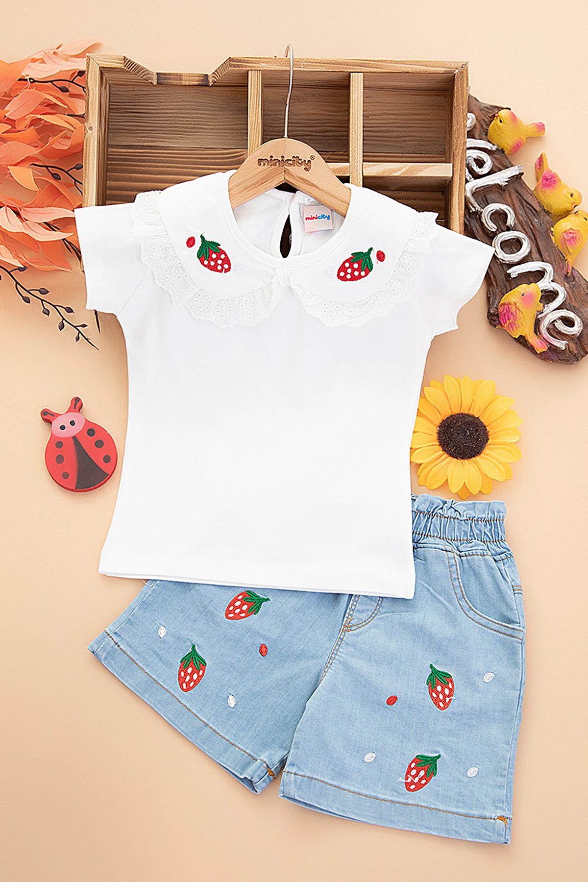 Kız Çocuk Çilek Nakışlı Badi Kot Şort Takım - 2520 (3-7 Yaş)