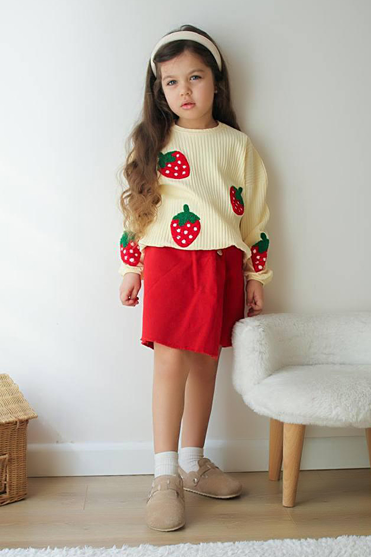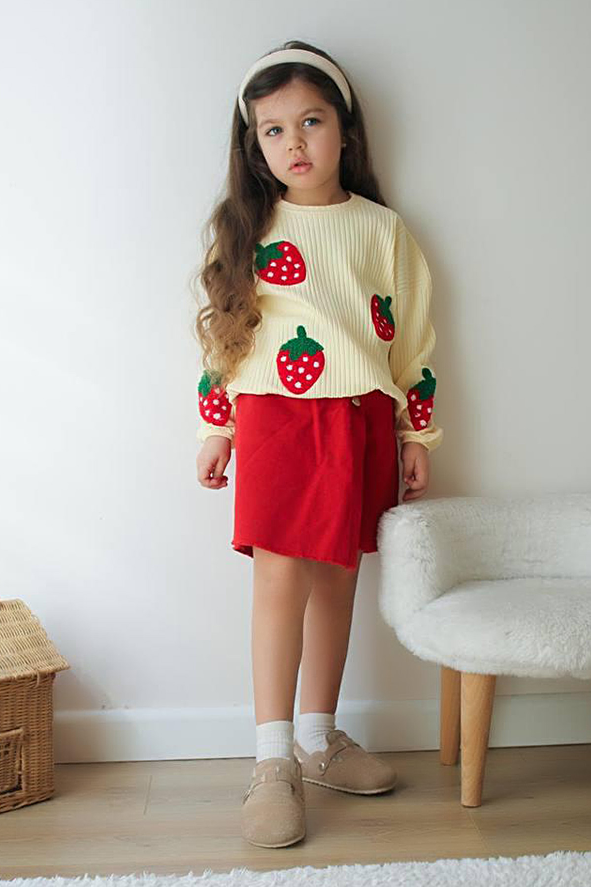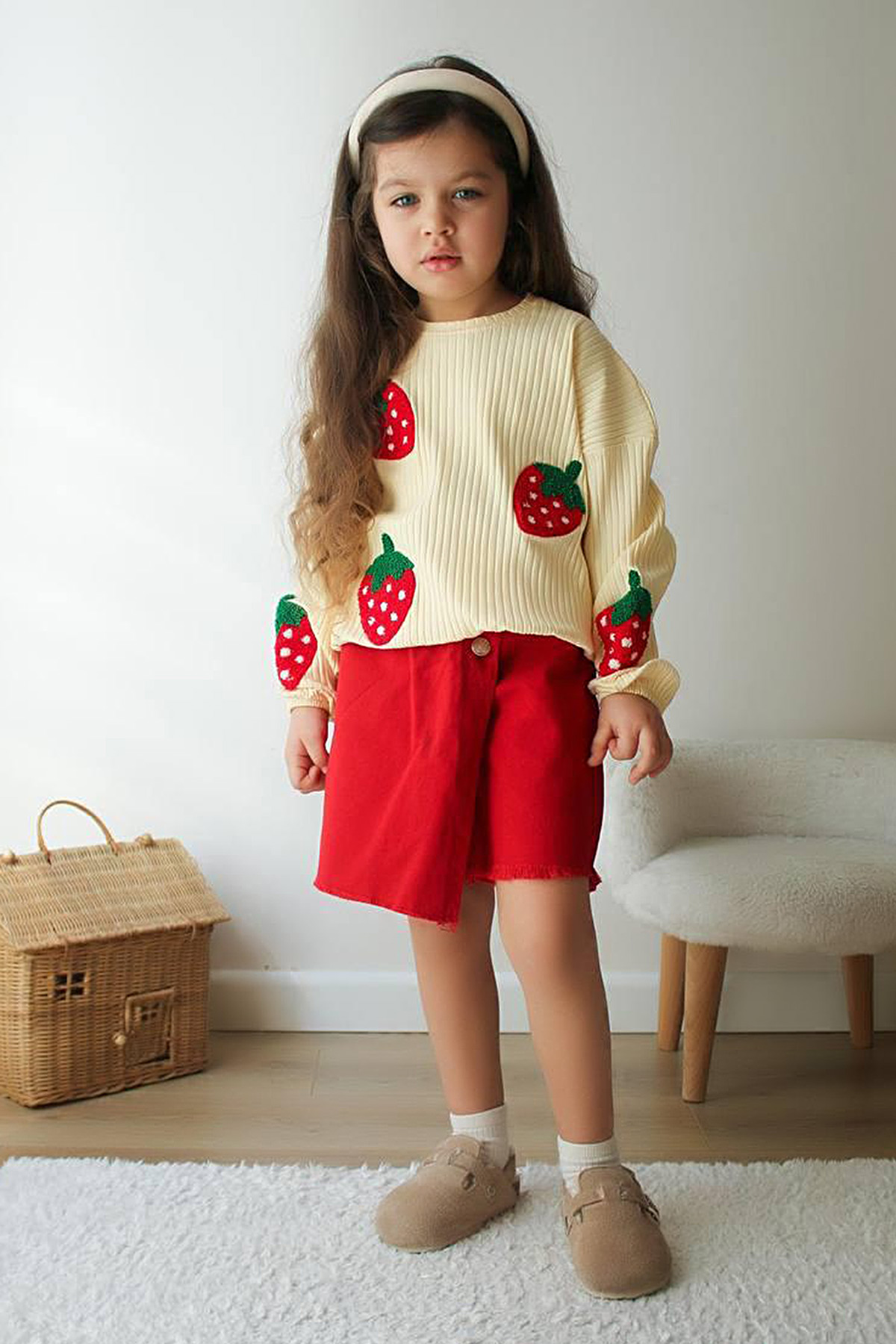 Kız Çocuk Çilek Nakışlı Kot Şort Etek Takım - K-5960 (3-10 Yaş)