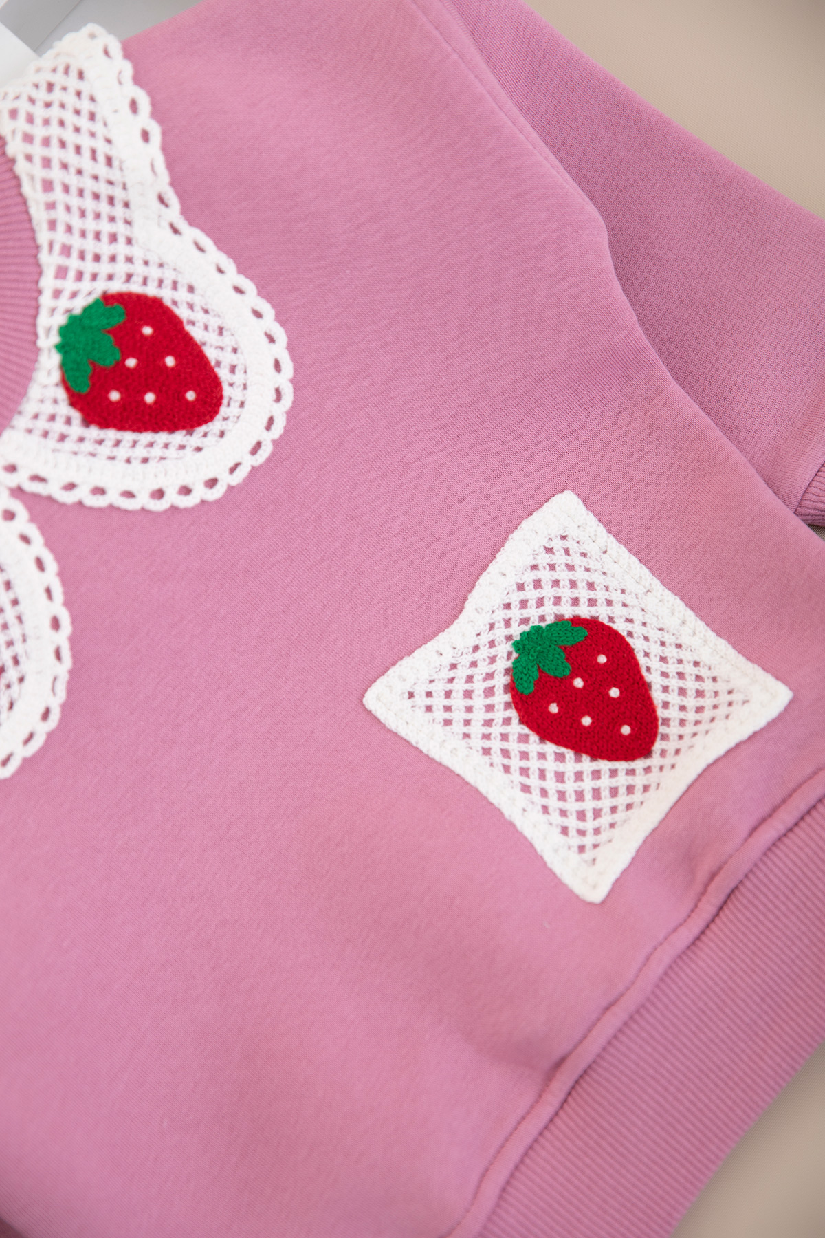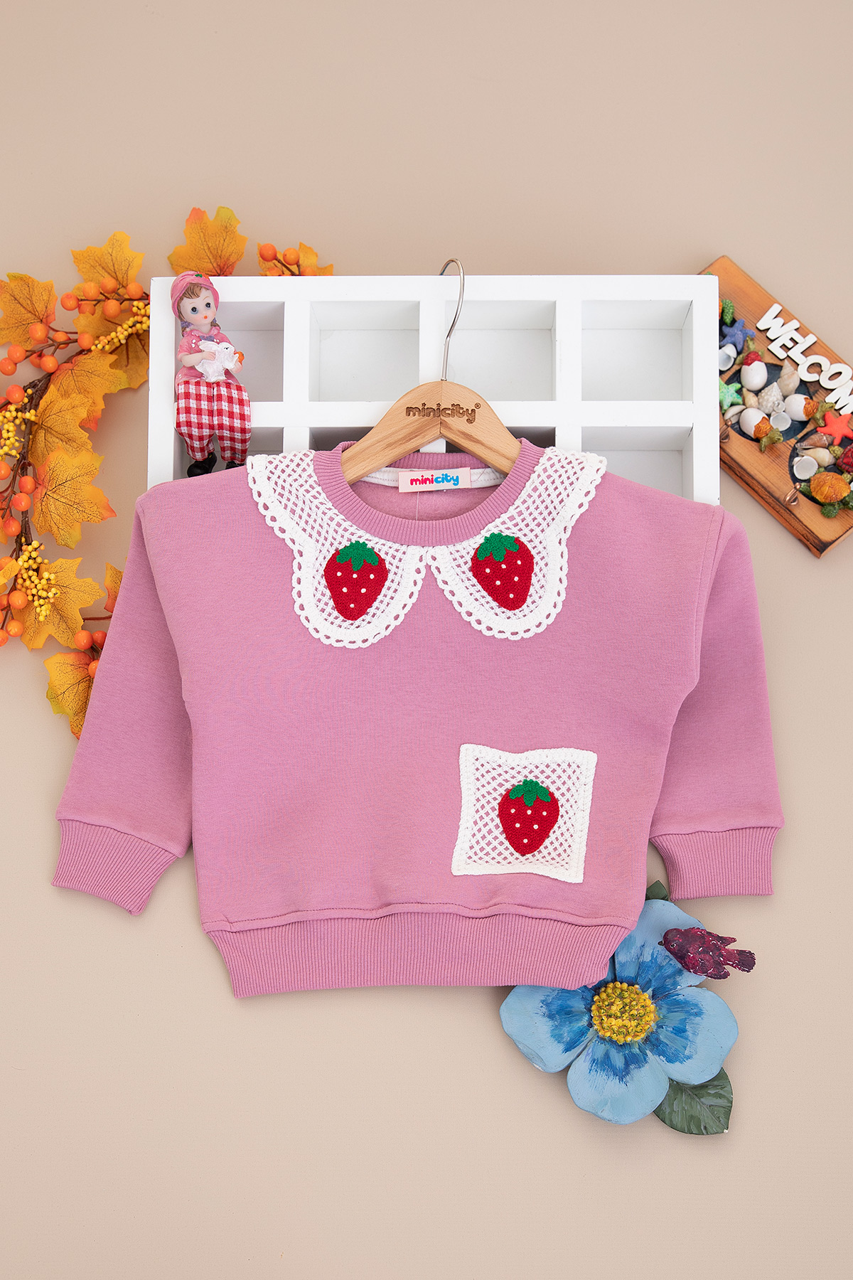 Kız Çocuk Çilek Yaka Cep Nakışlı Üçip Sweat - 4057 (3-7 Yaş)