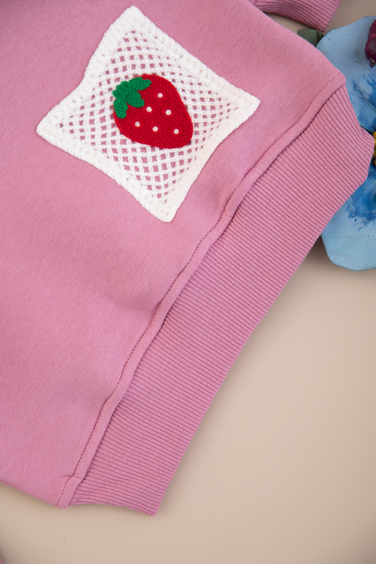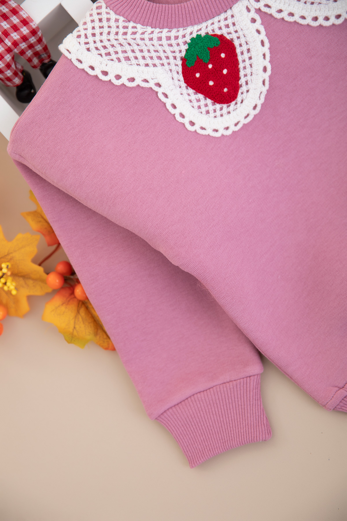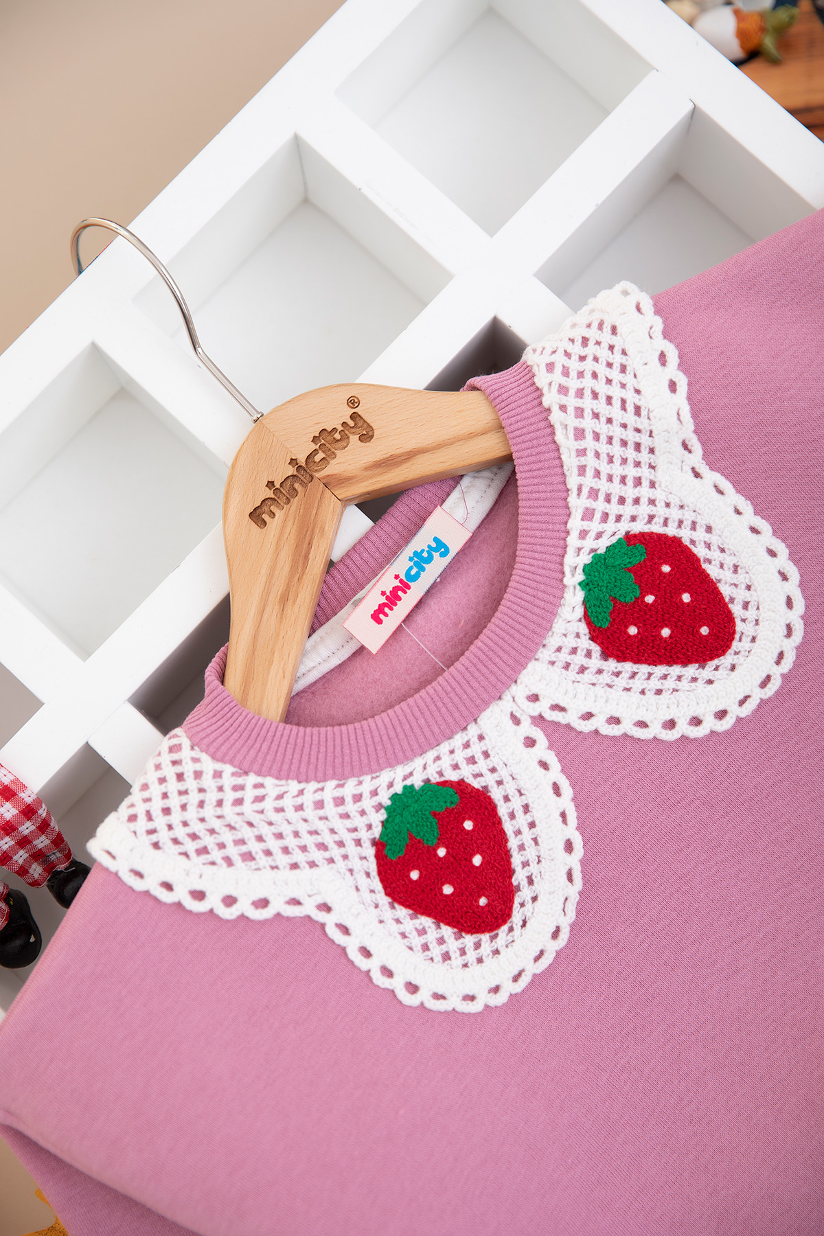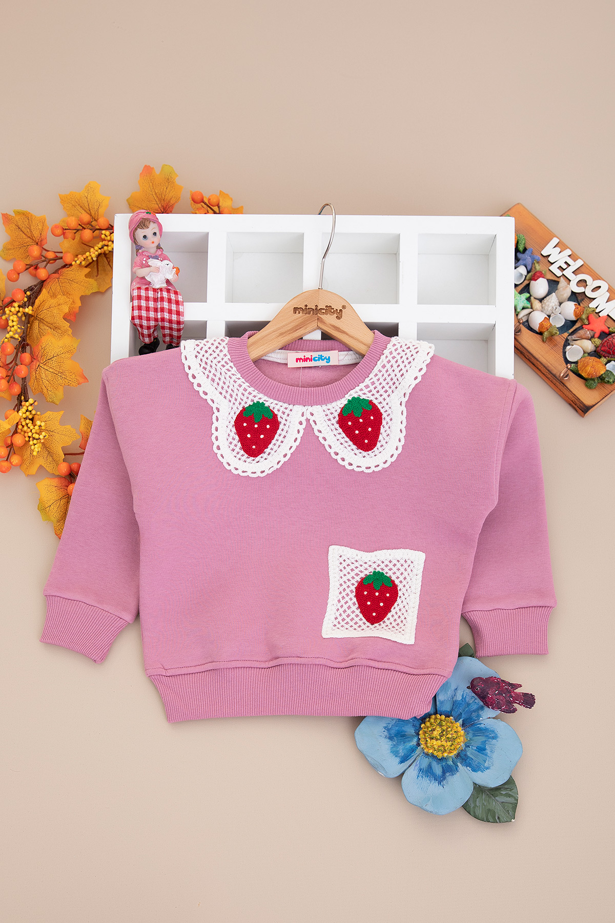 Kız Çocuk Çilek Yaka Cep Nakışlı Üçip Sweat - 4058 (8-12 Yaş)