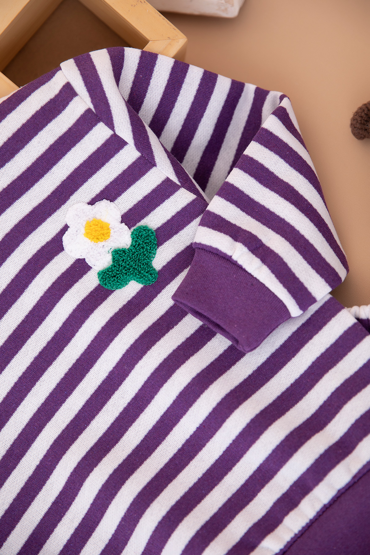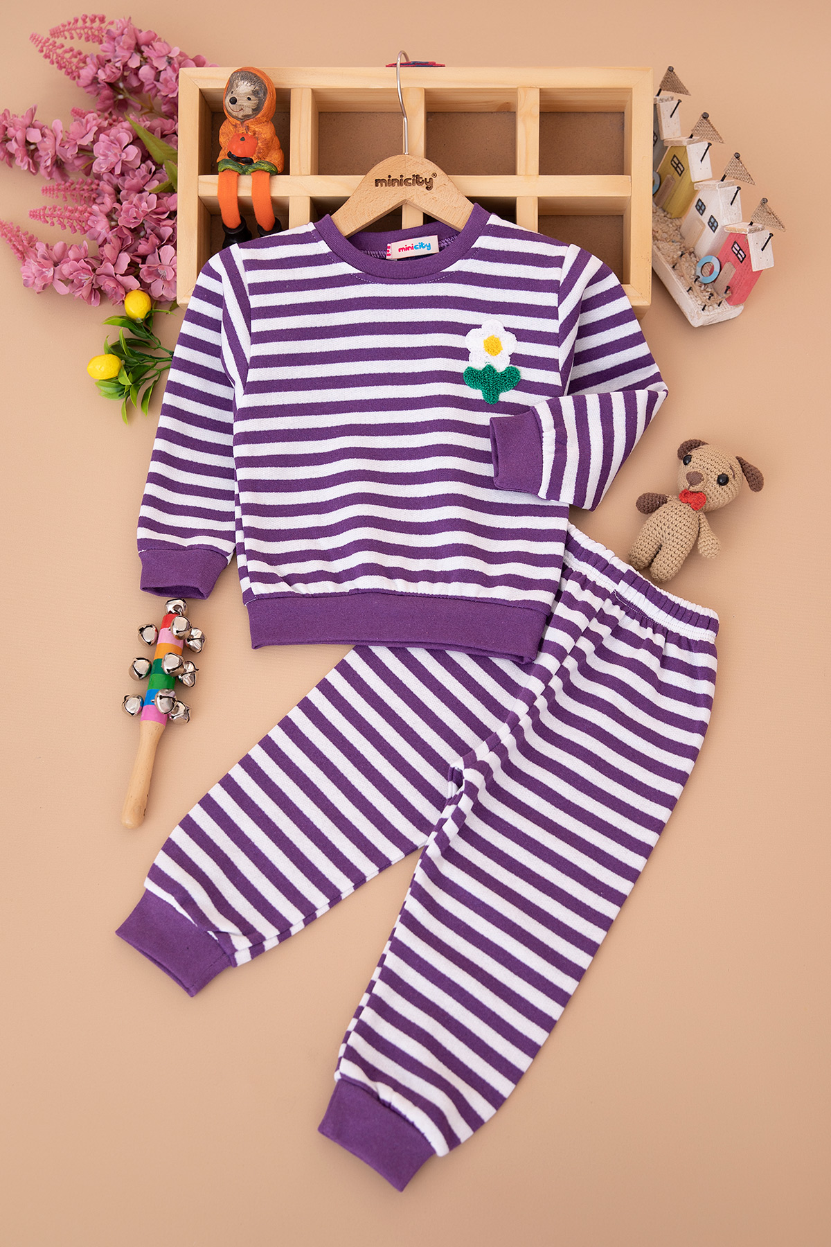 Kız Çocuk Çizgili Baskılı Nakışlı Şardonlu Takım (2-5 Yaş)