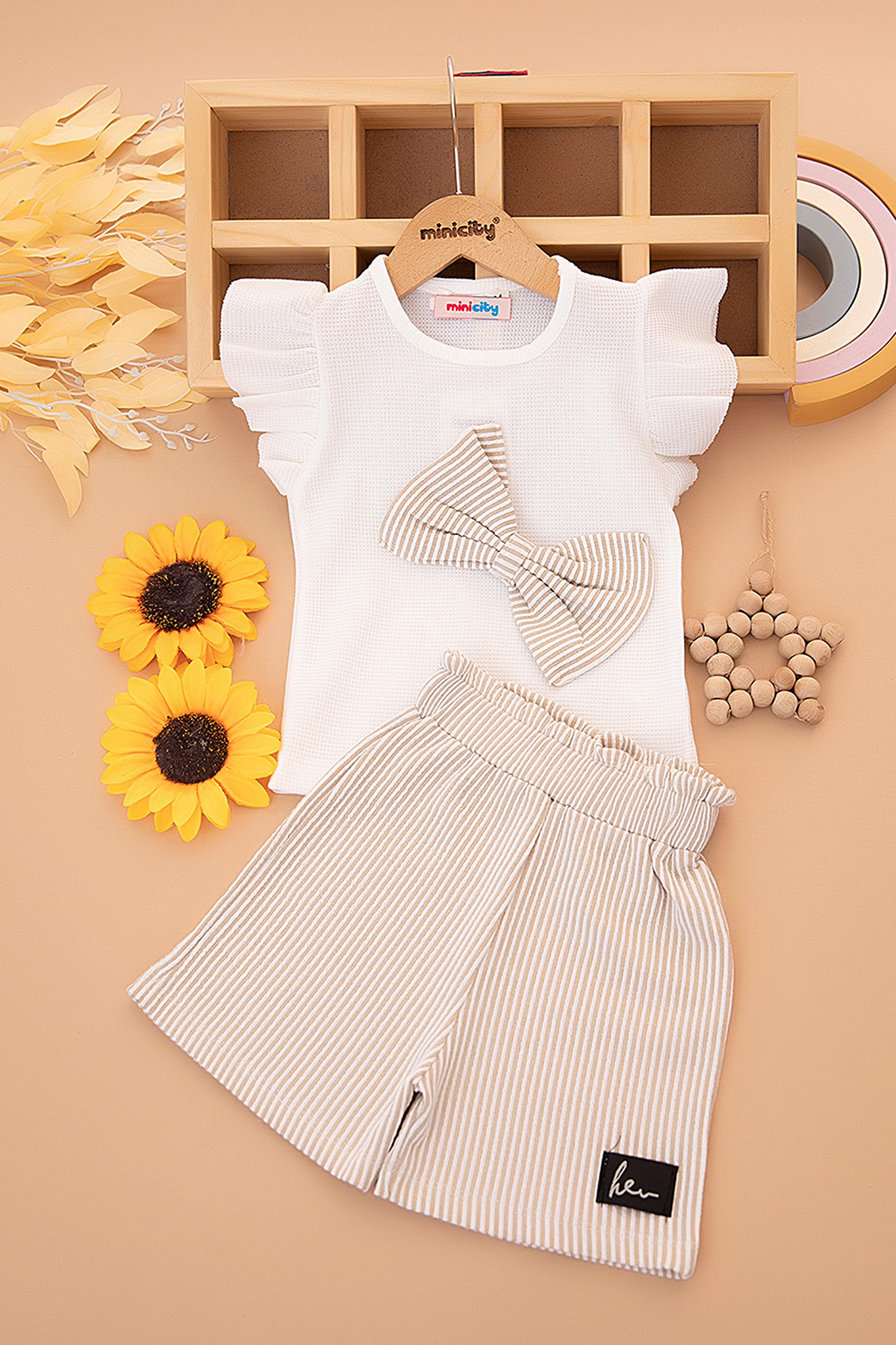 Kız Çocuk Çizgili Fiyonklu Waffle Şortlu Takım - 5597 (3-12 Yaş)