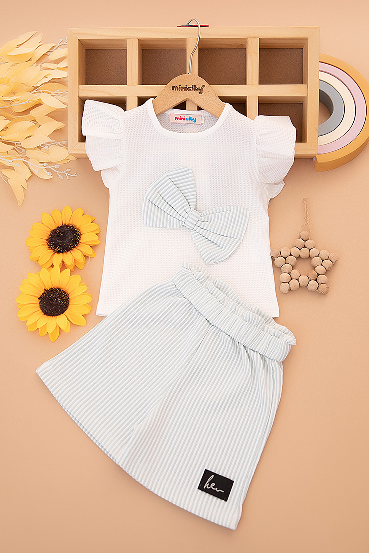 Kız Çocuk Çizgili Fiyonklu Waffle Şortlu Takım - 5597 (3-12 Yaş)