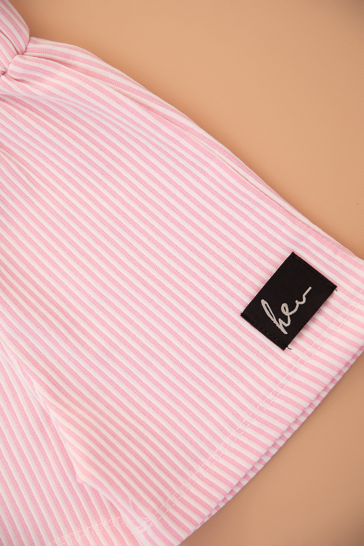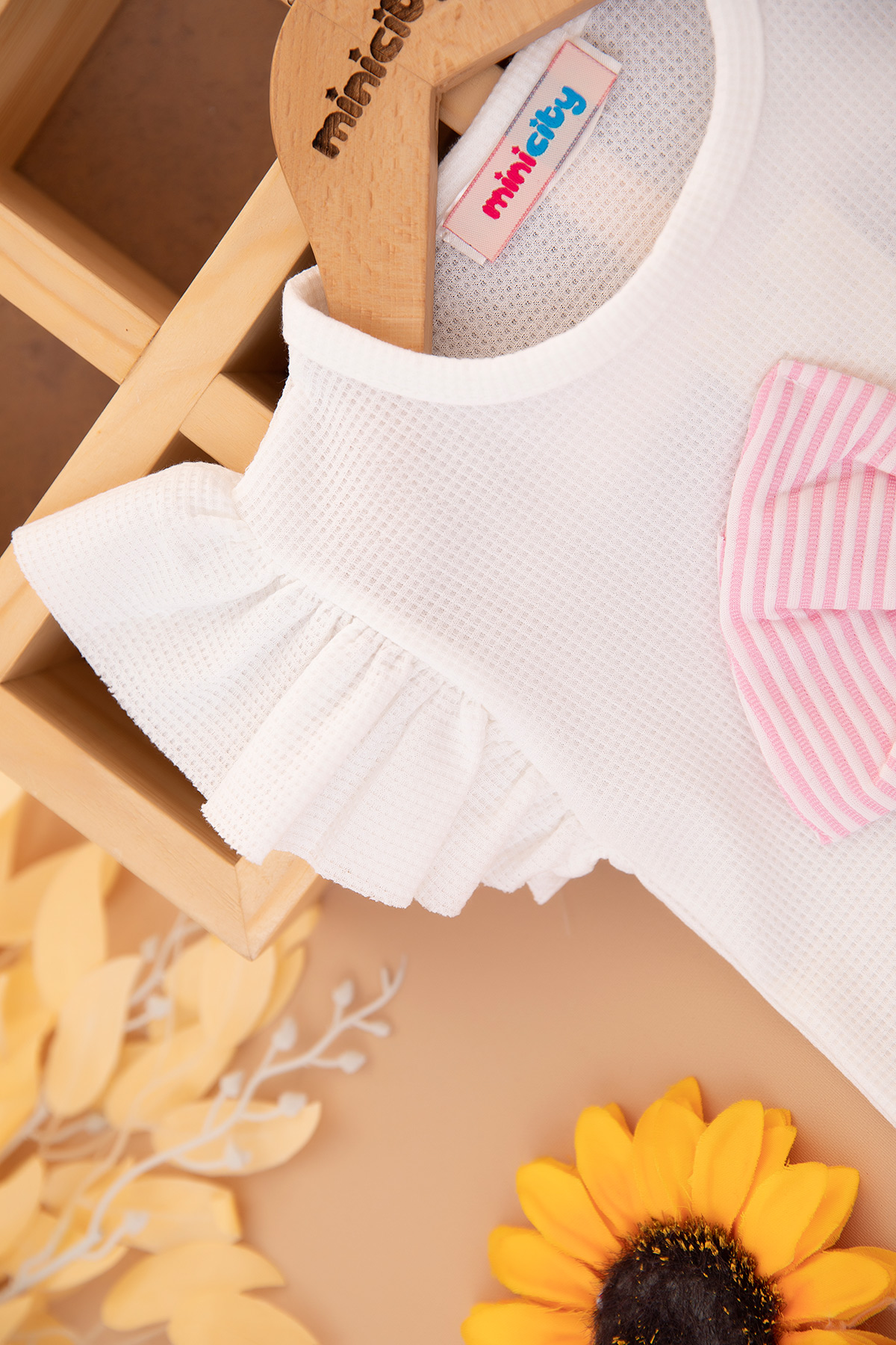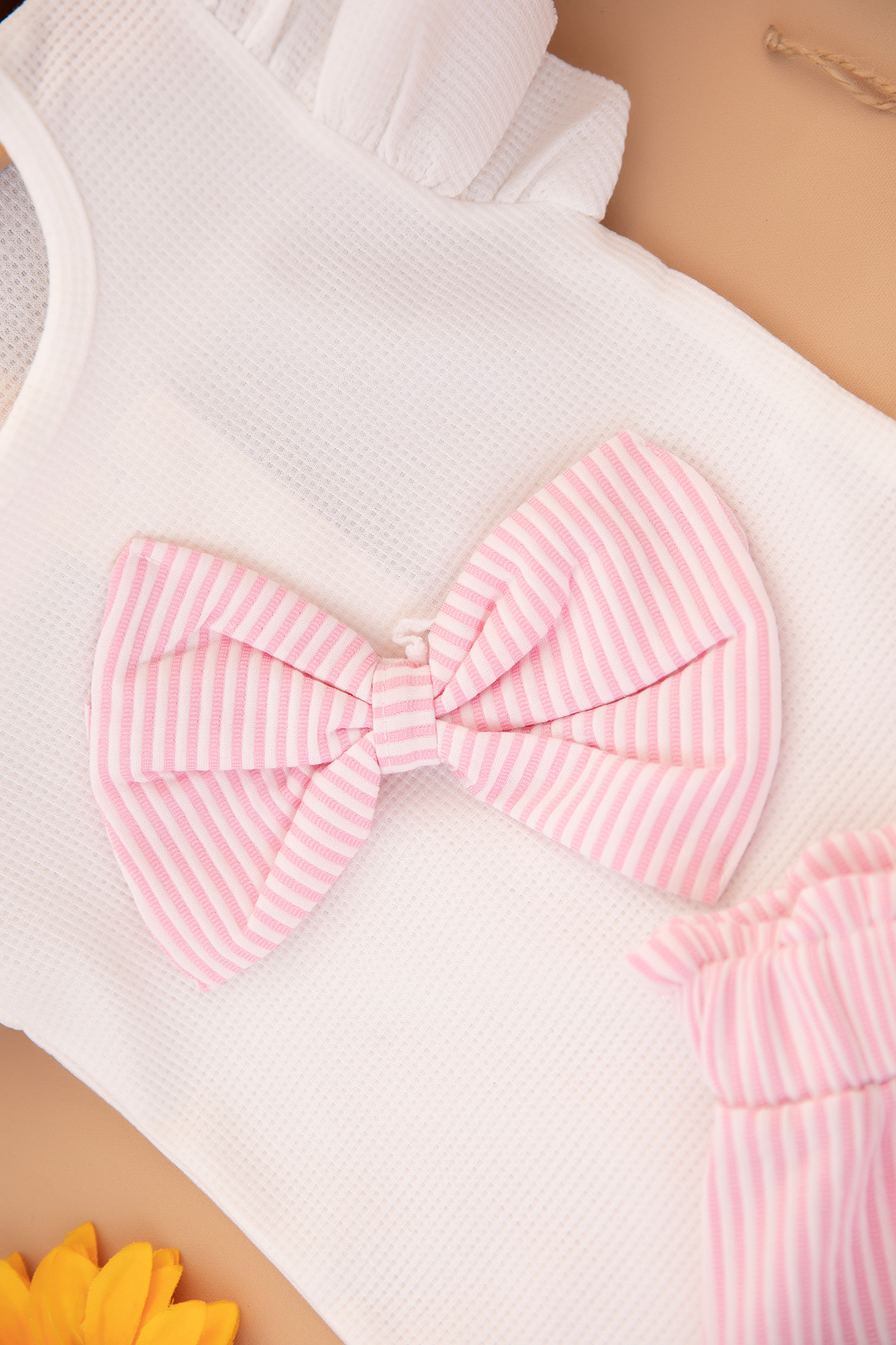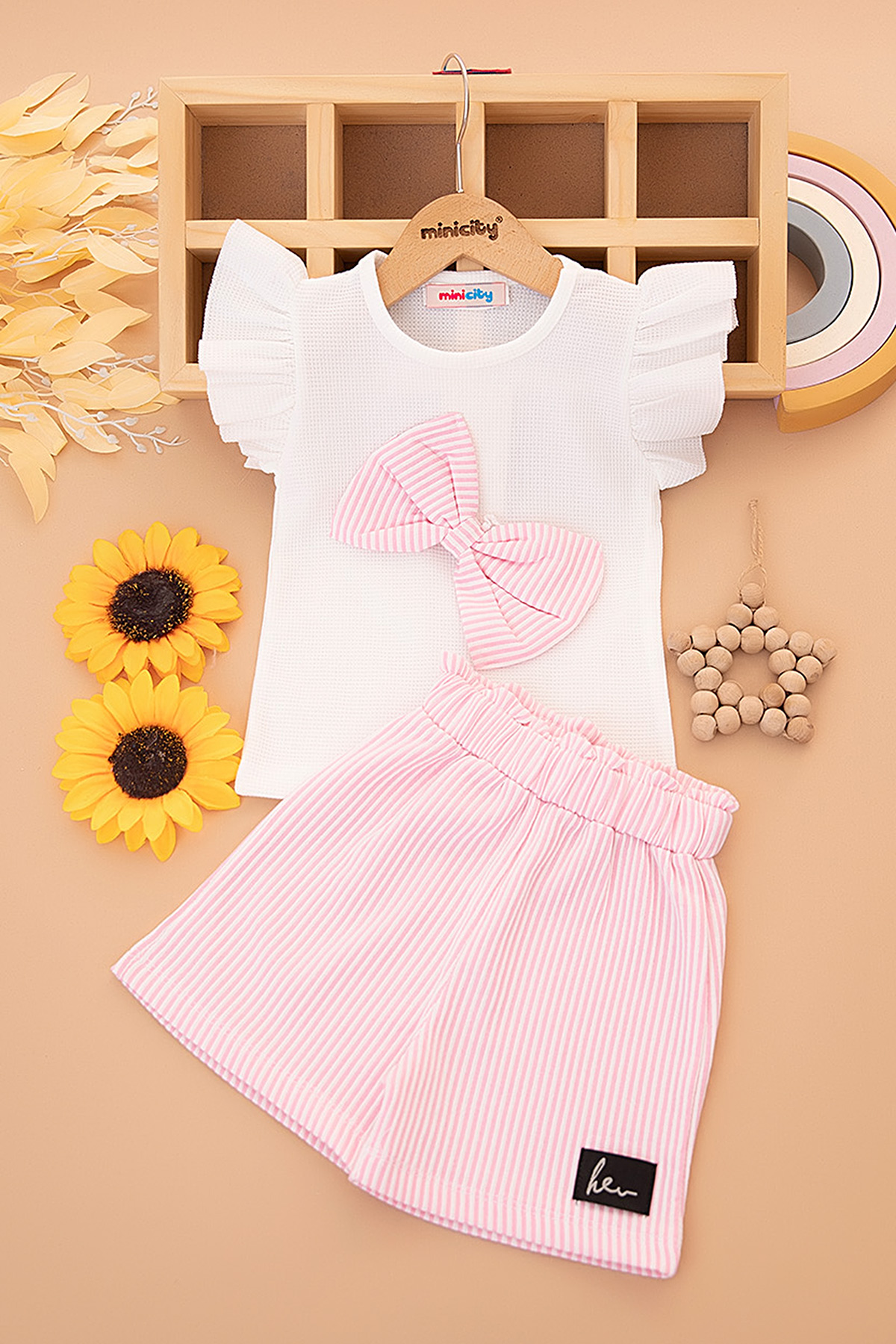 Kız Çocuk Çizgili Fiyonklu Waffle Şortlu Takım - 5597 (3-12 Yaş)