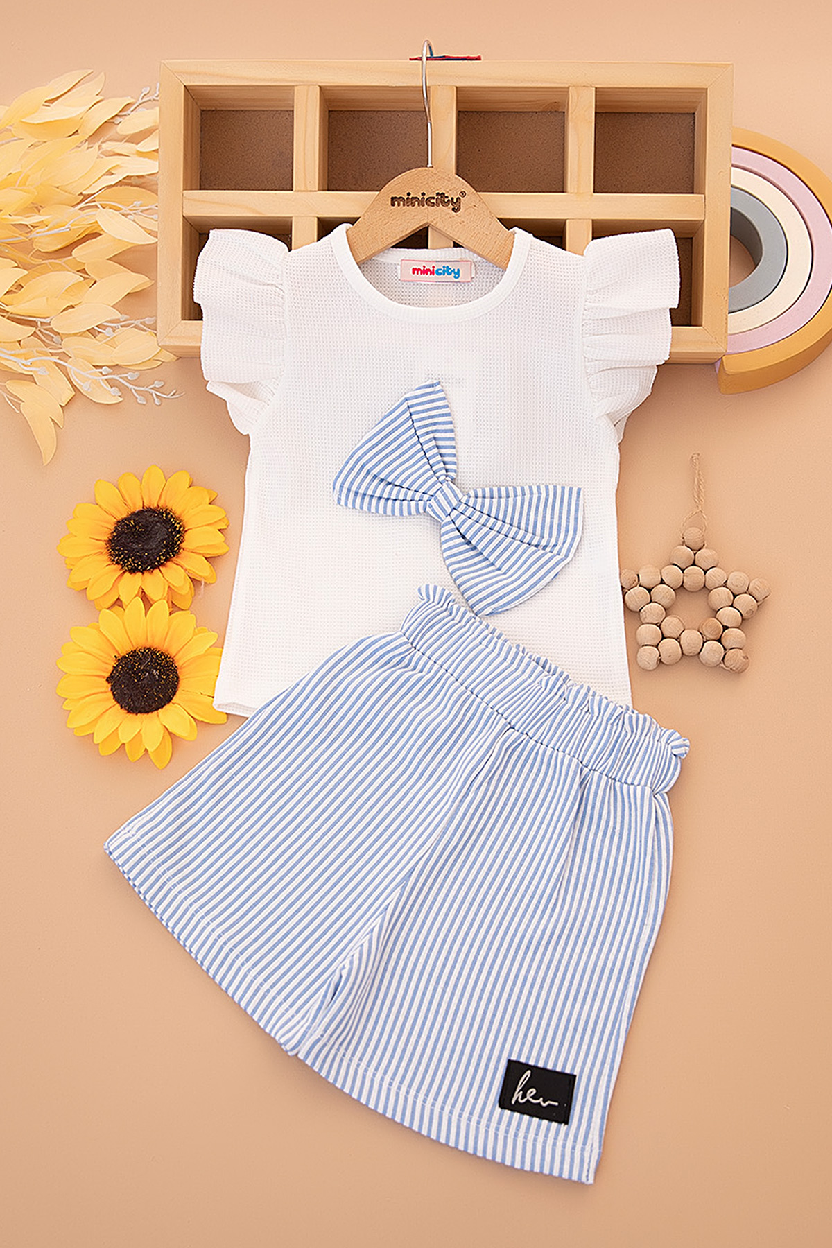 Kız Çocuk Çizgili Fiyonklu Waffle Şortlu Takım - 5597 (3-12 Yaş)