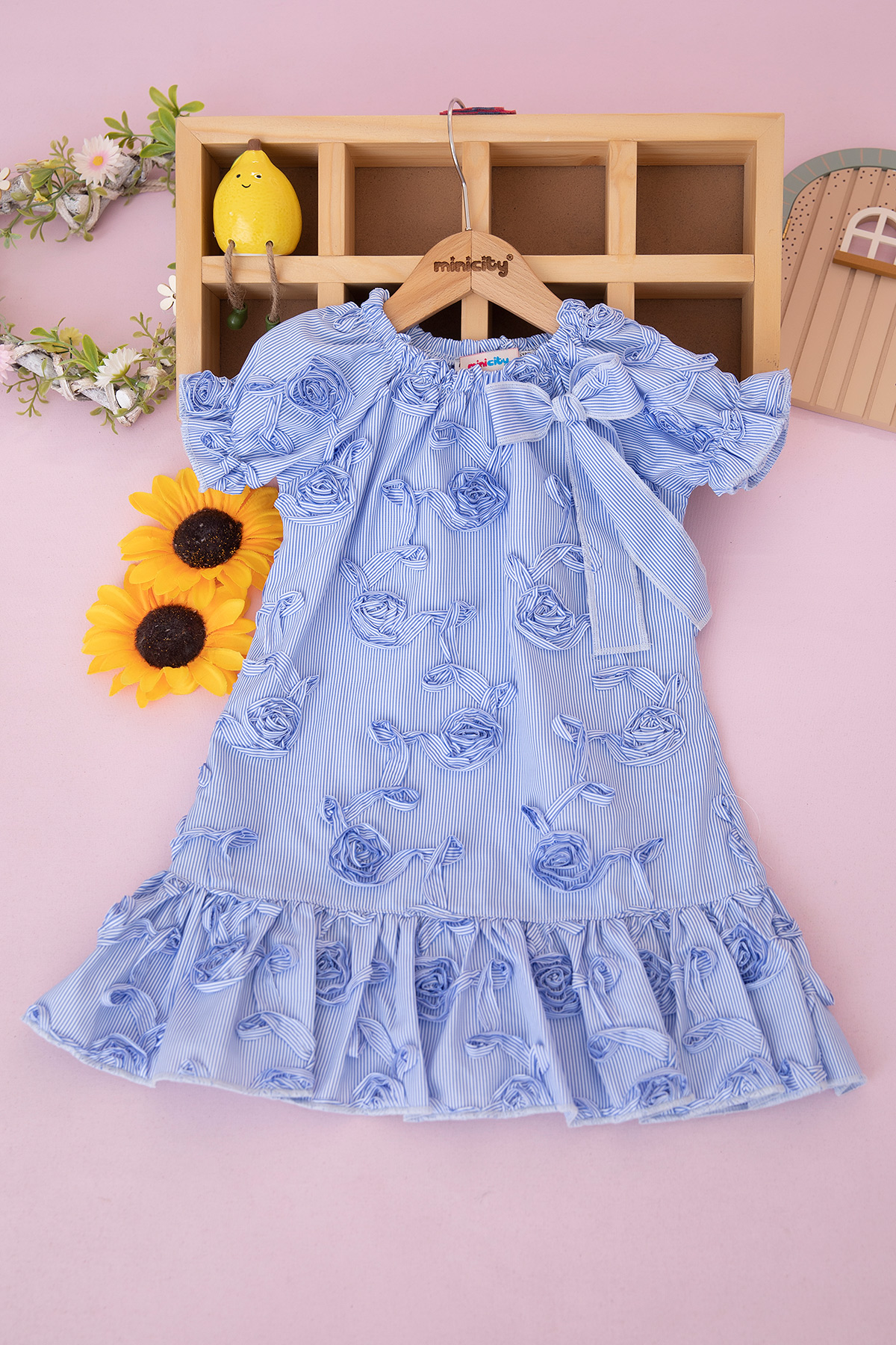 Kız Çocuk Çizgili Güllü Elbise - 381 (7-10 Yaş)