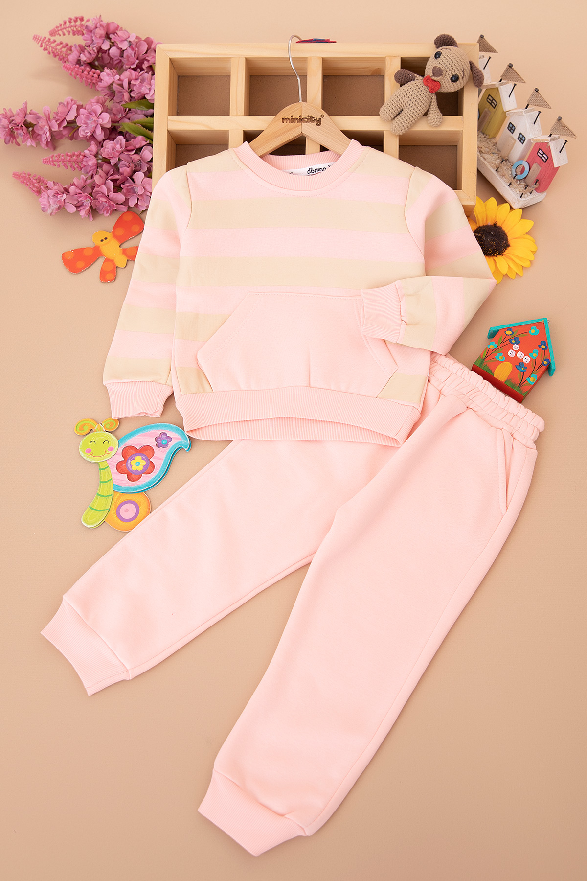 Kız Çocuk Çizgili Kanguru Cepli Üçip Takım - 60275 (2-5 Yaş)