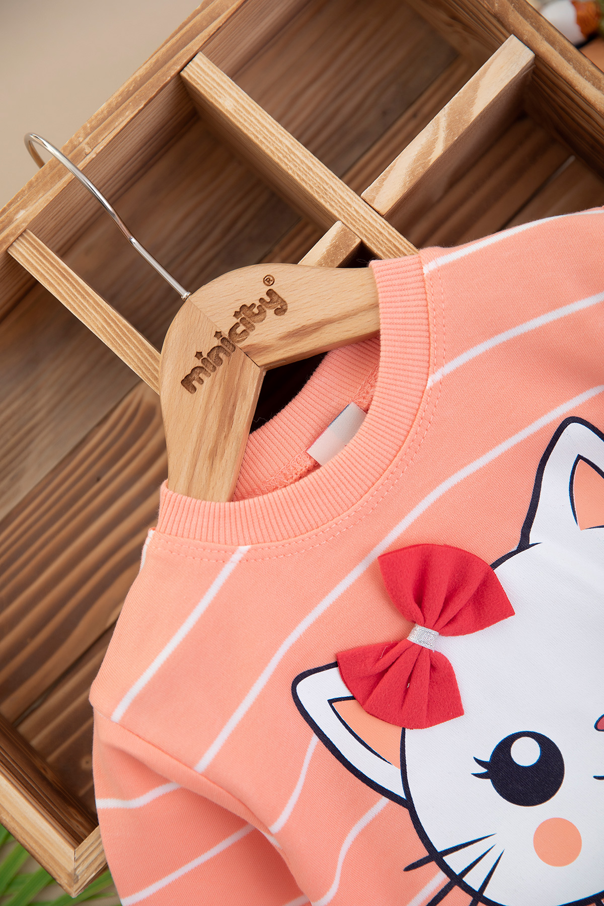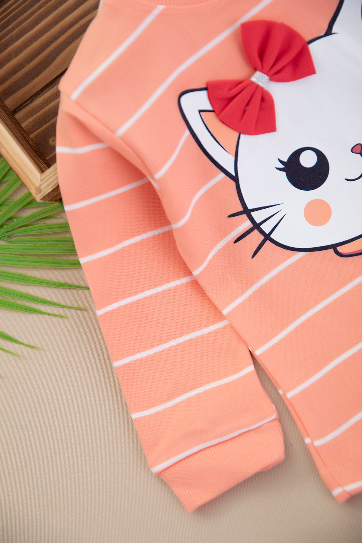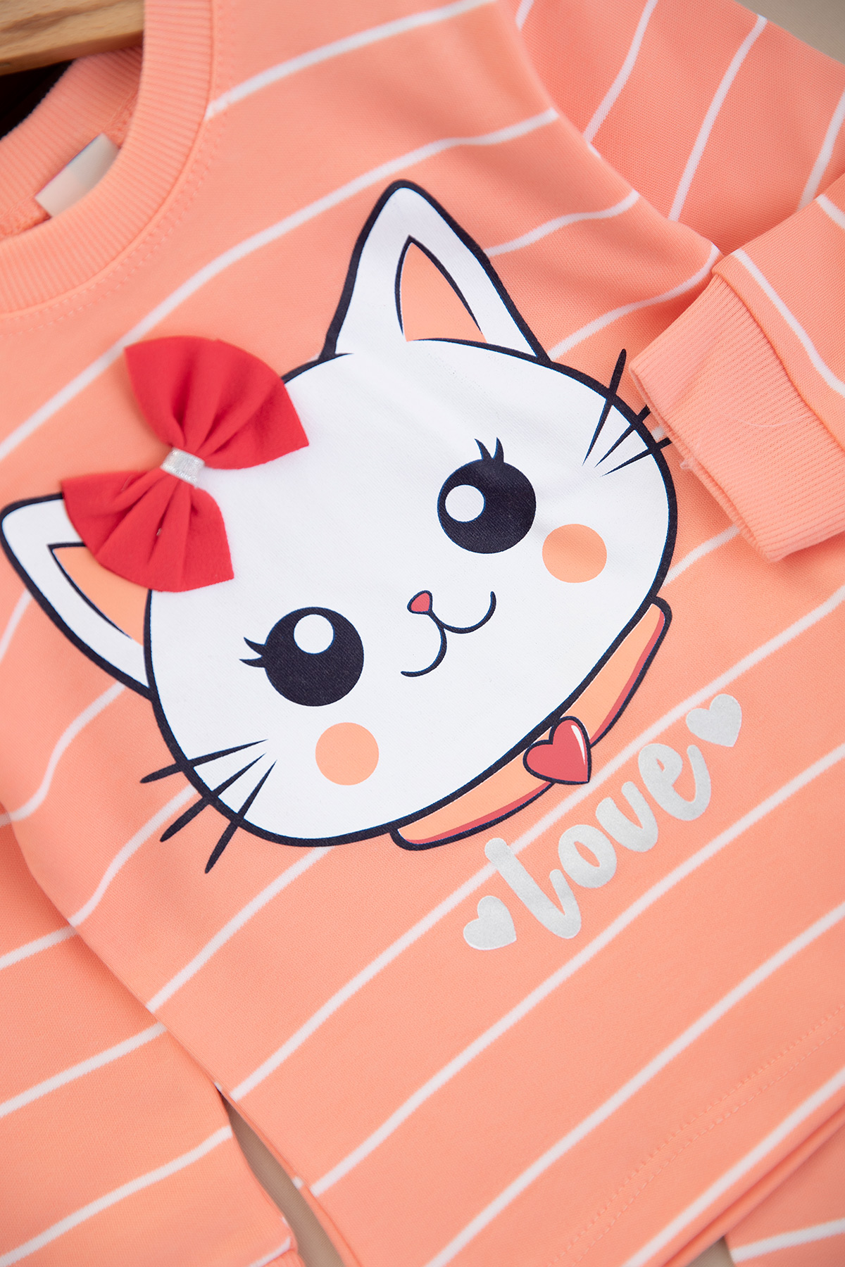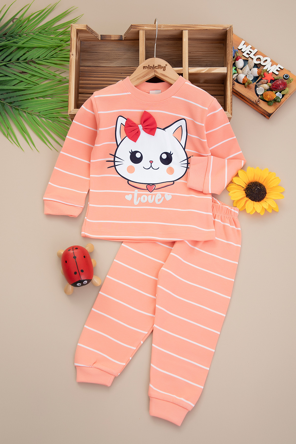 Kız Çocuk Çizgili Kedi Baskılı Pijama Takım - 4012 (1-3 Yaş)