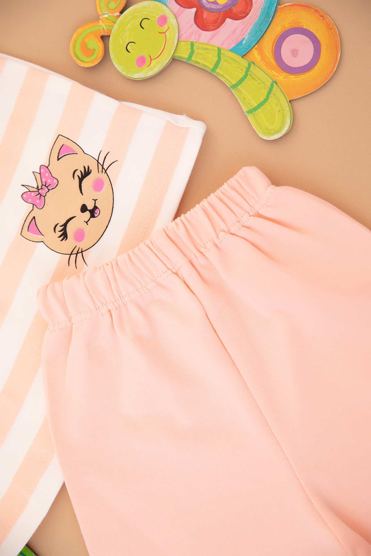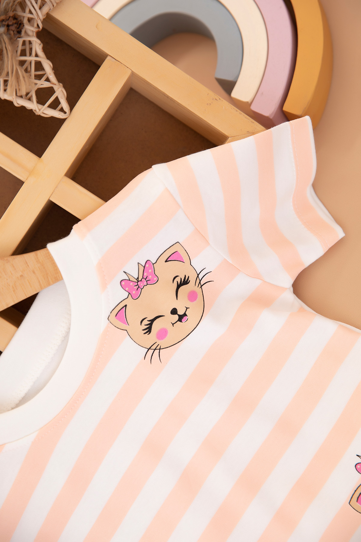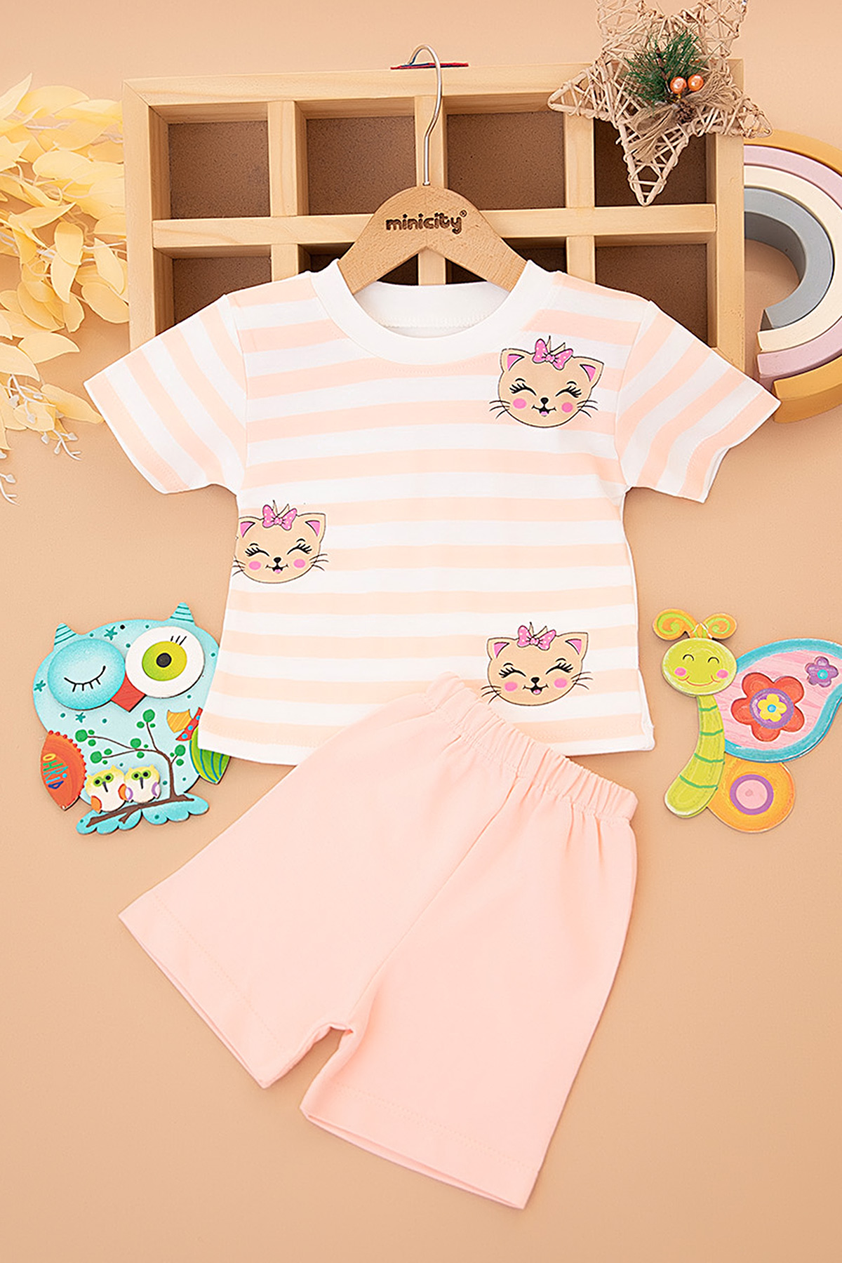 Kız Çocuk Çizgili Kedi Baskılı Şortlu Takım - 3023 (1-3 Yaş)