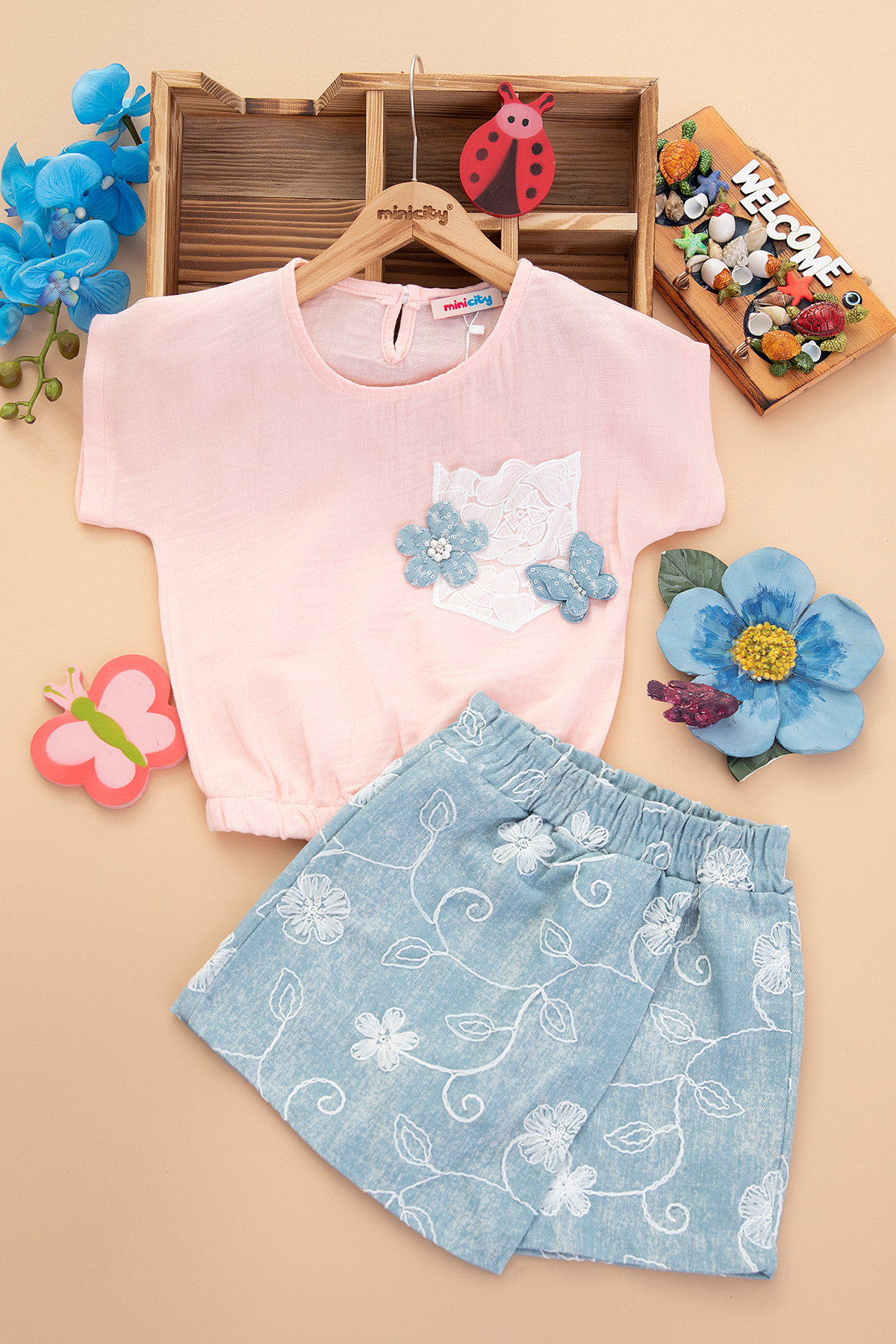 Kız Çocuk Dantel Cep Kot Şort Takım - 209 (5-8 Yaş)