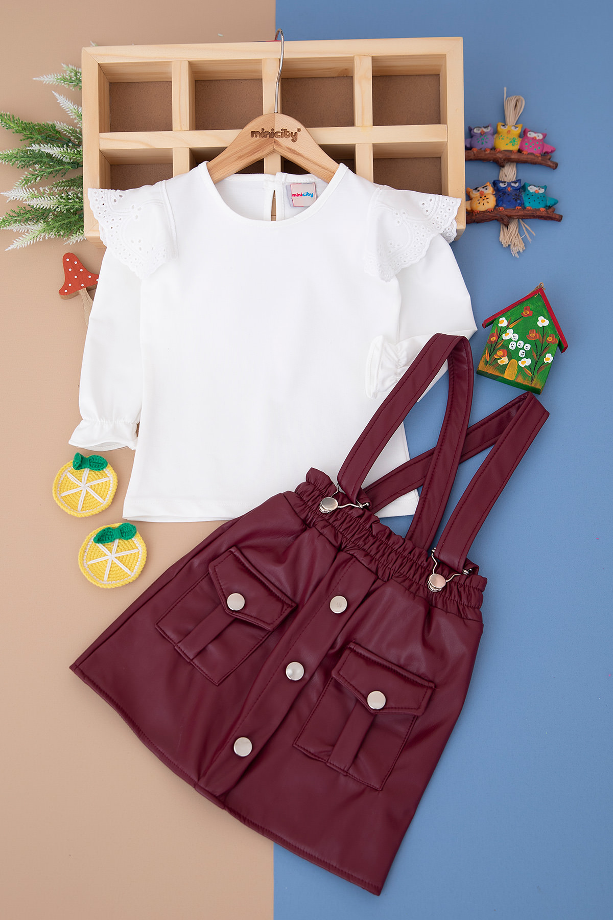 Kız Çocuk Düğmeli Çift Cepli Deri Salopet Takım - 1014 (3-7 Yaş)