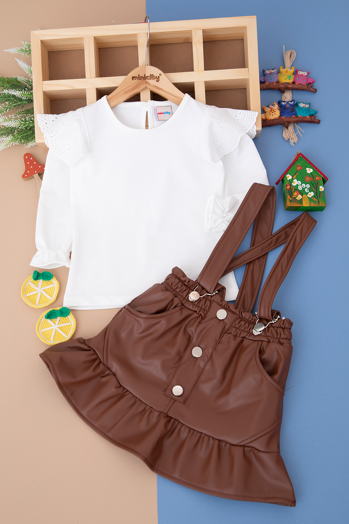 Kız Çocuk Düğmeli Eteği Fırfırlı Deri Salopet Takım - 1011 (8-12 Yaş)