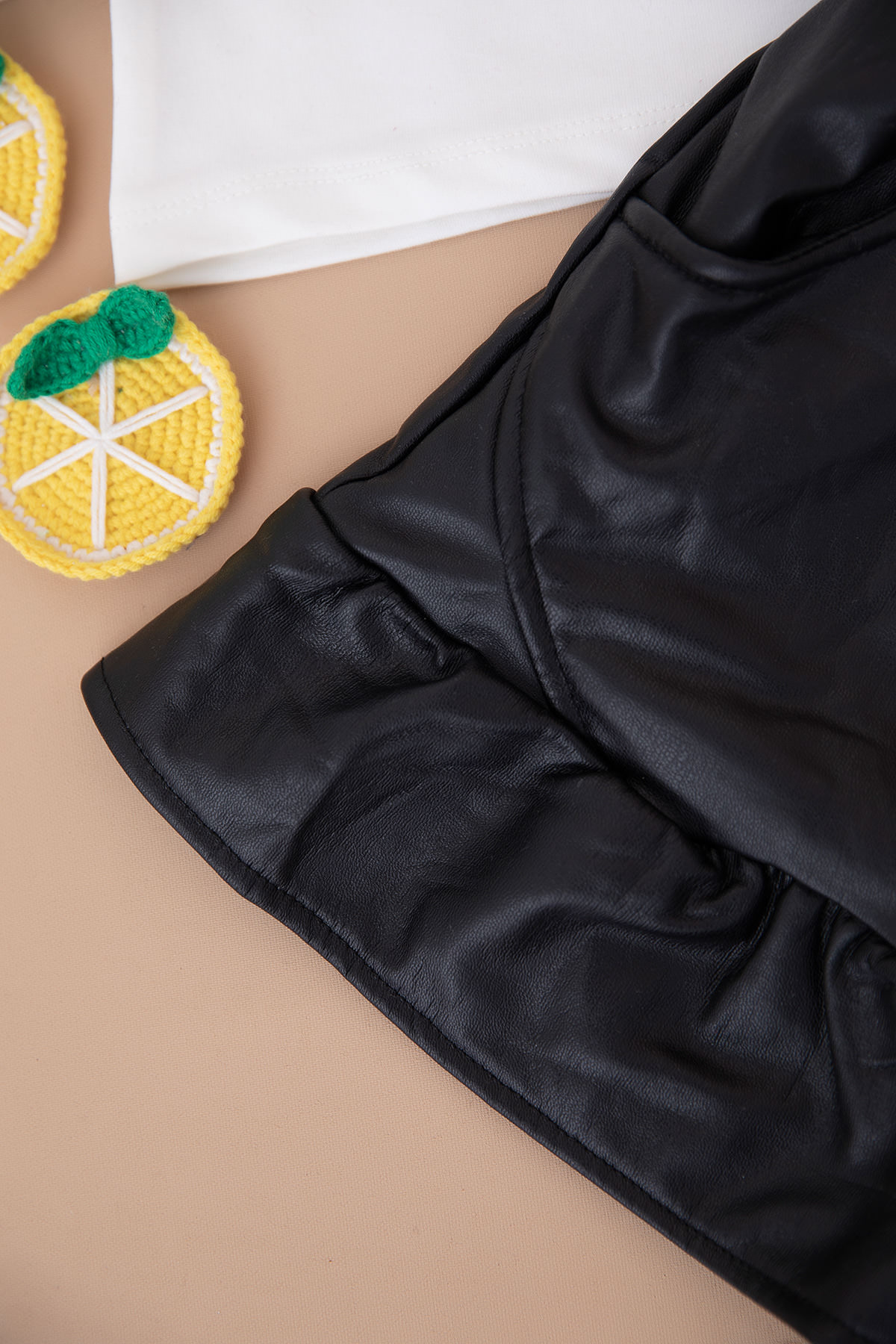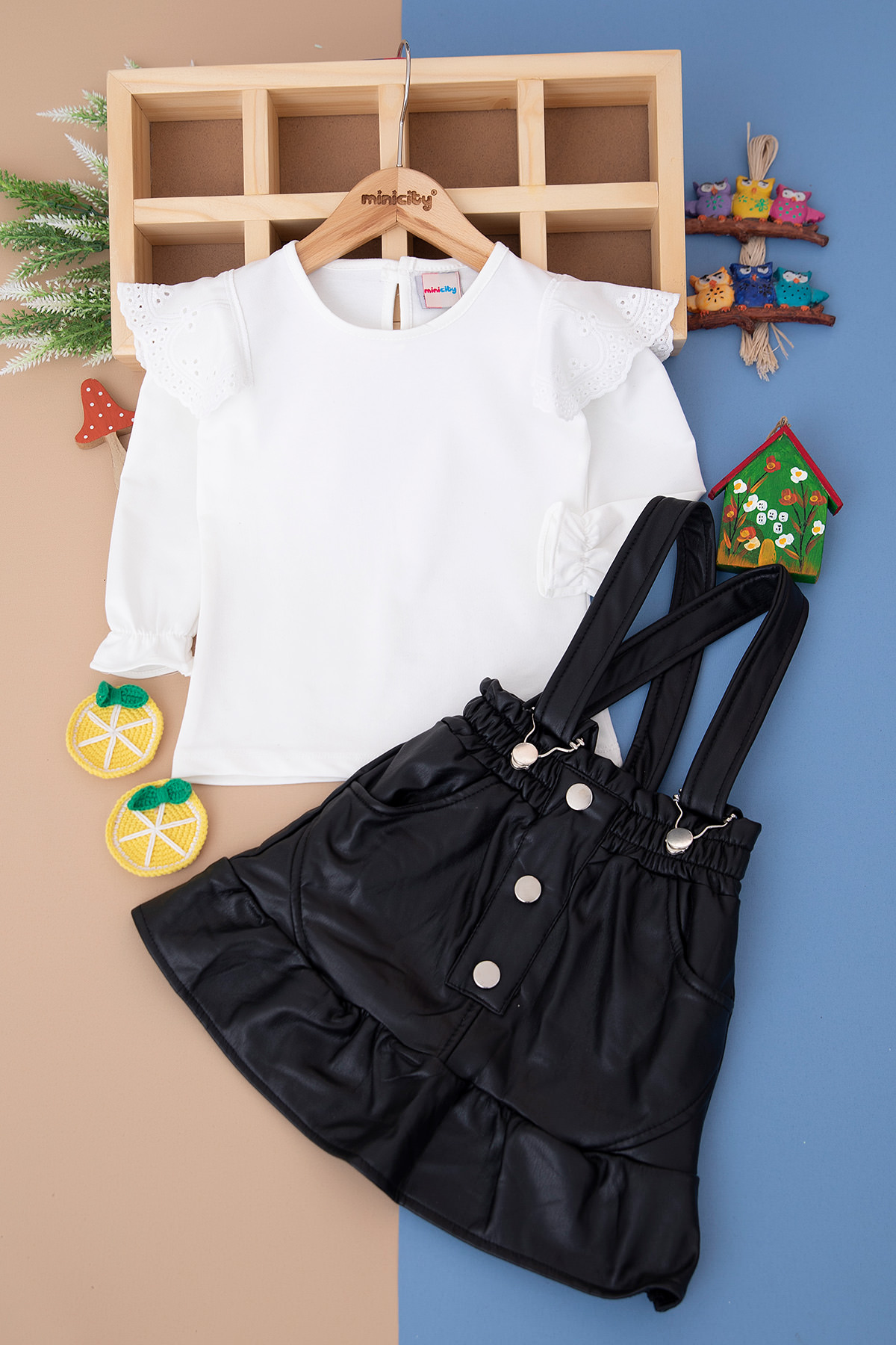 Kız Çocuk Düğmeli Eteği Fırfırlı Deri Salopet Takım - 1011 (8-12 Yaş)