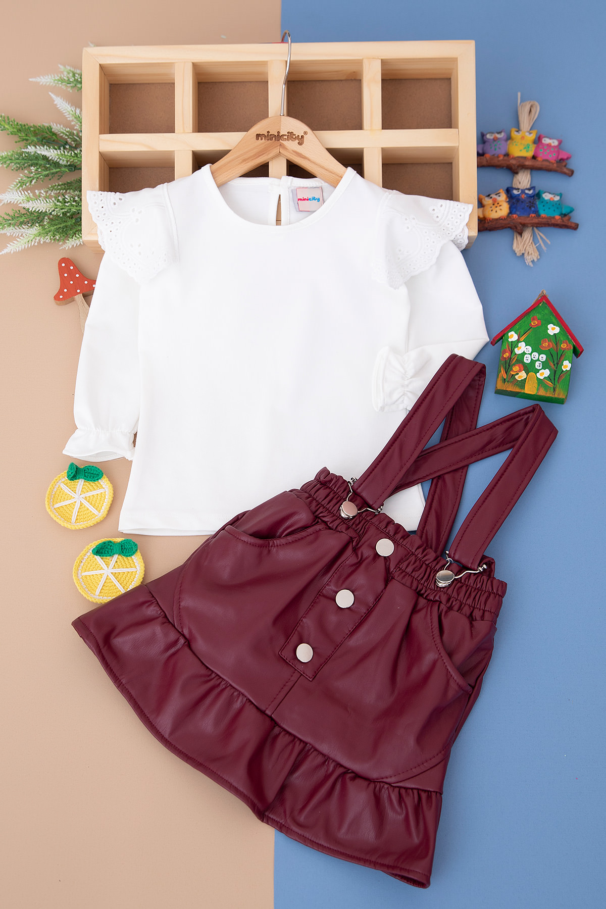 Kız Çocuk Düğmeli Eteği Fırfırlı Deri Salopet Takım - 1011 (8-12 Yaş)