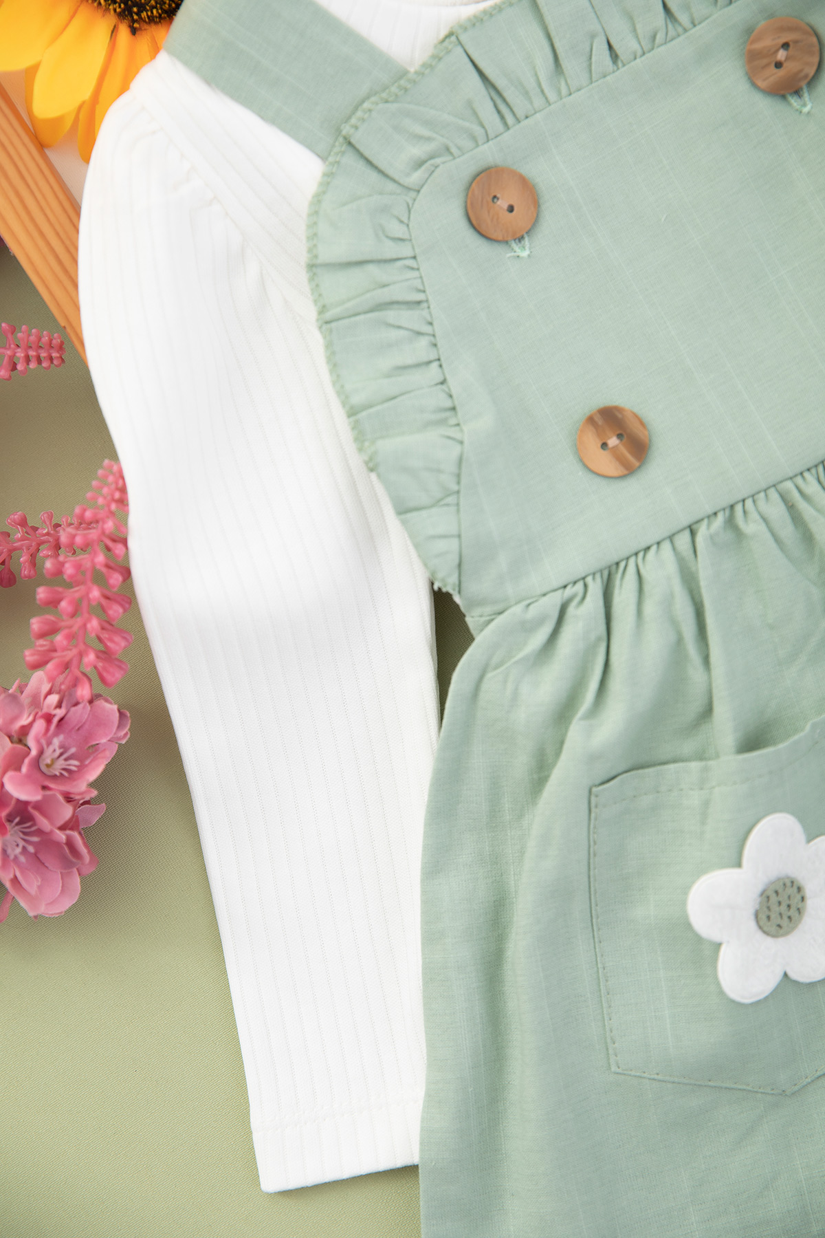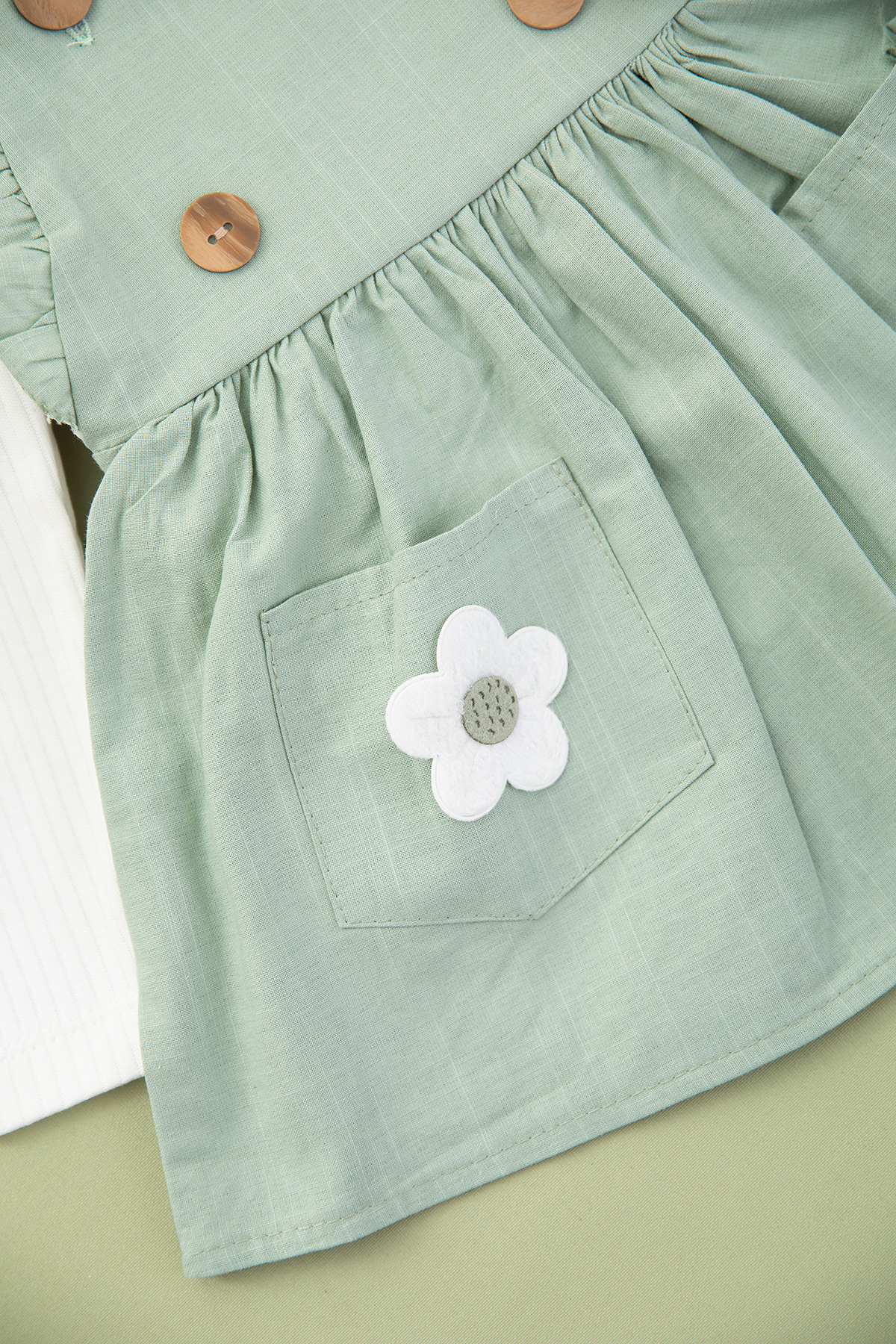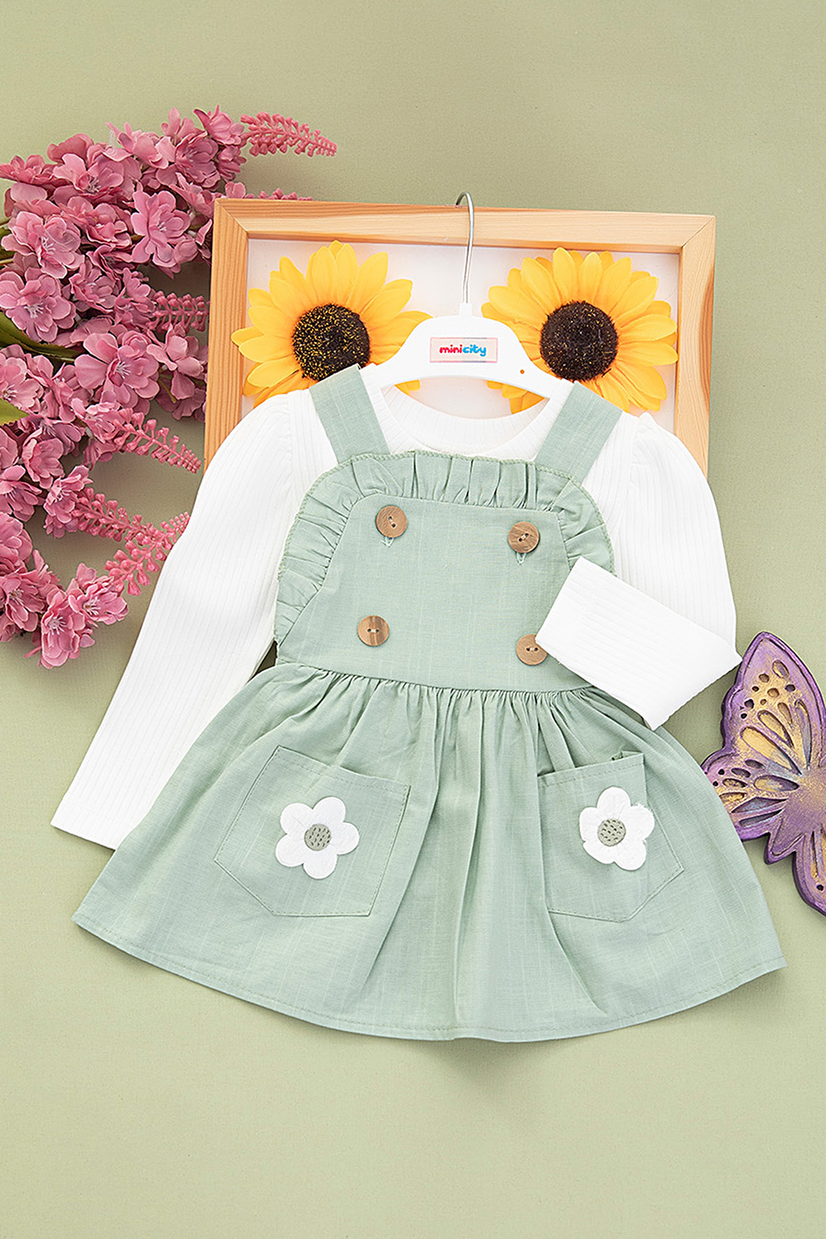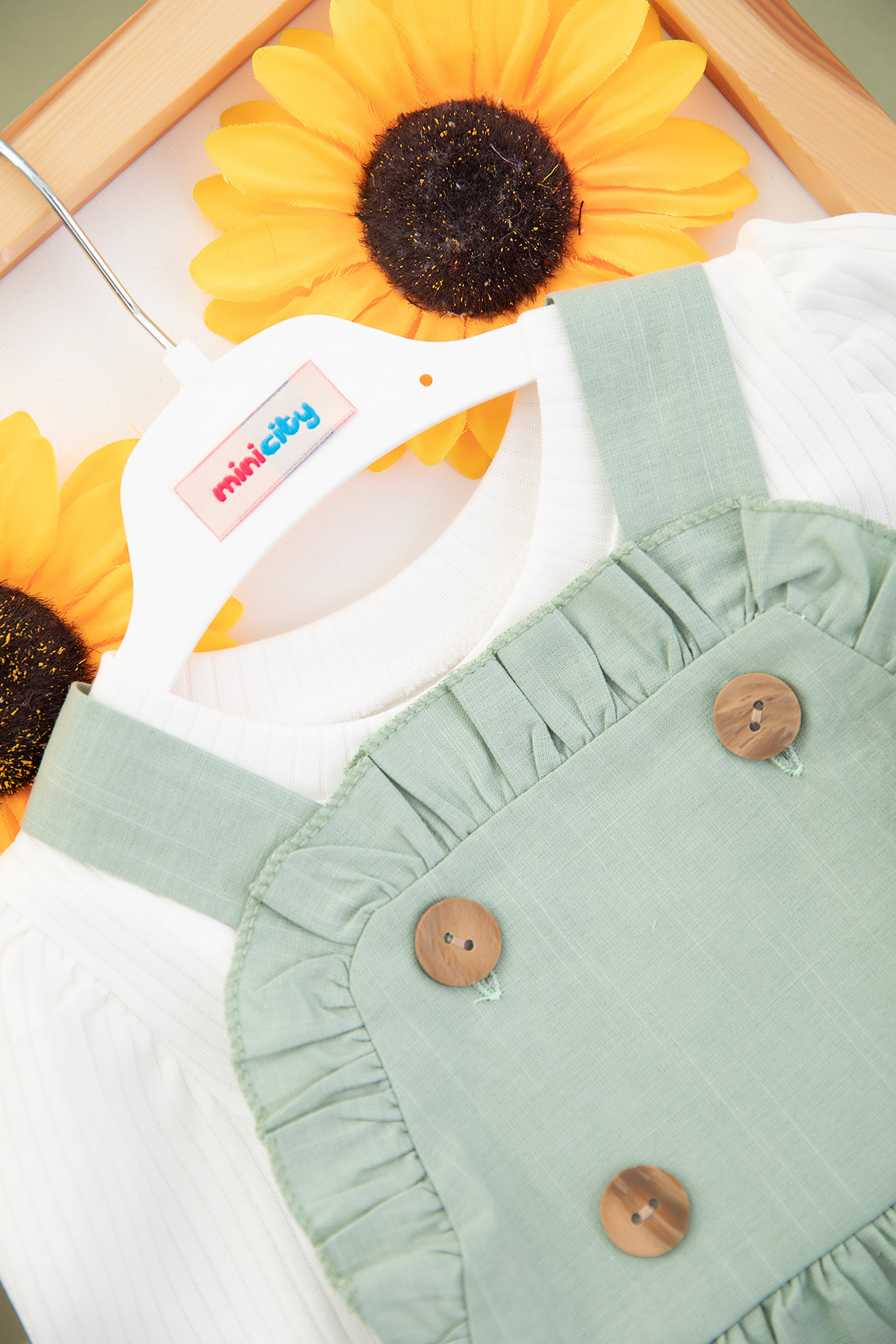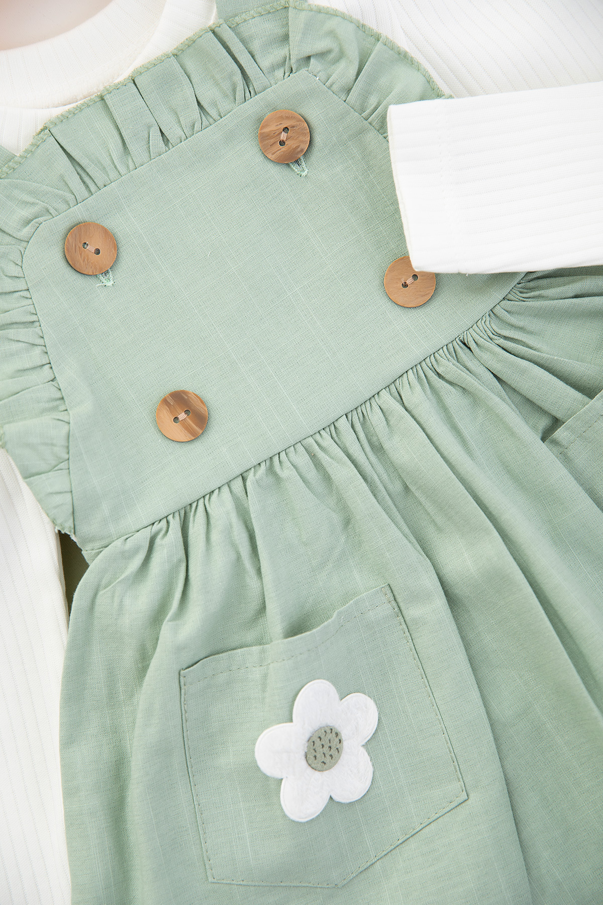 Kız Çocuk Düğmeli Keten Badi Salopet Takım - 5064 (2-5 Yaş)