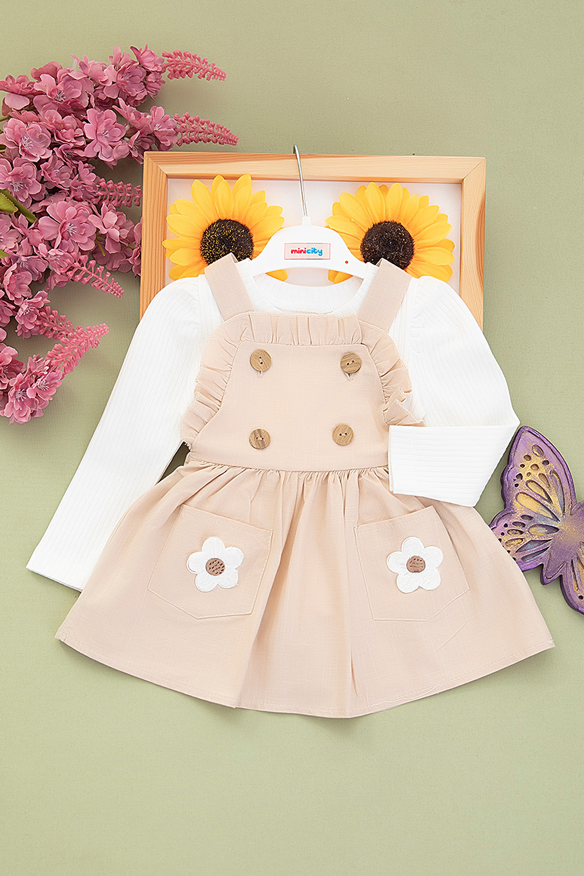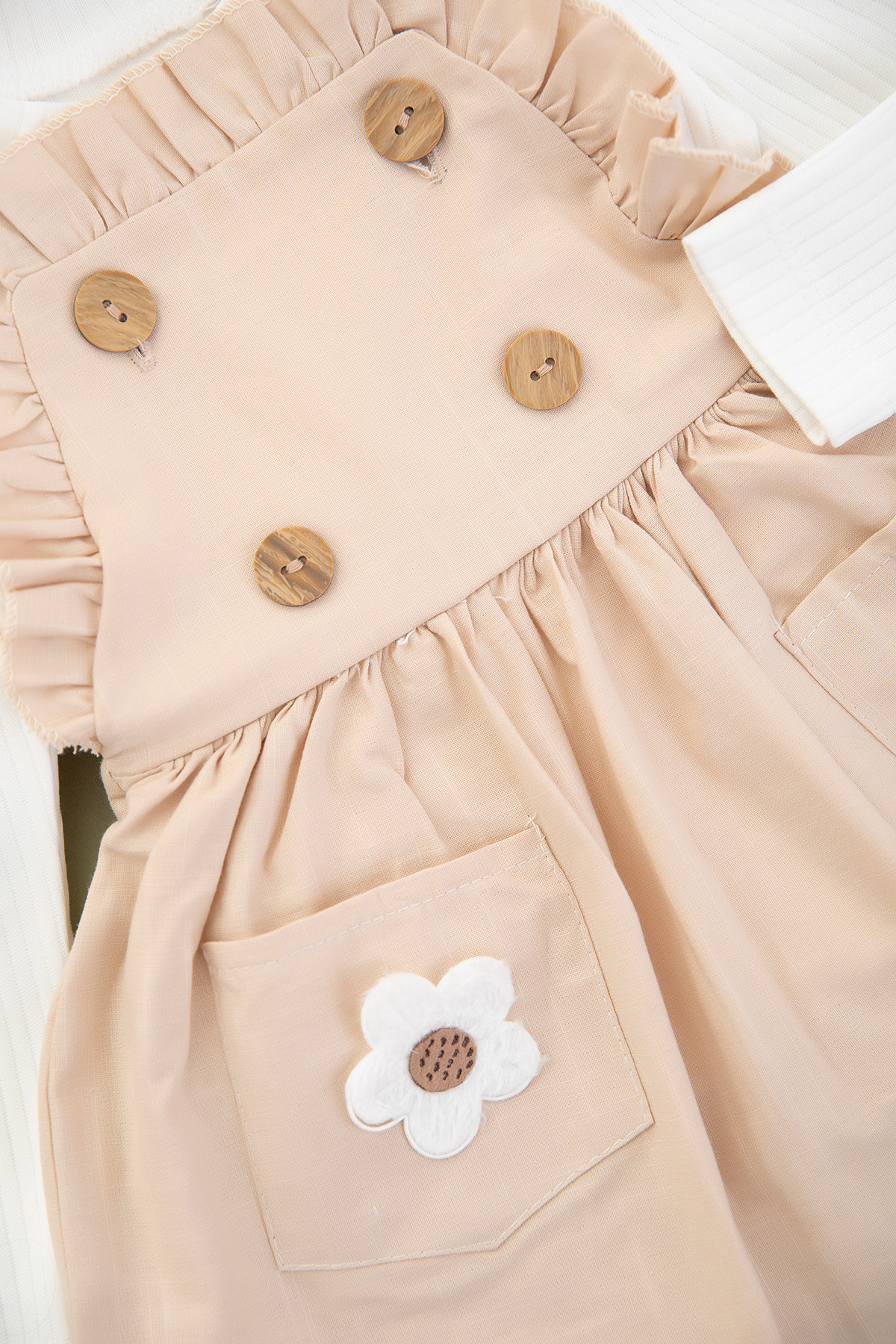 Kız Çocuk Düğmeli Keten Badi Salopet Takım - 5064 (2-5 Yaş)