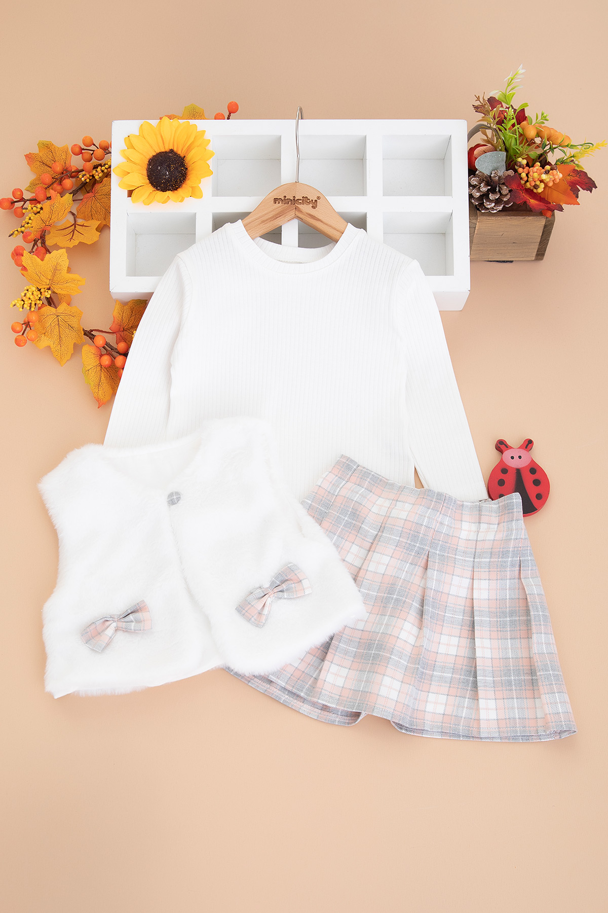 Kız Çocuk Ekose Şort Etekli Peluşlu Takım - 5150 (2-5 Yaş)