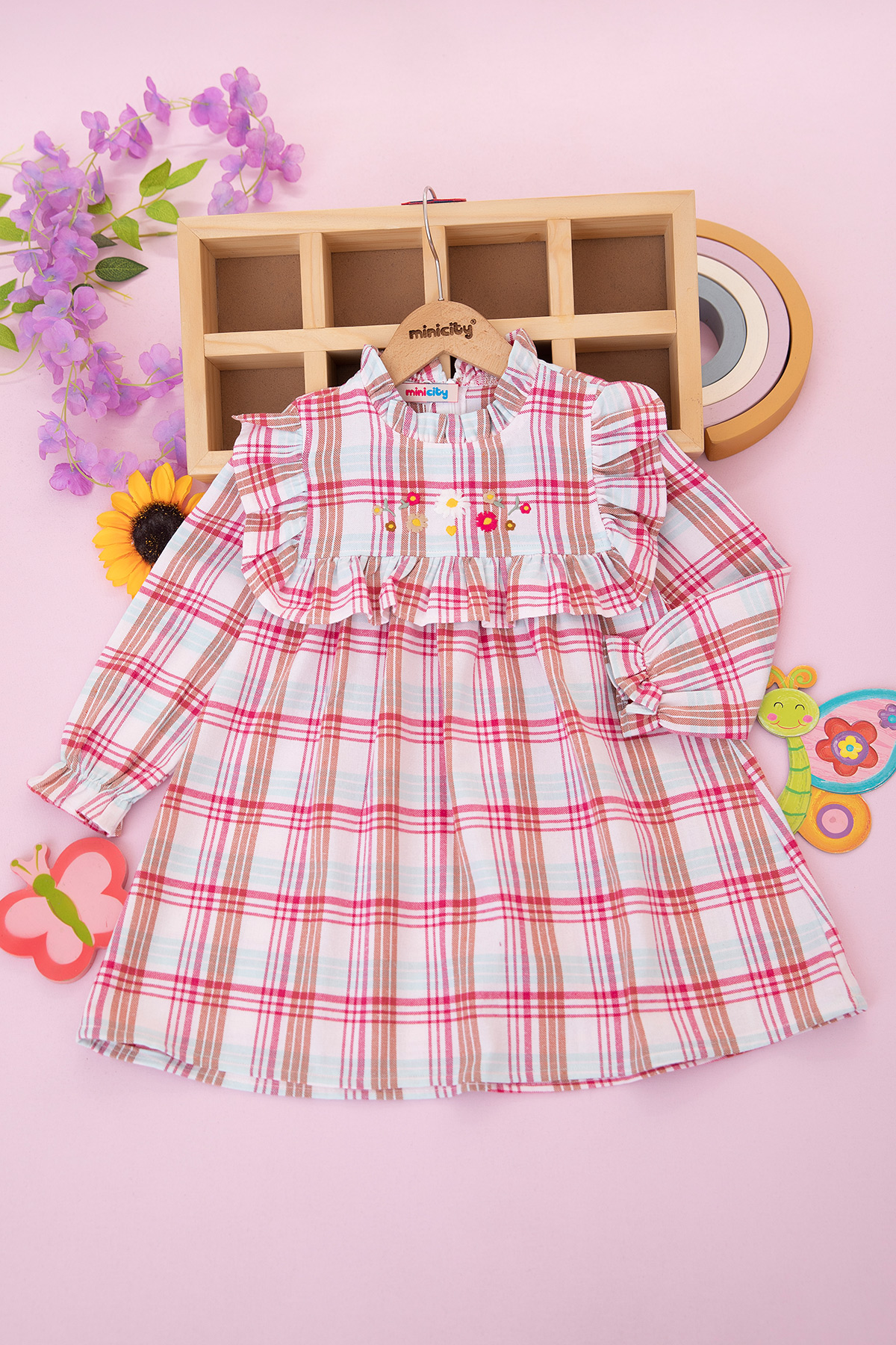 Kız Çocuk Fırfırlı Çiçek Nakışlı Elbise - 1565 (4-7 Yaş)