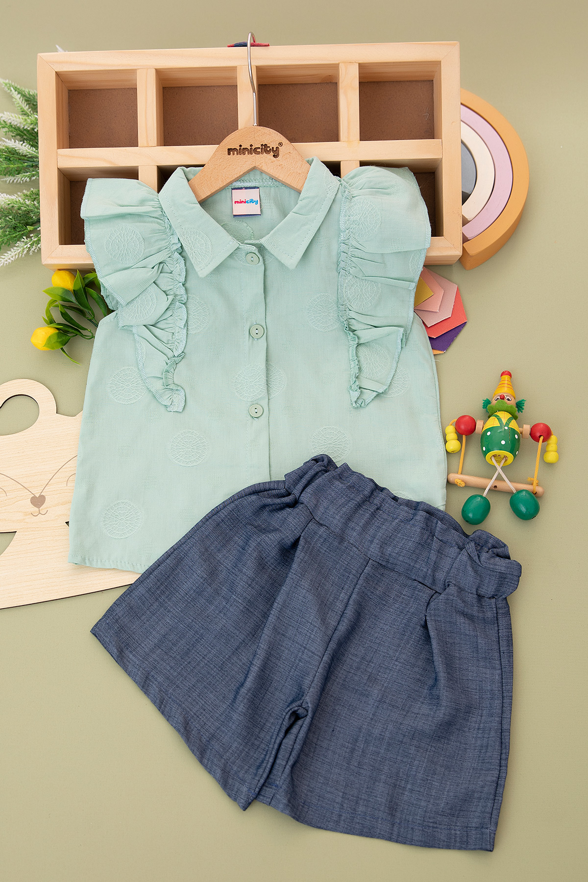 Kız Çocuk Fırfırlı Gömlek Jakar Şortlu Takım - 24313 (3-6 Yaş)